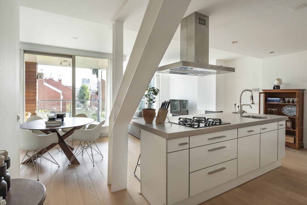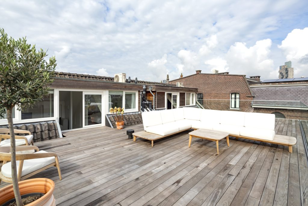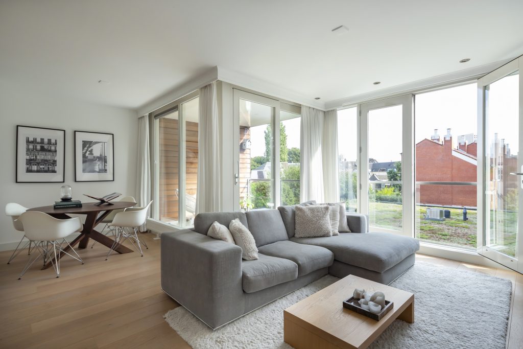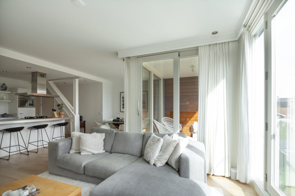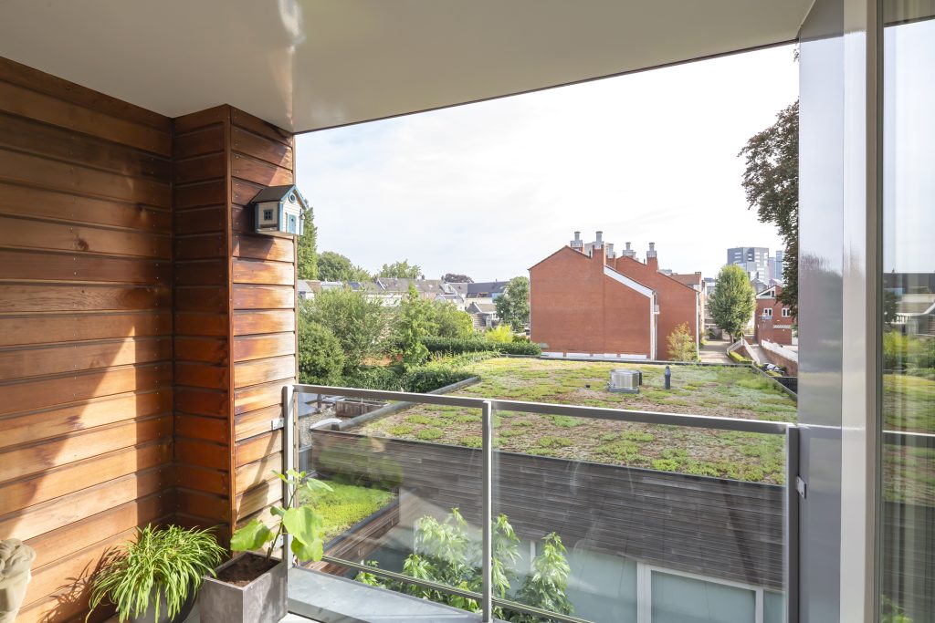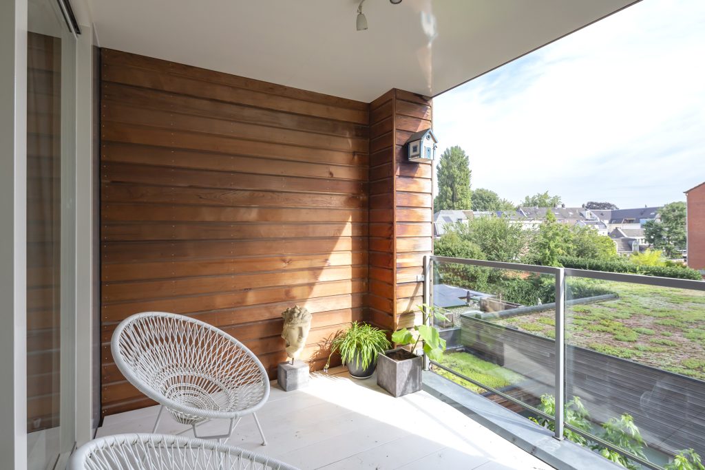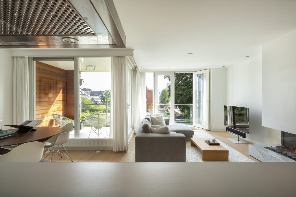 De zeer lichte woonkamer beschikt over grote raampartijen welke zorgen voor veel lichtinval. Naast een Frans balkon met openslaande deuren vindt u hier ook het inpandige balkon. Zelfs het balkon (ca. 7 m²) is smaakvol afgewerkt met hout en toegankelijk via een schuifpui. Doordat het balkon inpandig is, kunt u er nagenoeg het gehele jaar van genieten.