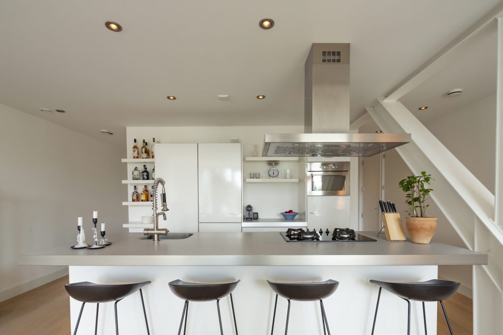 De luxe keuken is voorzien van een strak keukenblok. Daarnaast vindt u hier een riante kastenwand. De keuken is voorzien van werkelijk alle gemakken. Zo vindt u hier een gaskookplaat, RVS afzuigkap, combi-oven, koelkast, RVS spoelbak met RVS mengkraan, vriezer, vaatwasser en voldoende opbergmogelijkheden. Daarnaast zijn er in het plafond inbouwspots verwerkt. De keuken staat in een half open verbinding met de woonkamer en is voorzien van een bar aan de kant van de woonkamer.