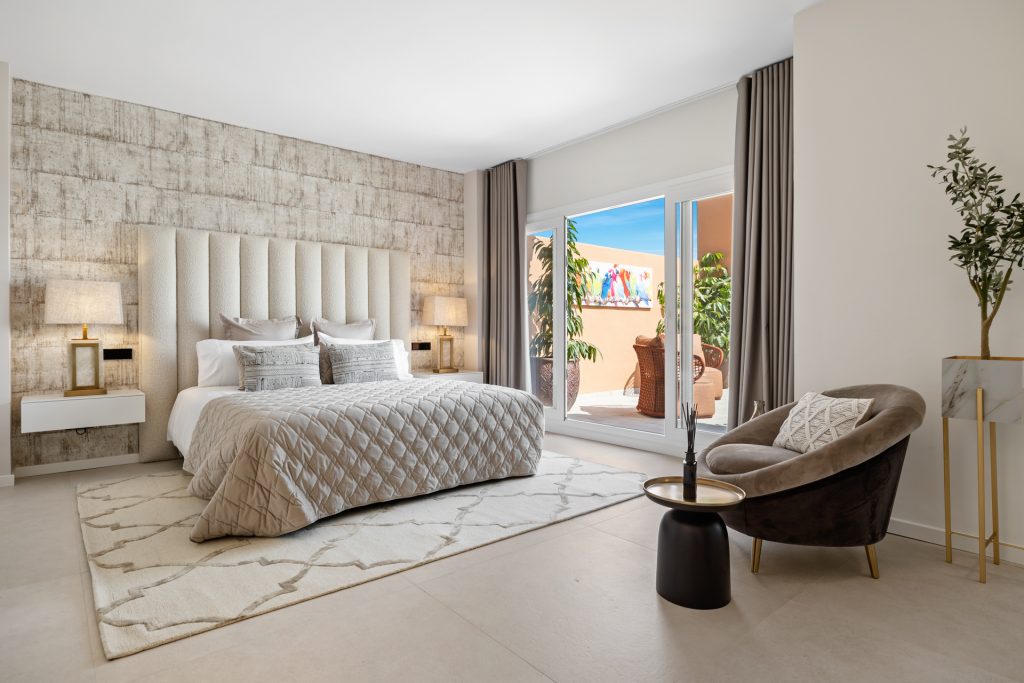 Op de bovenverdieping bevindt zich de hoofdslaapkamer en suite, compleet met een kleedruimte. Daarnaast is er een terras om te relaxen met een barbecue en jacuzzi om te genieten van het prachtige uitzicht. Het penthouse is voorzien van airconditioning met verwarming en heeft vloerverwarming overal. Een garage en opslagruimte zijn inbegrepen, en er is voldoende parkeergelegenheid binnen het complex.
