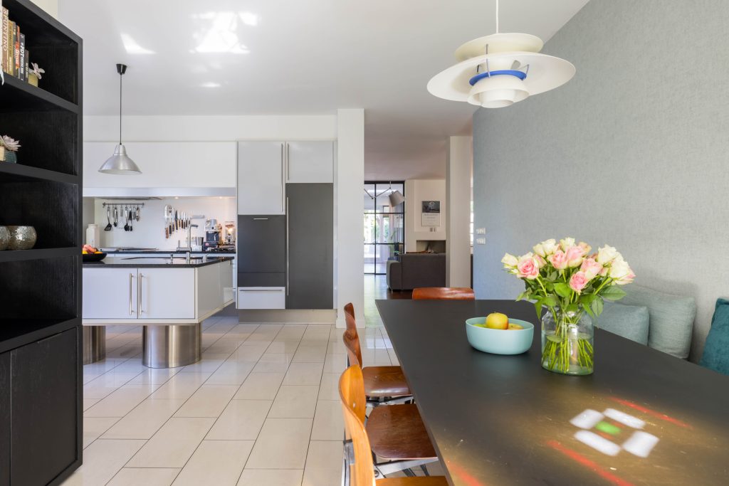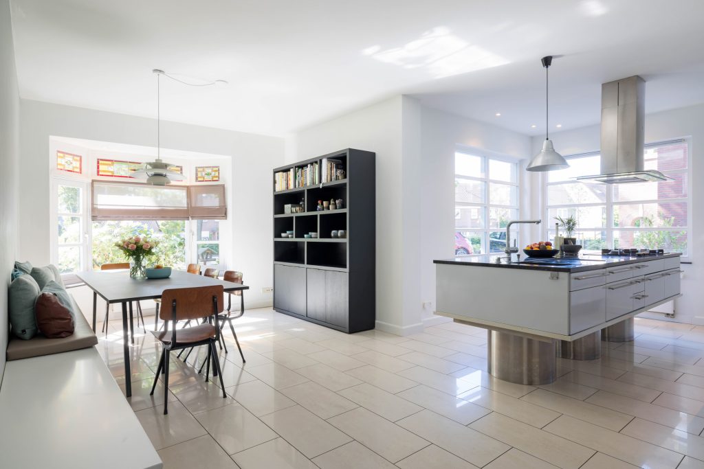 In de keuken trekt de moderne Siematic keukenopstelling (2002) met groot eiland direct de aandacht. Graniet is gecombineerd met rvs en de inbouwapparatuur van topkwaliteit. Bij het eetgedeelte is een vaste bank gemaakt, die ook als speeltafel voor de kinderen gebruikt kan worden. De erker met glas-in-lood bovenramen toont letterlijk karakter en ook hier is het uitzicht naar de tuin erg fraai.