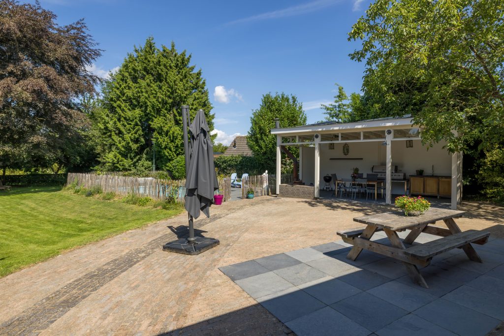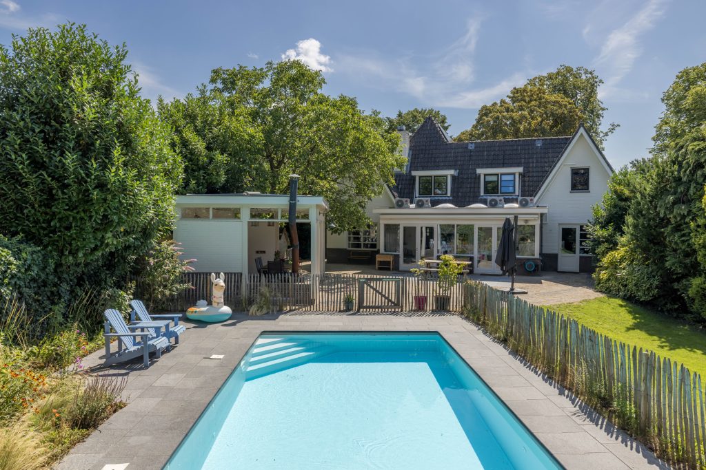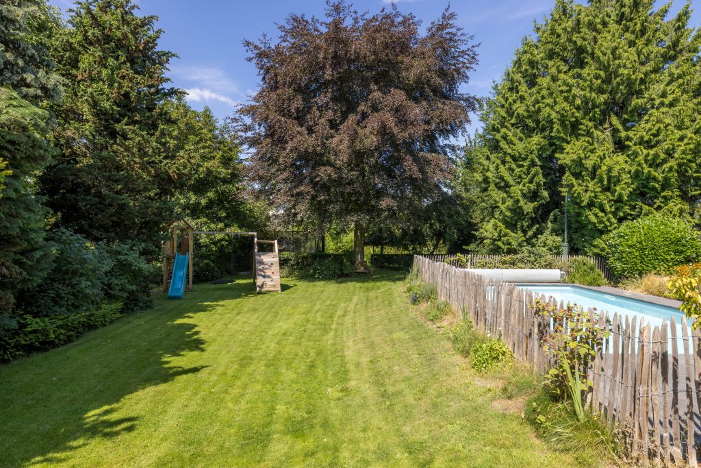 Blikvangers in de achtertuin zijn het verwarmde buitenzwembad, het zonneterras en een overdekt terras met houtkachel. Kinderen hebben ruimte om te spelen en ook aan veiligheid is gedacht, want het terras bij het zwembad is omheind.