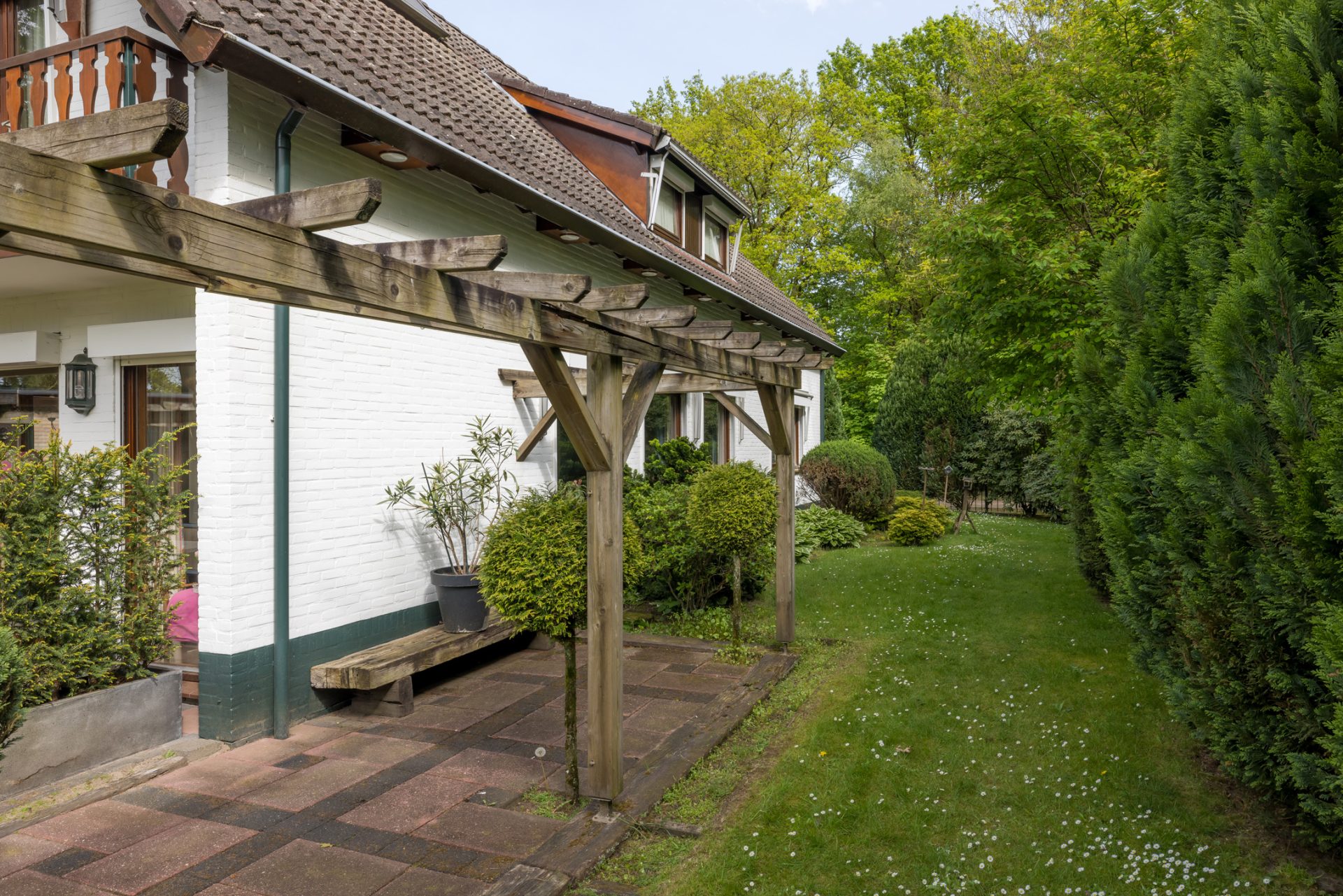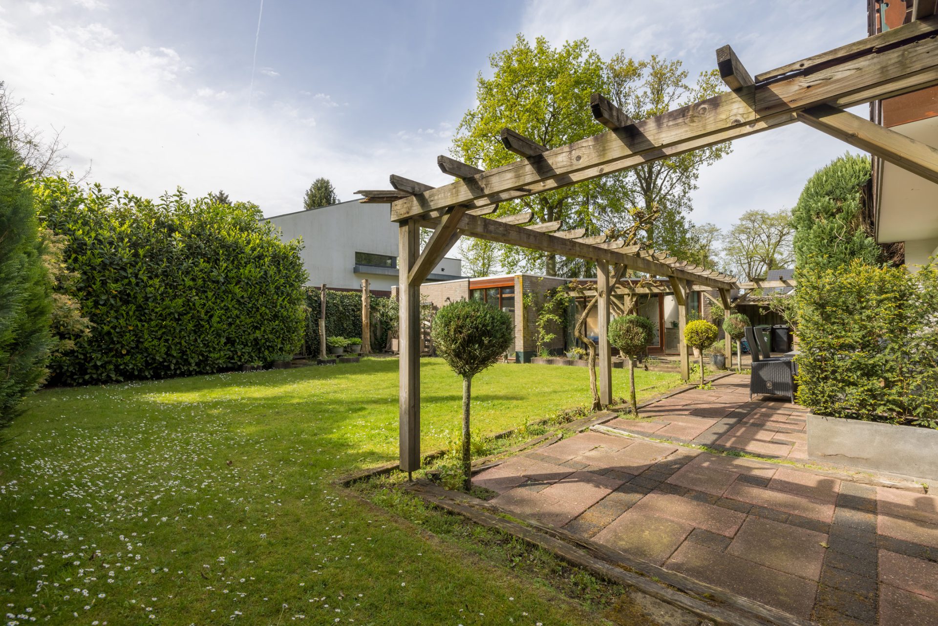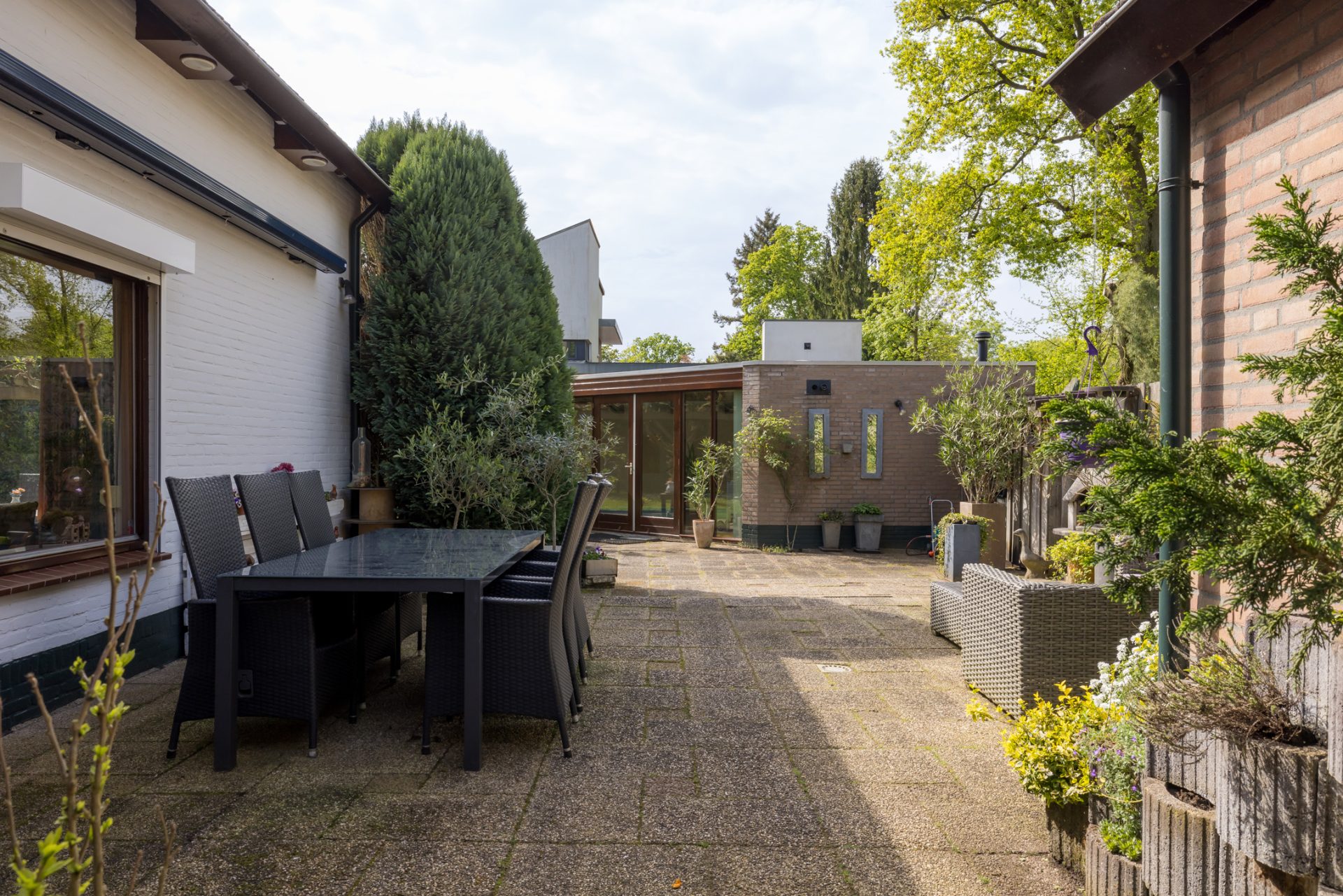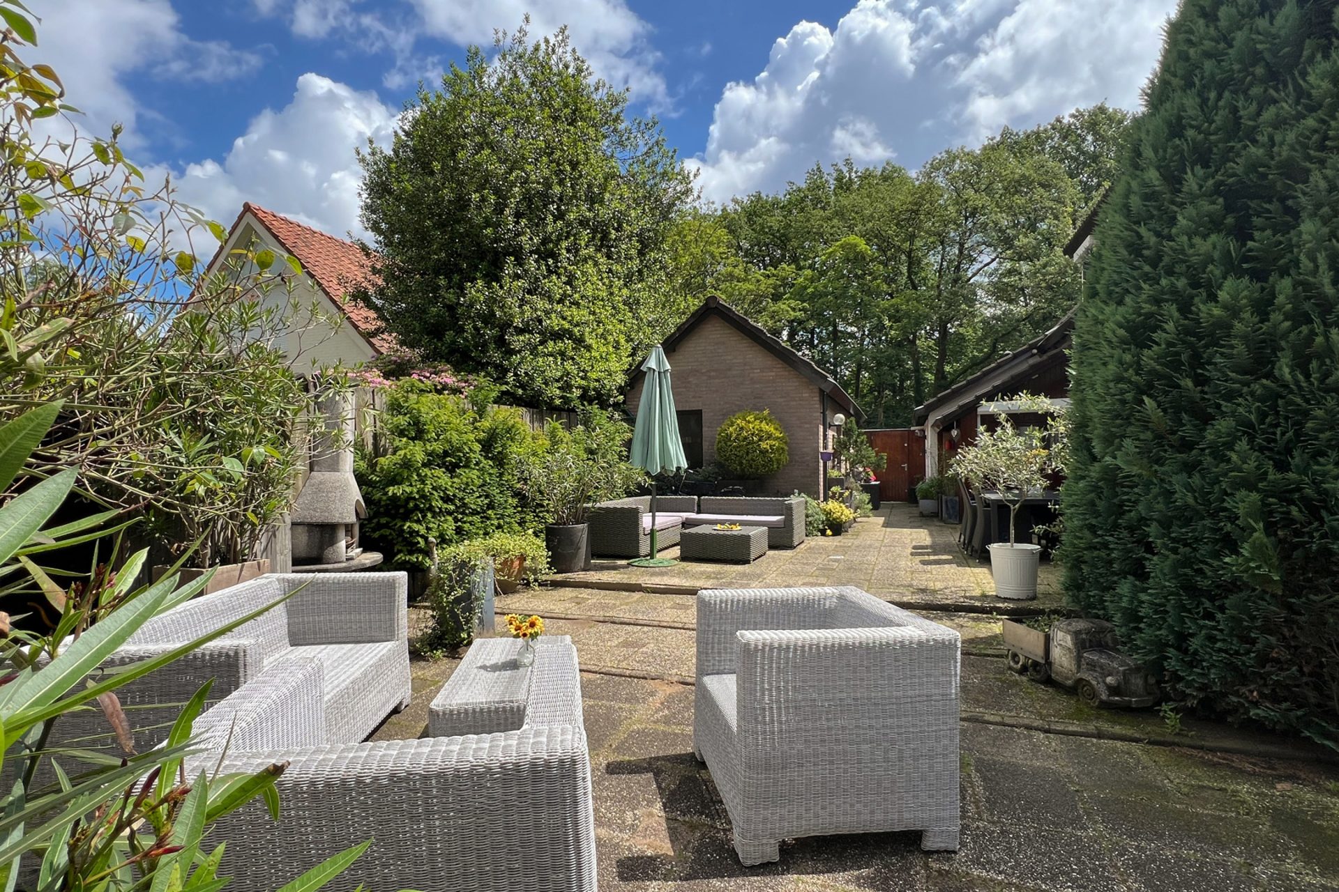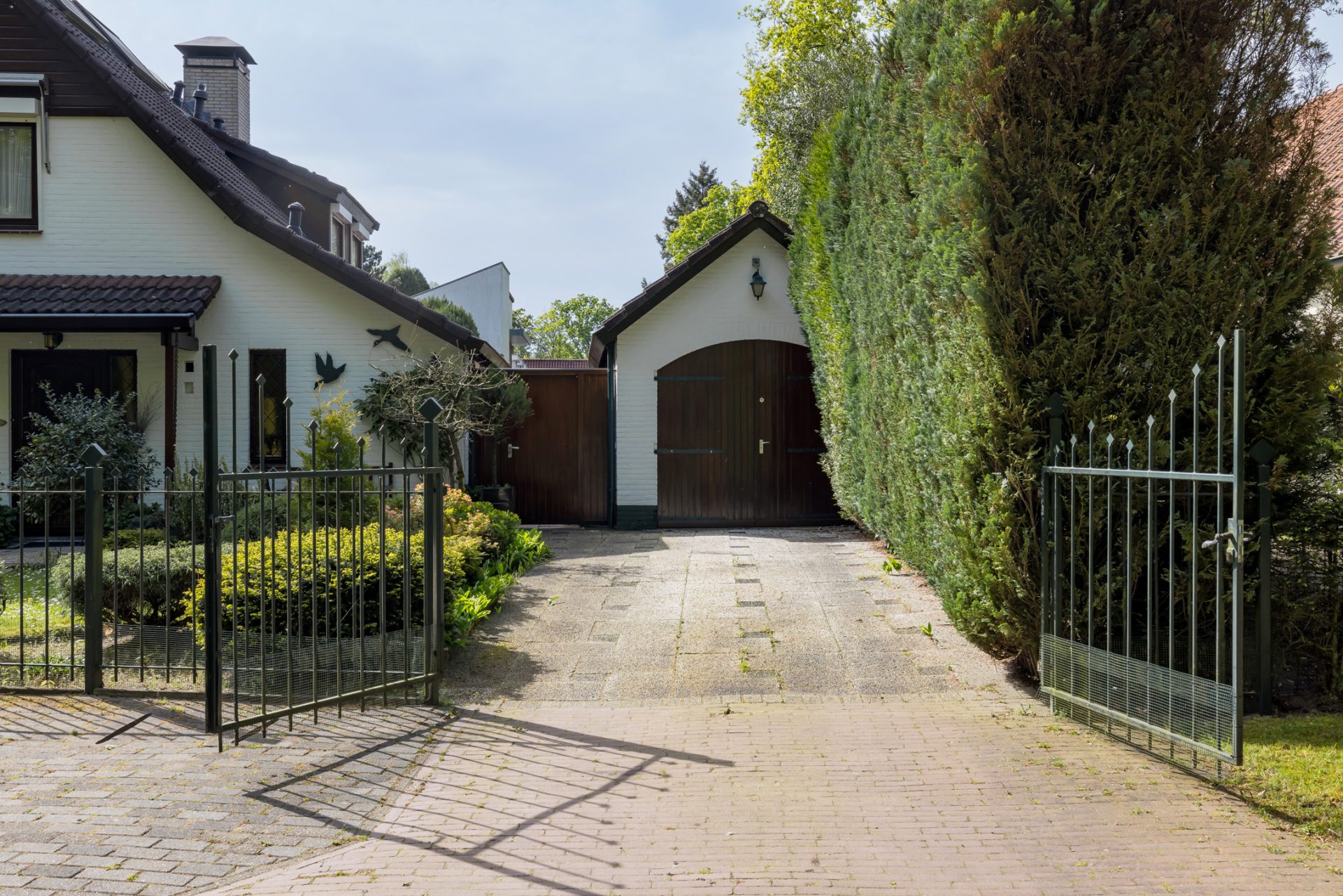 Rechts van de villa staat een meer dan 8 meter lange garage/berging, met een oprit aan de straatzijde waar meerdere auto’s kunnen staan. In een van de hoeken van het perceel staat het tweede bijgebouw van ruim 70 m2, dat ruimte biedt aan het zwembad met een toilet-/douchegelegenheid.