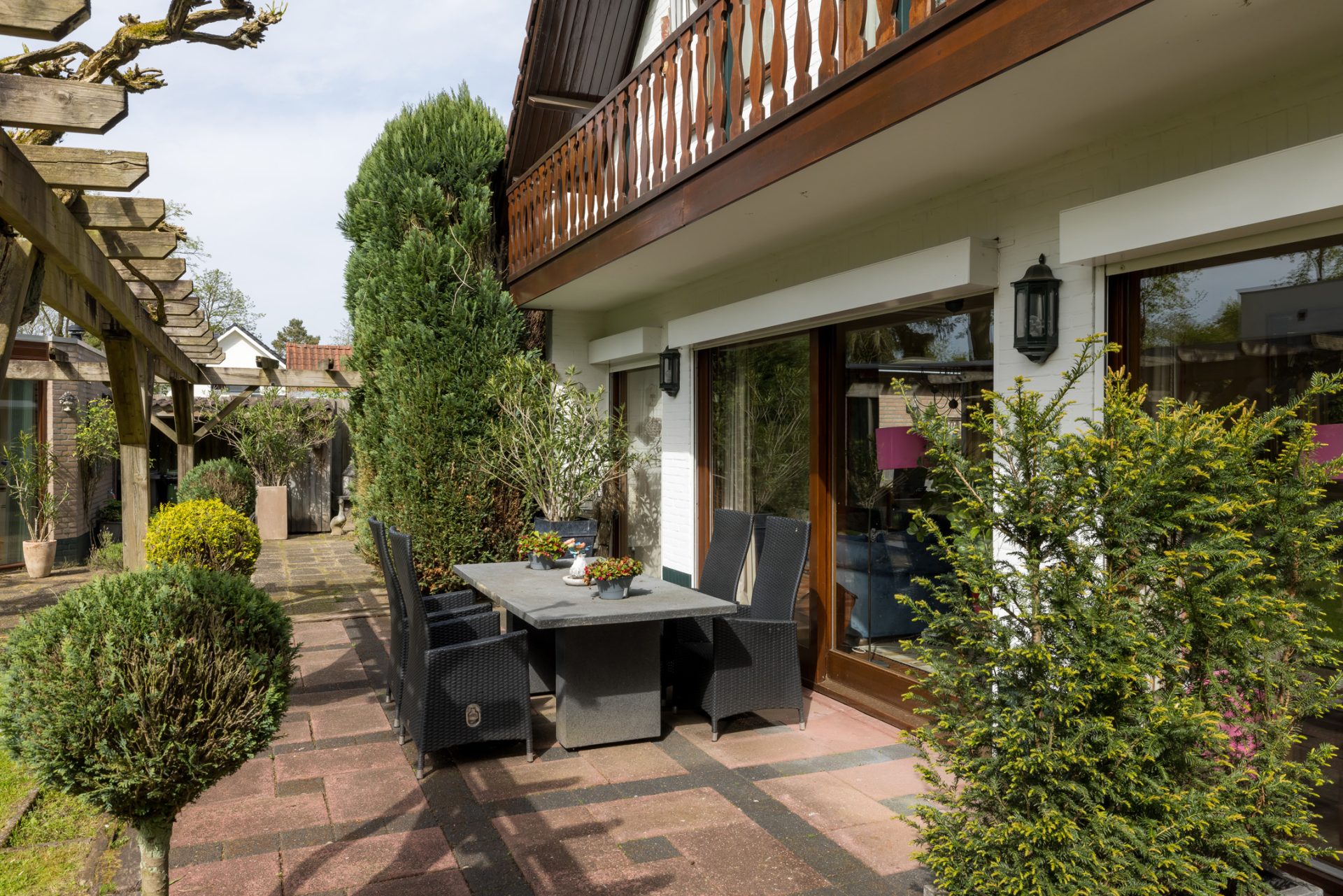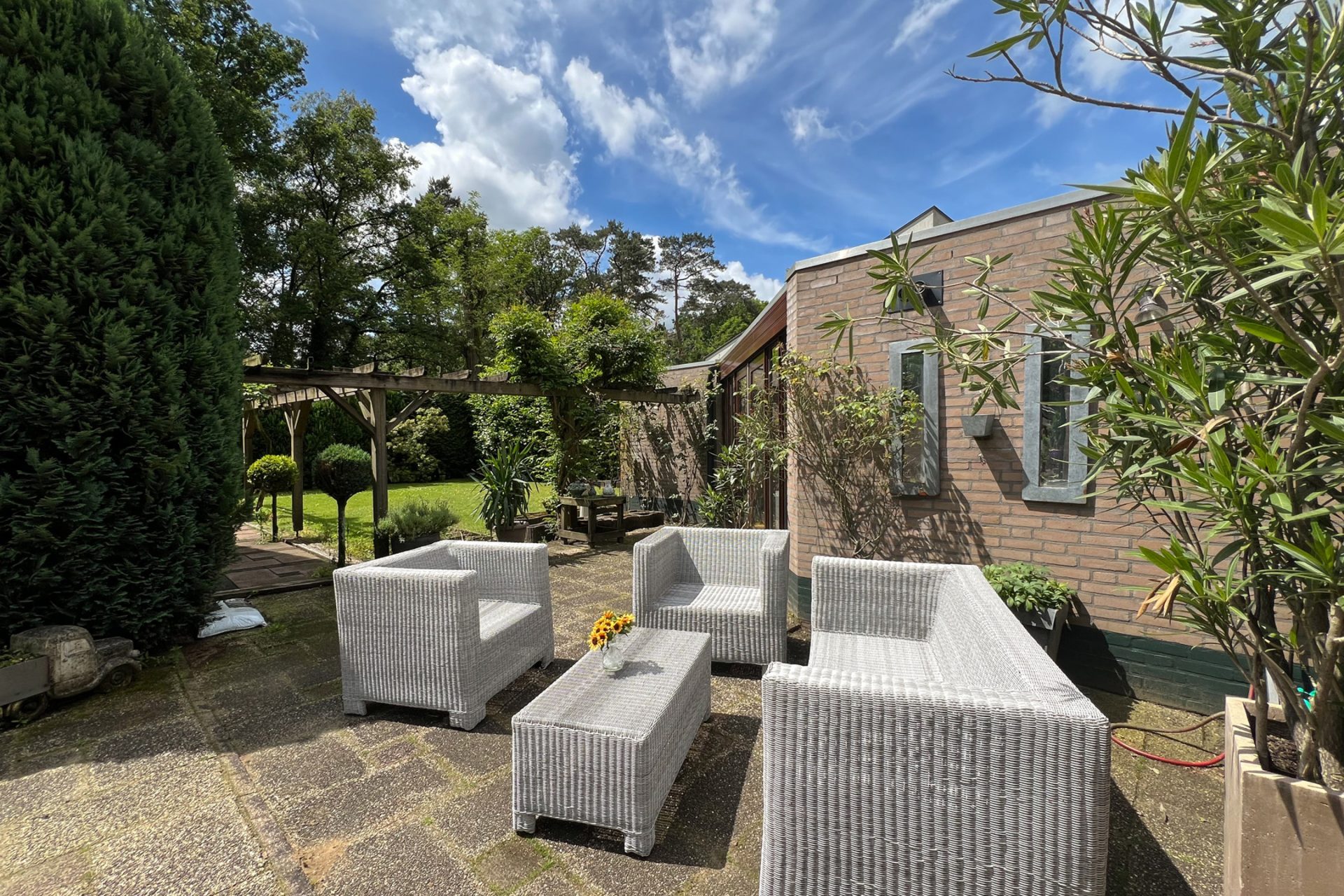 De villa wordt omringd door een goed onderhouden tuin met een grote variatie aan beplanting. Het merendeel van de tuin bevindt zich aan de zuid- en westkant, met een groot terras aan de achterzijde. Aan de koele noordkant, links van de villa, is het tweede terras met een aangename schaduwplek op het warmste moment van de dag.