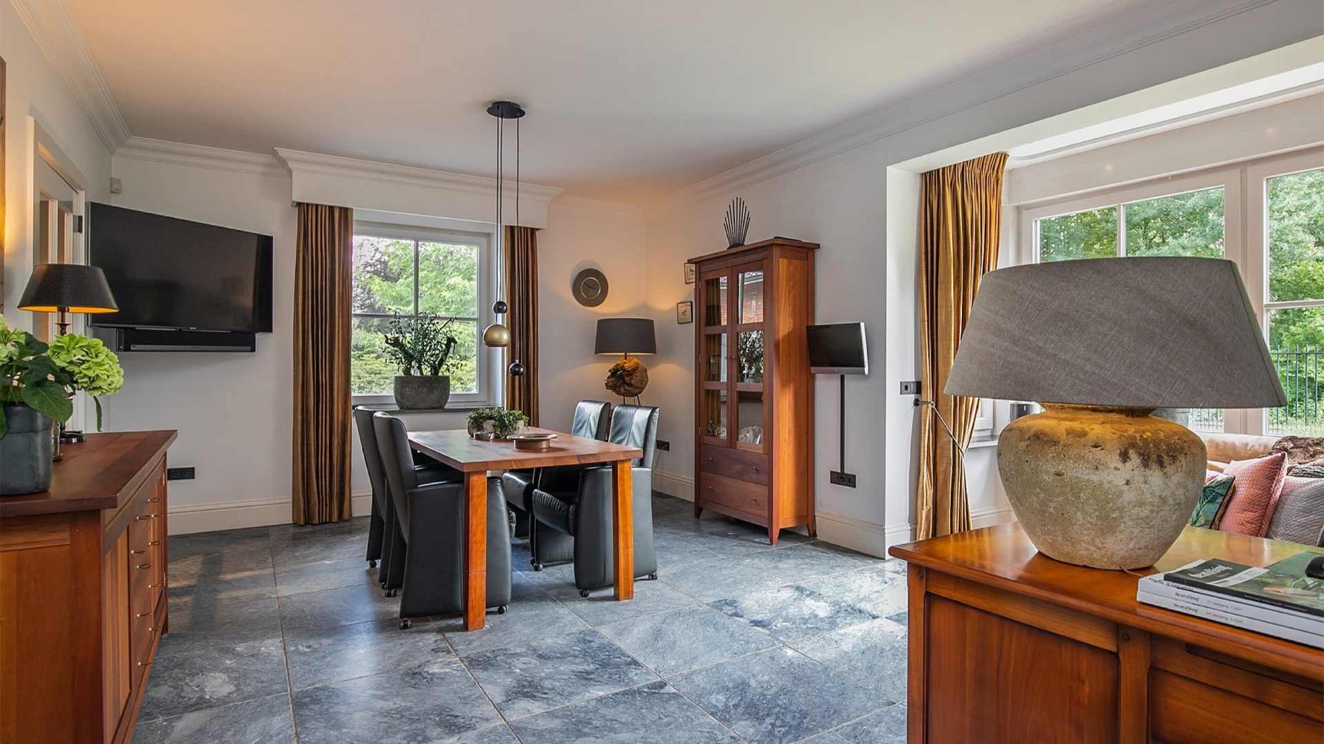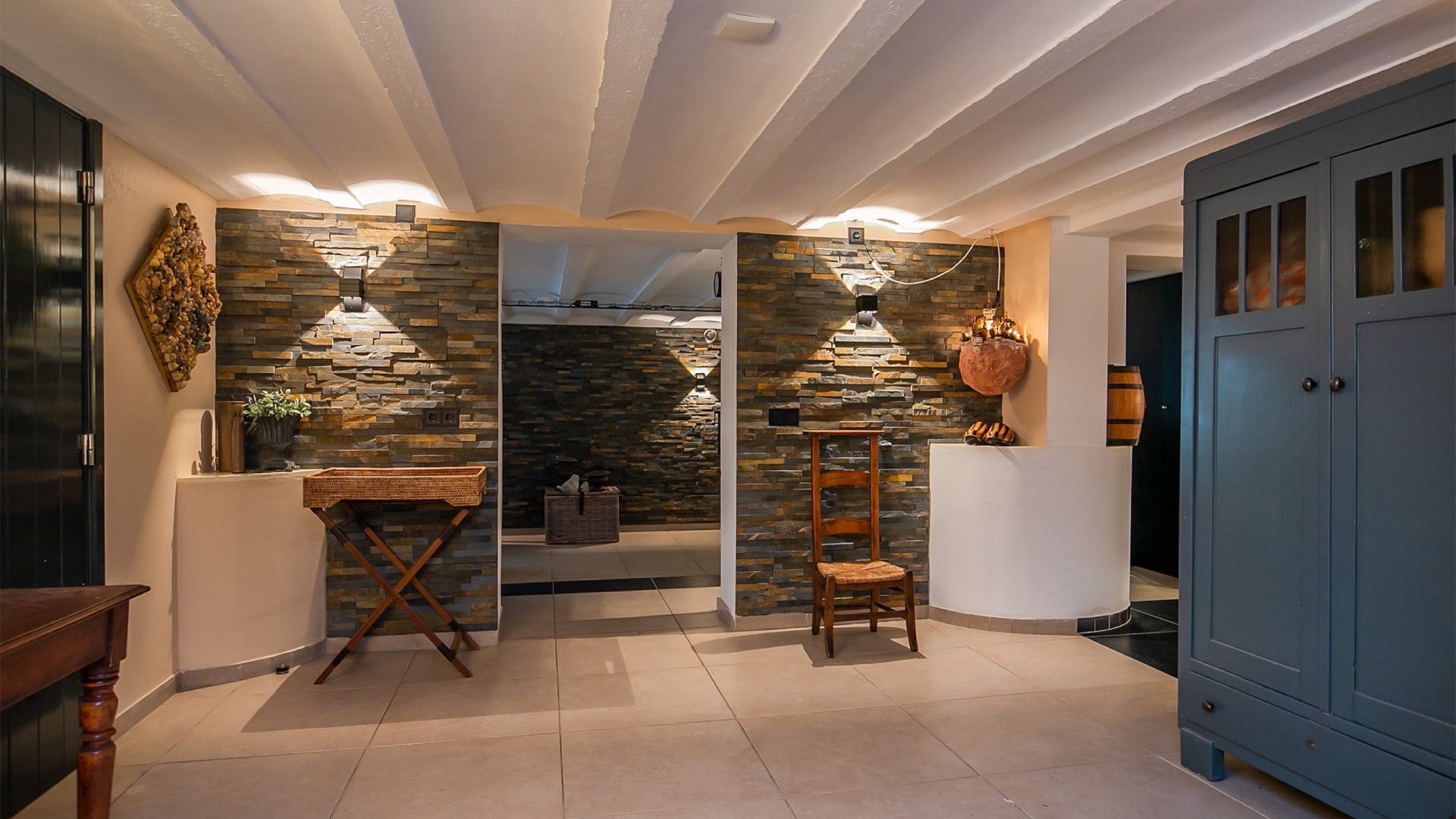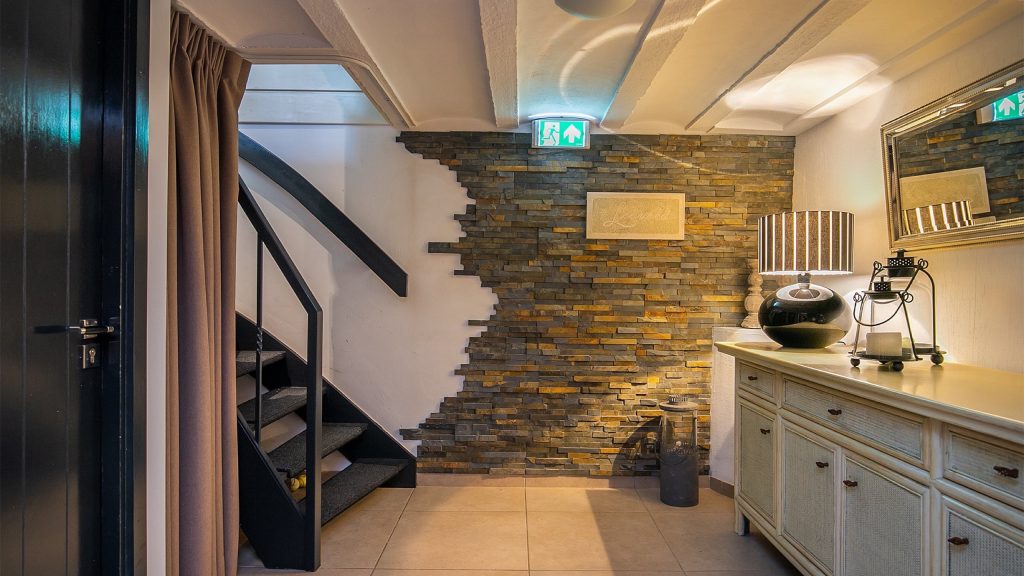 De living, vestibule en werkkamer zijn voorzien van een prachtige natuurstenen vloer met vloerverwarming. De meeste ruimtes zijn daarnaast voorzien van strak stucwerk wand- en plafondafwerking.