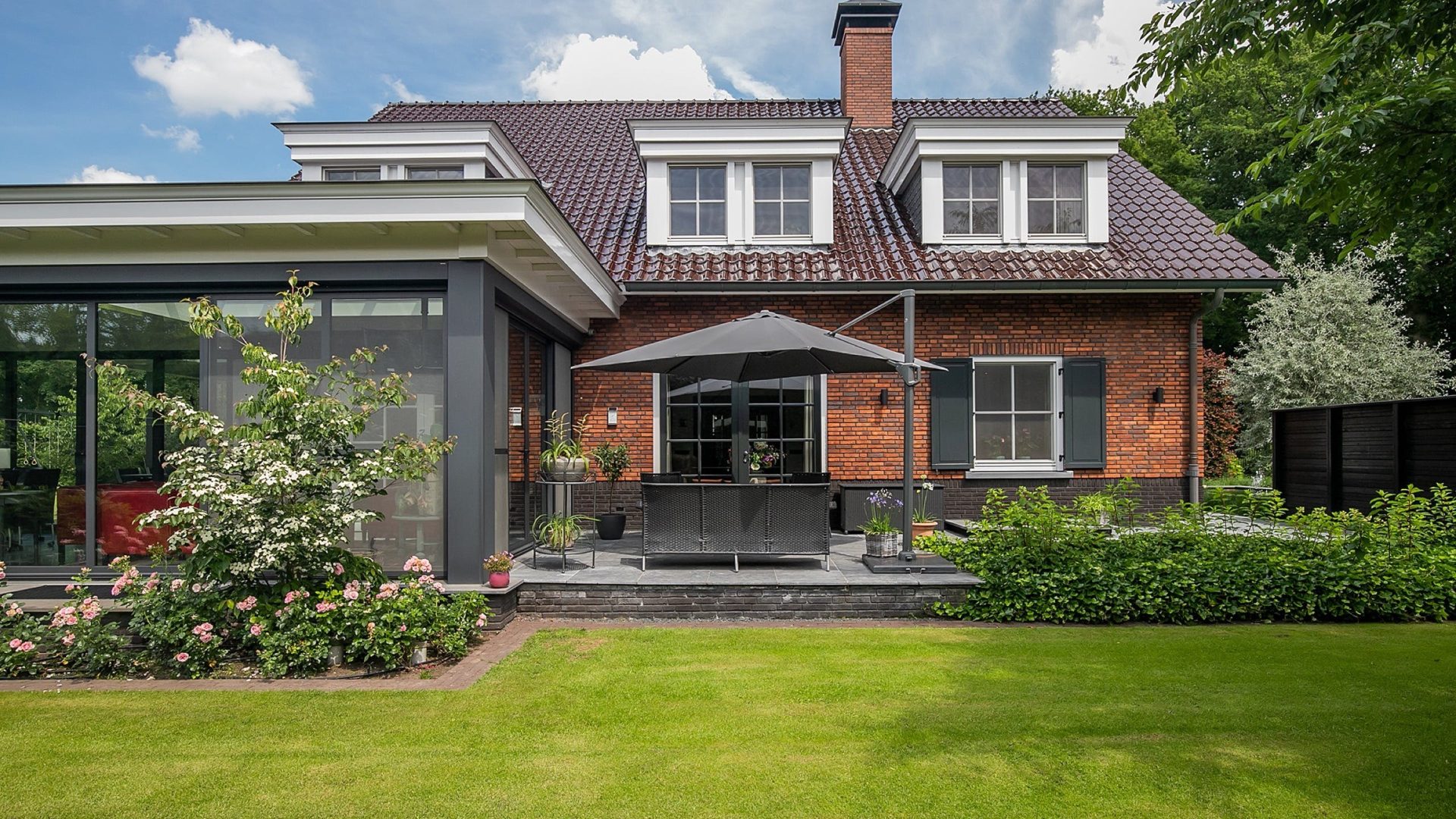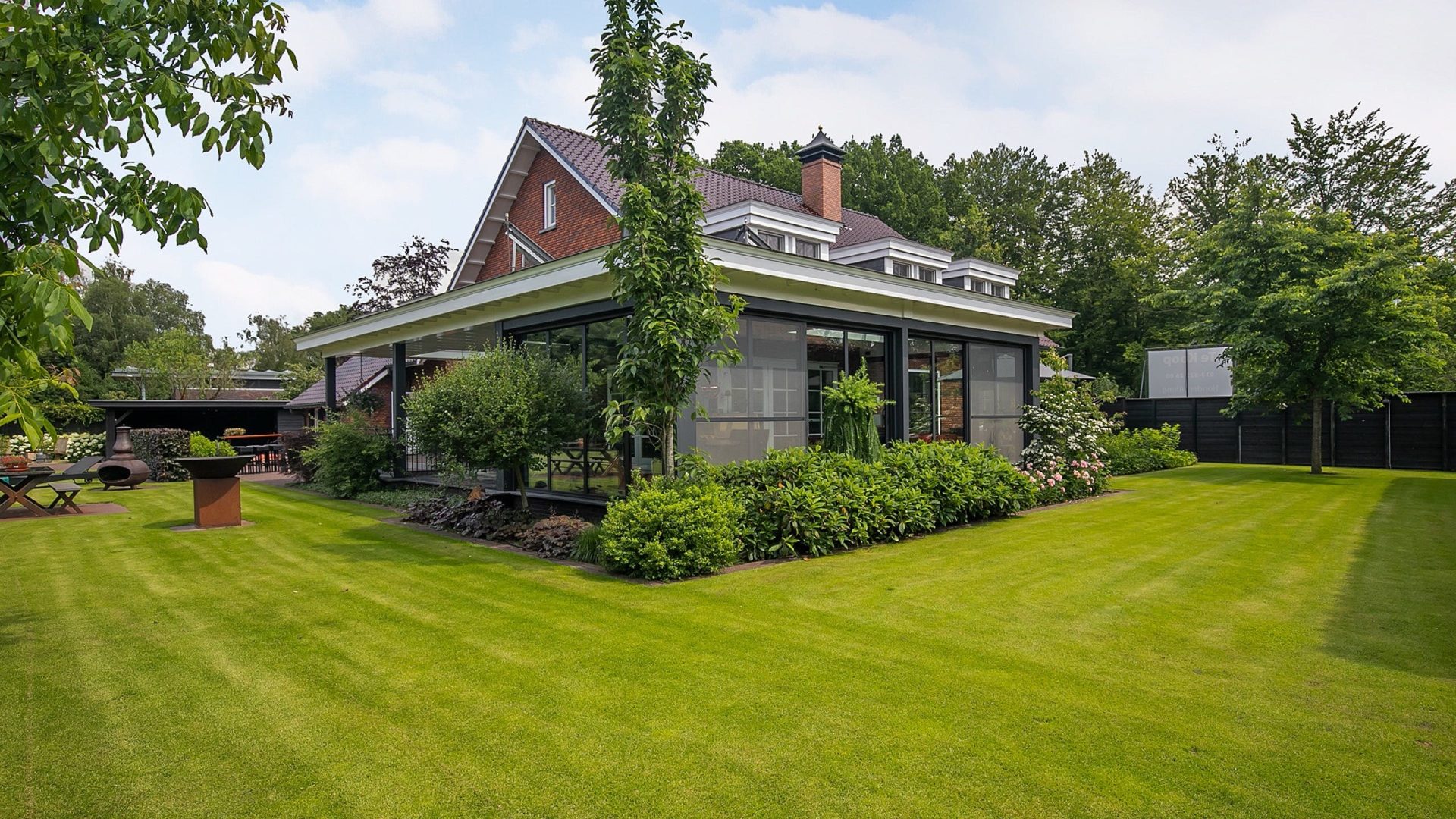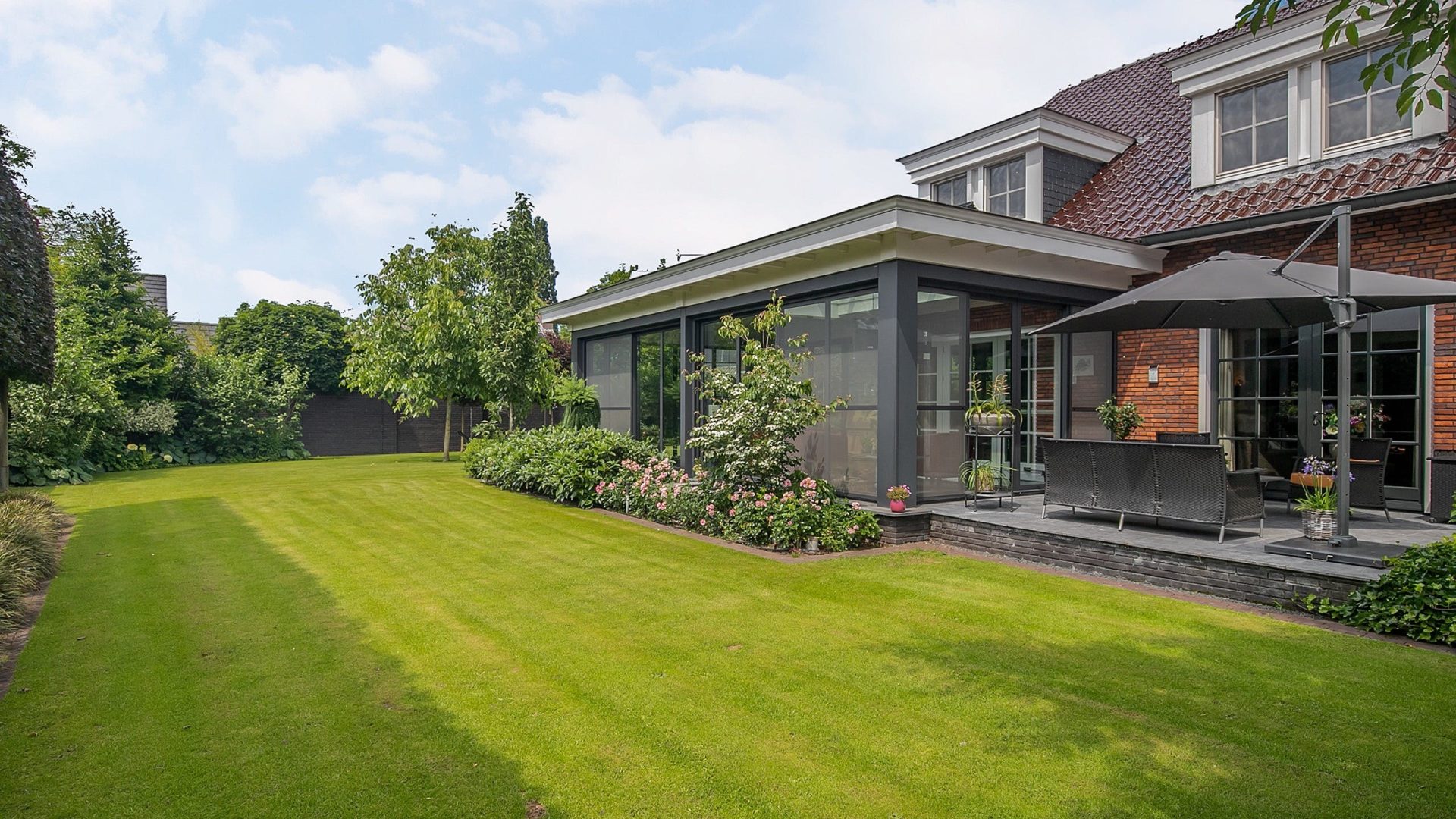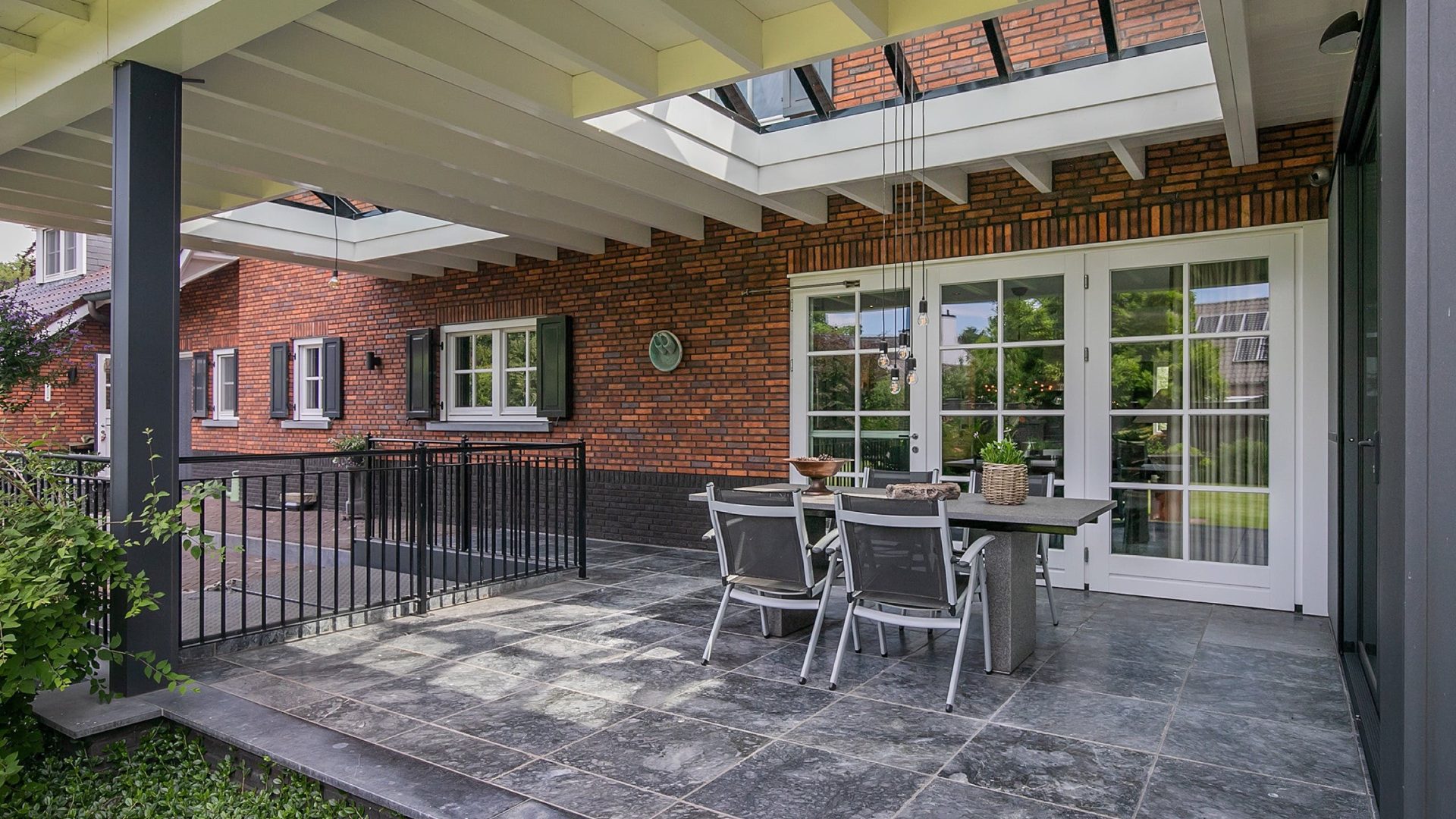 Vanuit de living of tuinkamer komt u middels twee openslaande deuren bij een veranda van maar liefst 41m² voorzien van een lichtstraat, met zicht op de speelse achtertuin.
