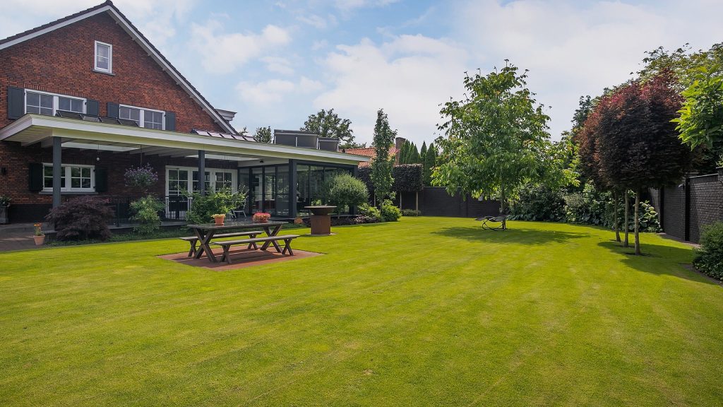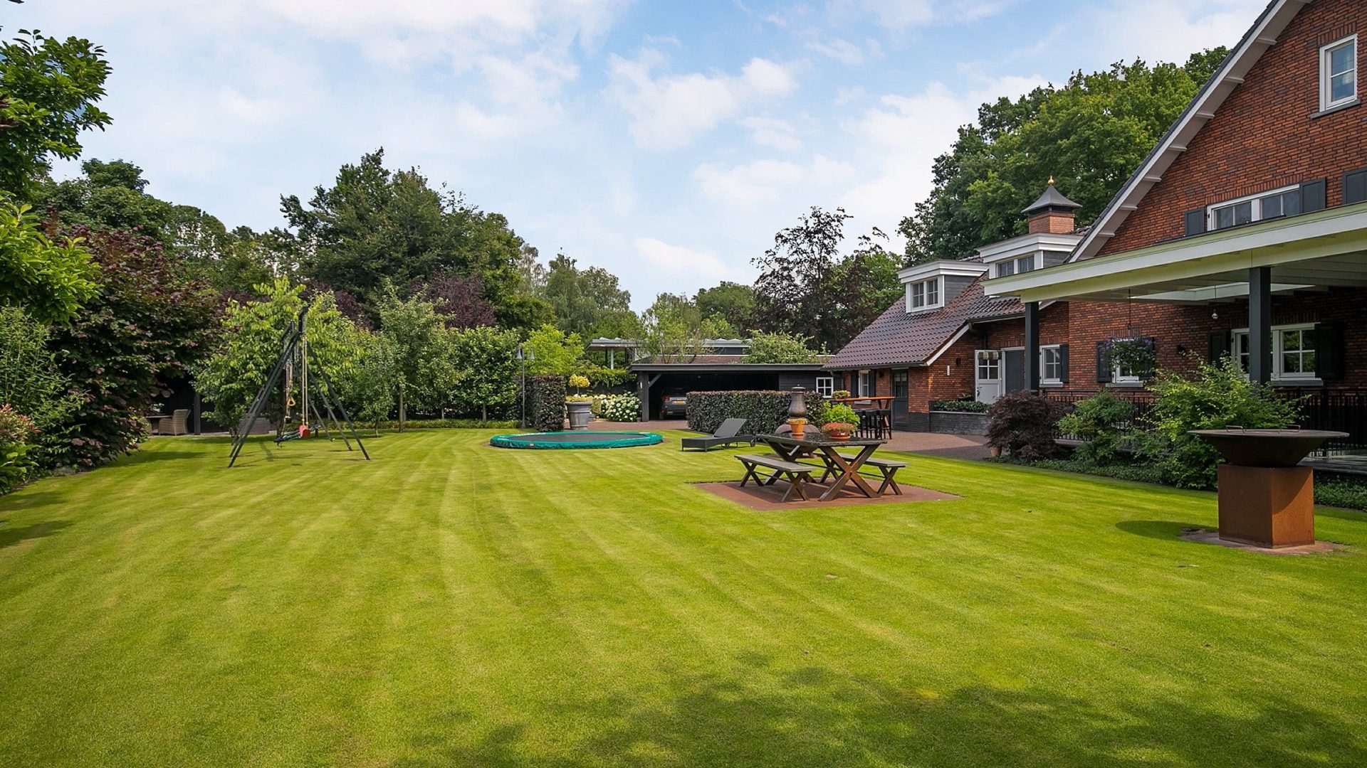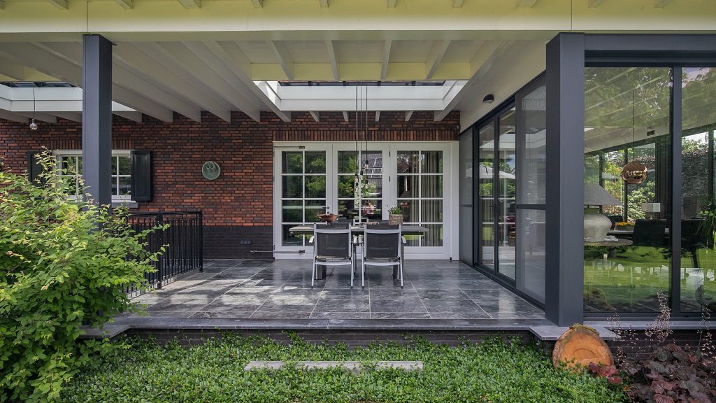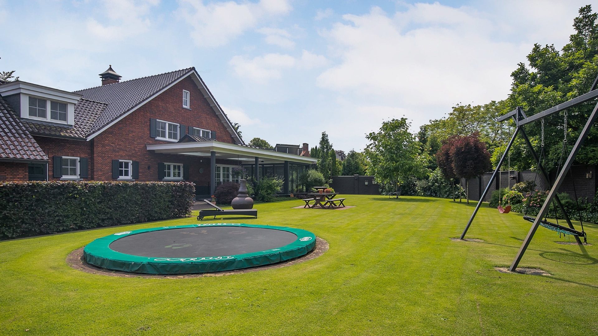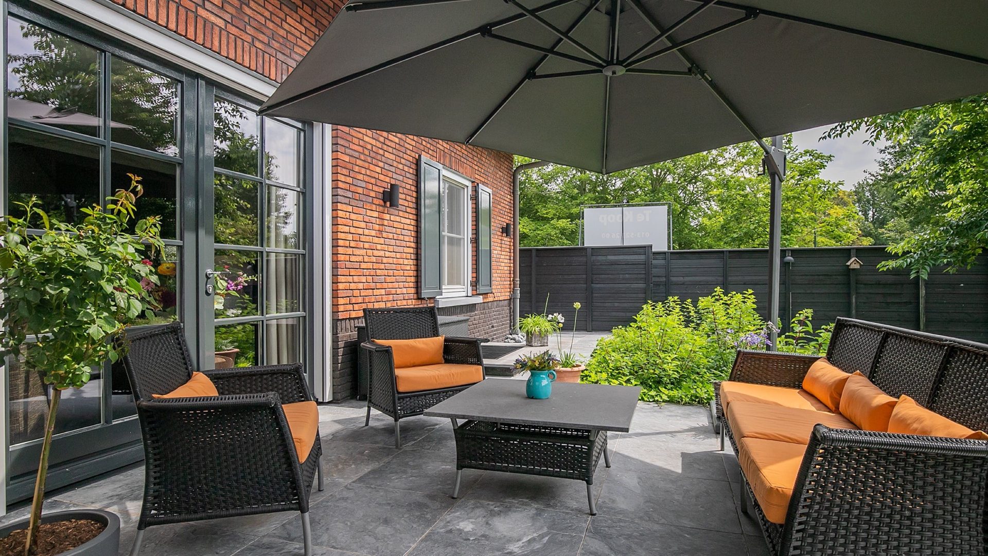Vanuit de living of tuinkamer komt u middels twee openslaande deuren bij een veranda van maar liefst 41m² voorzien van een lichtstraat, met zicht op de speelse achtertuin.