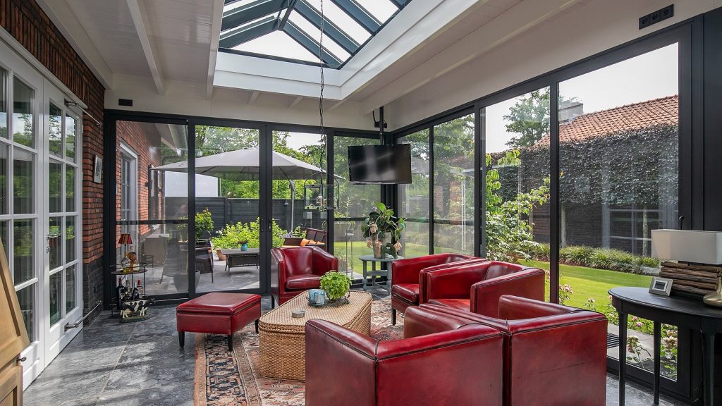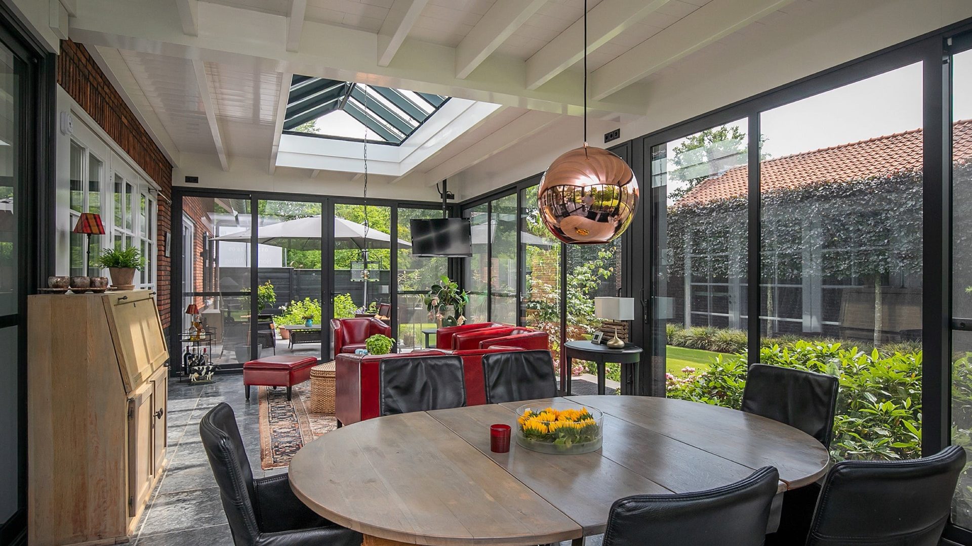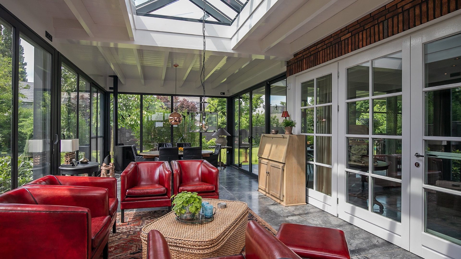 Daarnaast is middels twee openslaande deuren de sfeervolle en lichte tuinkamer circa 37,5m² toegankelijk. De tuinkamer met pellet kachel is voorzien van een lichtstraat, rondom glaspartijen met meerdere schuifpuien, voorzien van schuifhorren en elektrische screens. Deze ruimte met veel lichtinval geeft vanuit alle hoeken prachtig uitzicht op de zij- en achtertuin.
