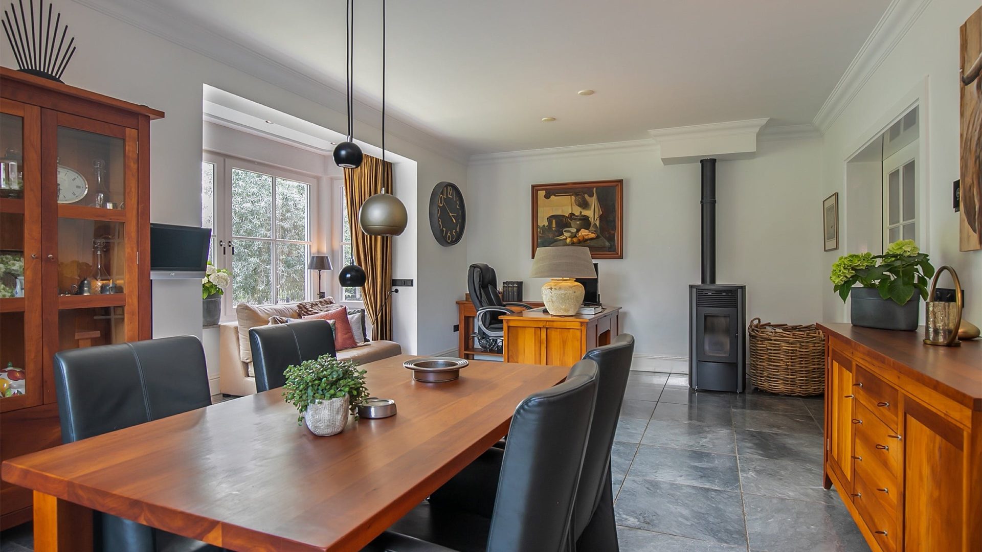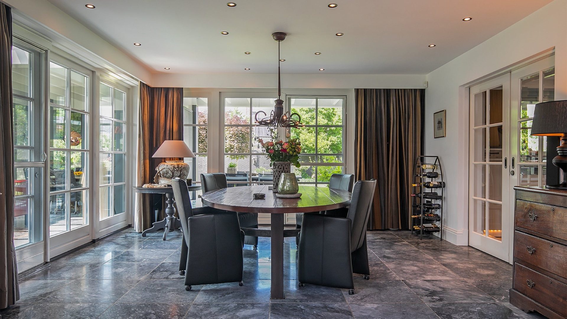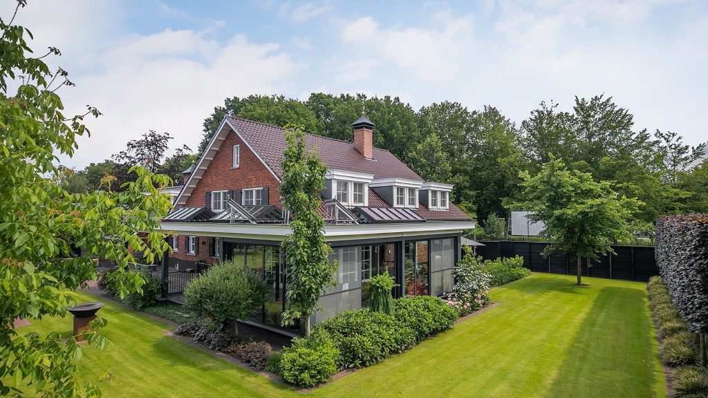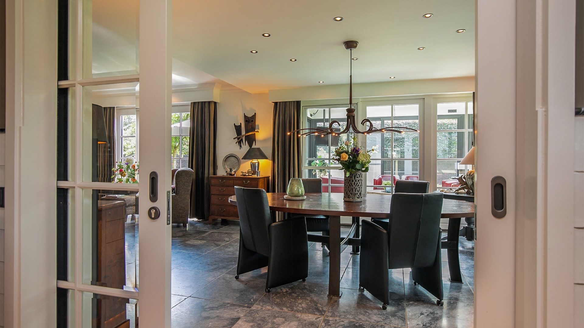 Daarnaast is middels twee openslaande deuren de sfeervolle en lichte tuinkamer circa 37,5m² toegankelijk. De tuinkamer met pellet kachel is voorzien van een lichtstraat, rondom glaspartijen met meerdere schuifpuien, voorzien van schuifhorren en elektrische screens. Deze ruimte met veel lichtinval geeft vanuit alle hoeken prachtig uitzicht op de zij- en achtertuin.