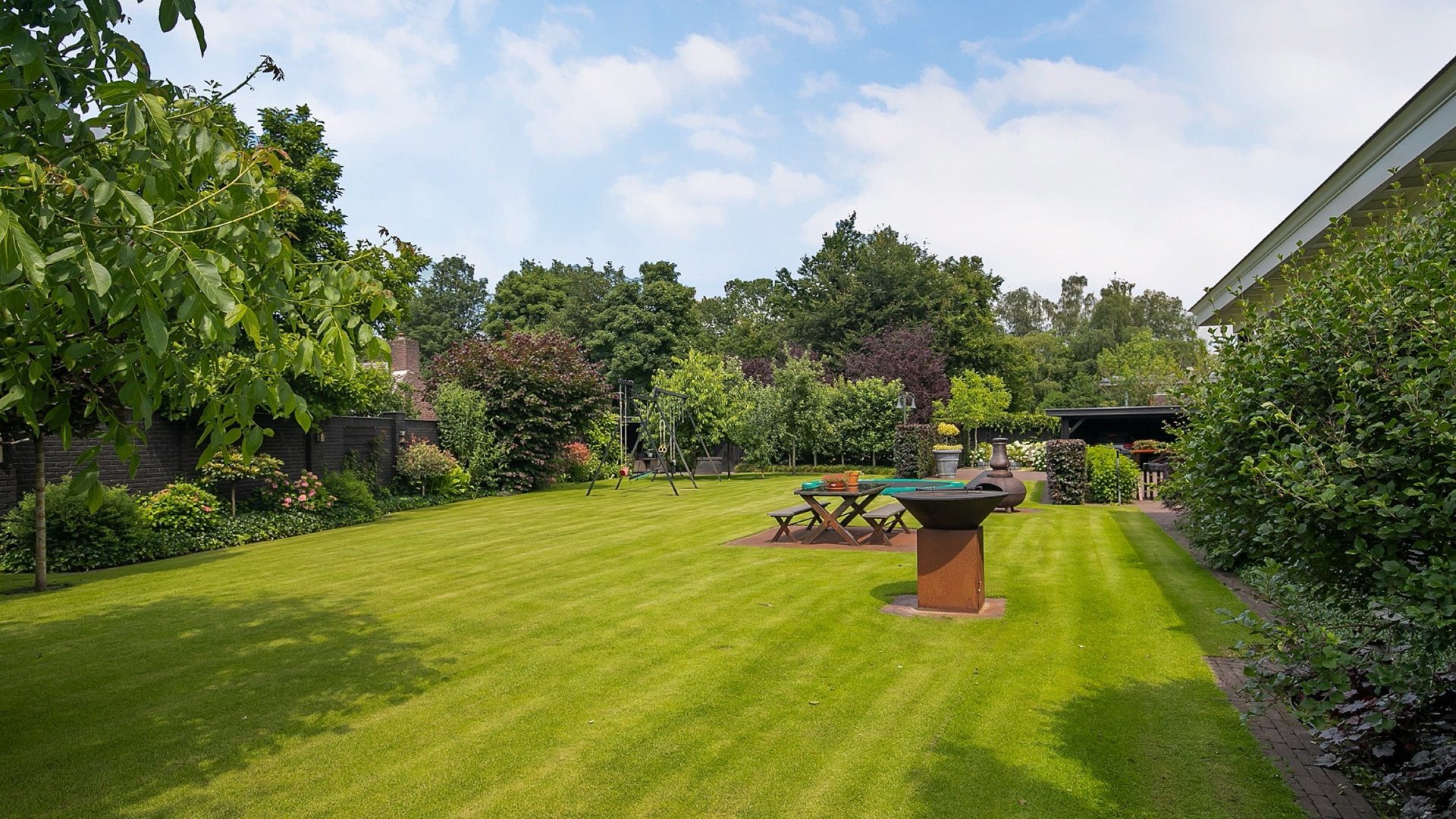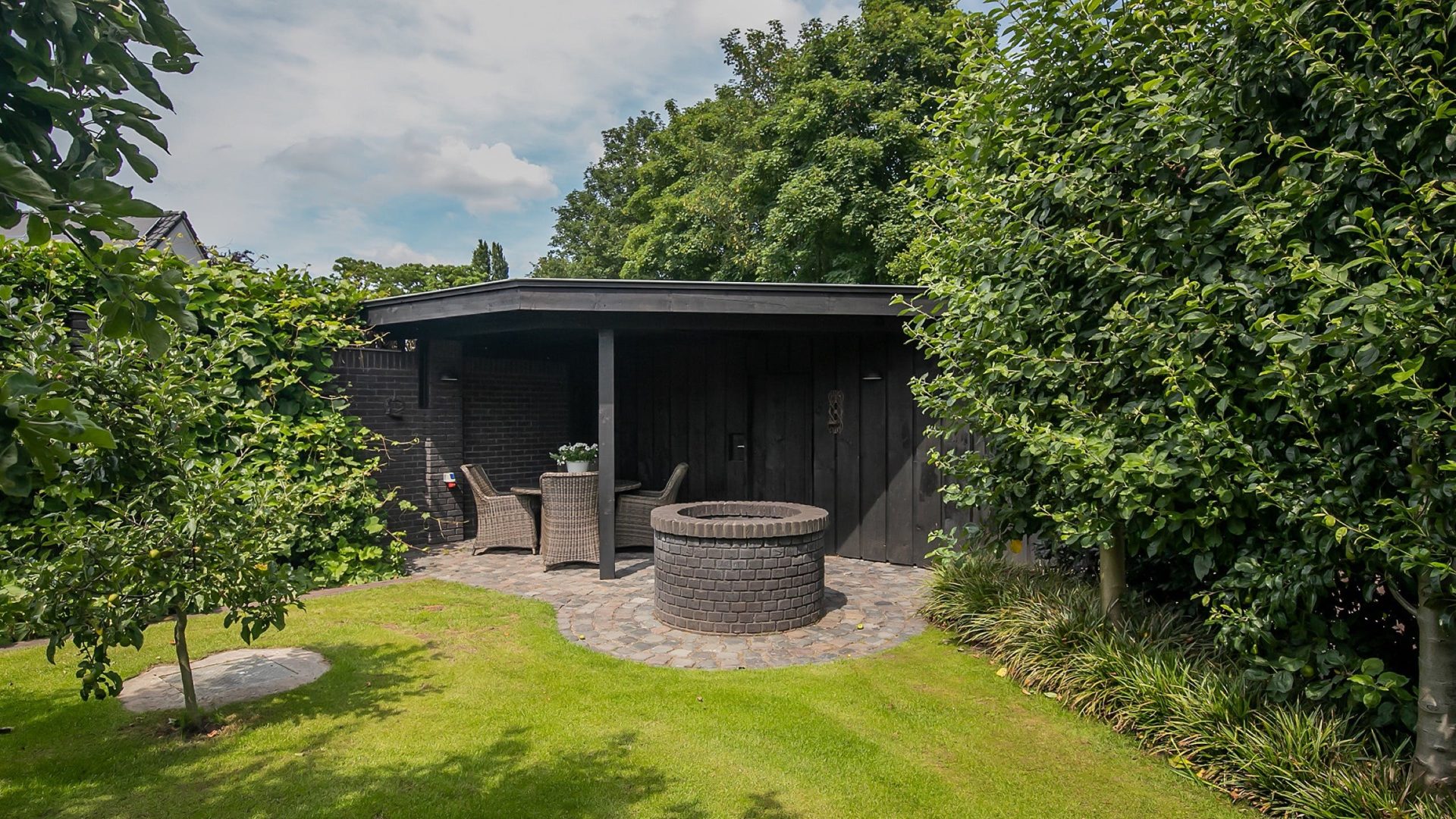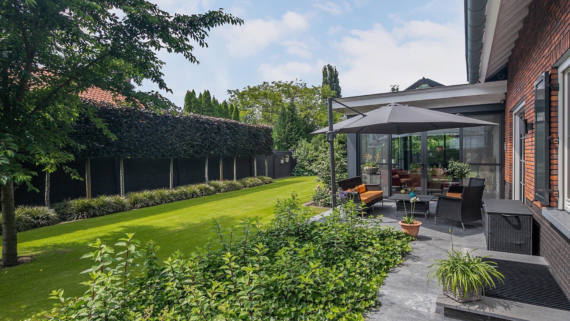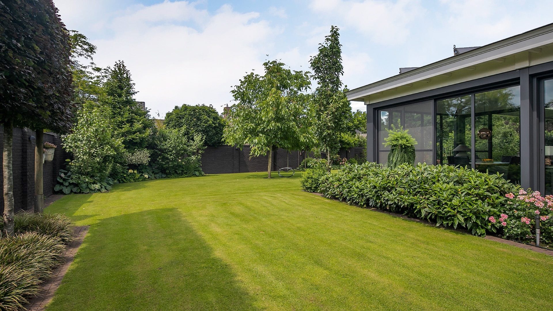 Het tuinontwerp is van Anne Laansma. De privacy biedende achtertuin is royaal van opzet, waardoor er op ieder moment van de dag een plekje is waar u van de zon kunt genieten of ergens een schaduwrijke plek kunt opzoeken.