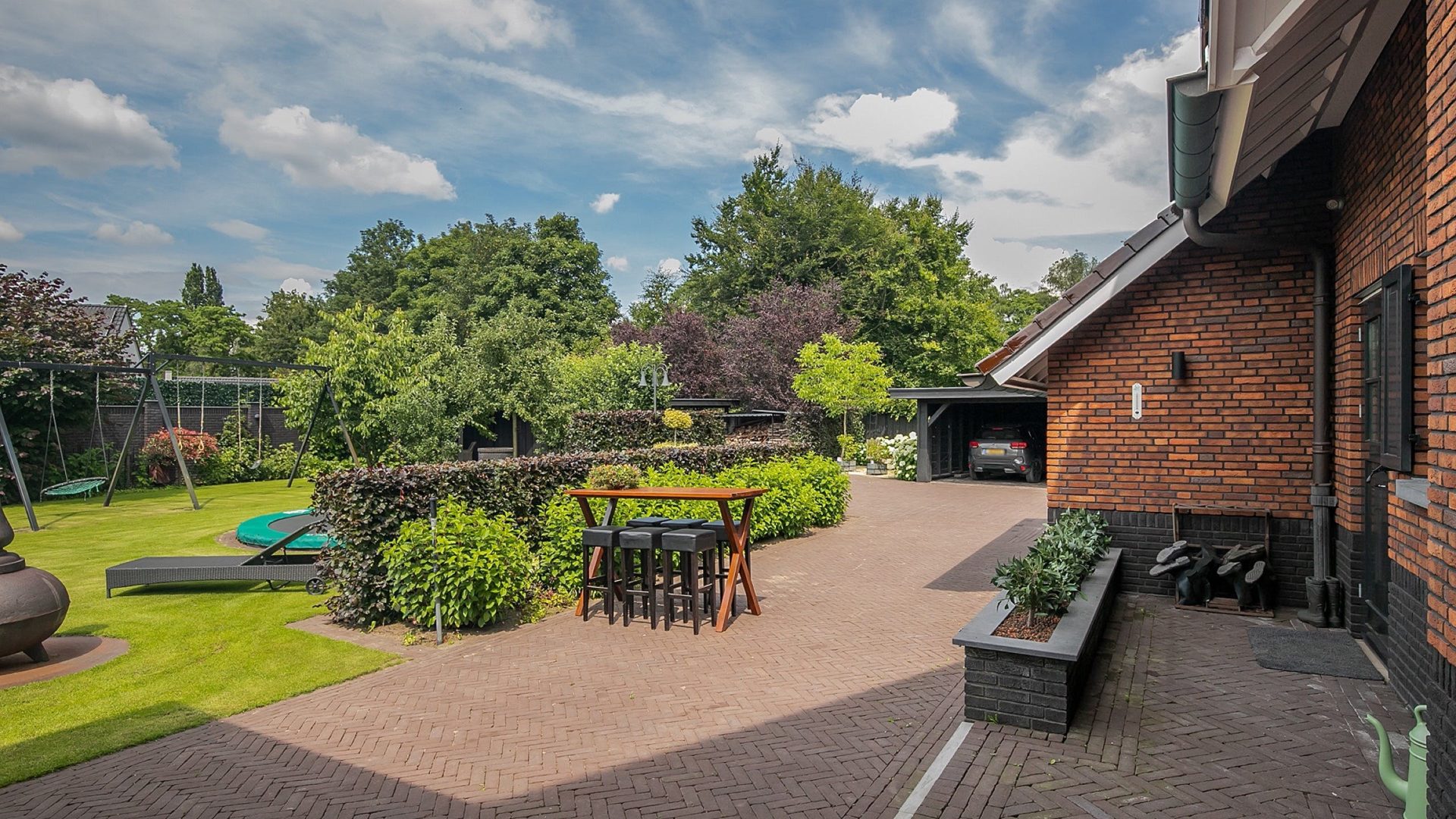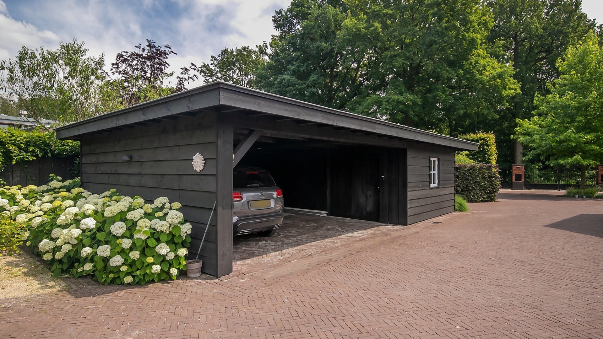 De plaats biedt door een mooie rotonde volop ruimte voor meerdere auto’s. Op het eigen terrein is een berging met carport voor twee auto’s aanwezig en tevens een garage/ berging met twee overkappingen (waar nu een zithoek en houtopslag voor de kachel zijn gerealiseerd).