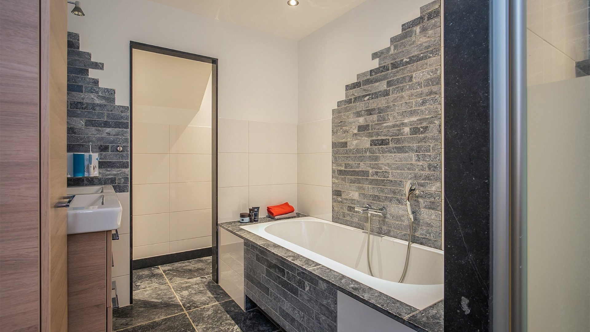 Via de overloop is een 2e luxe badkamer toegankelijk die is voorzien van een dubbele vaste wastafel met meubel, ligbad, aparte douche, afgescheiden vrij hangend toilet en urinoir en een design radiator.