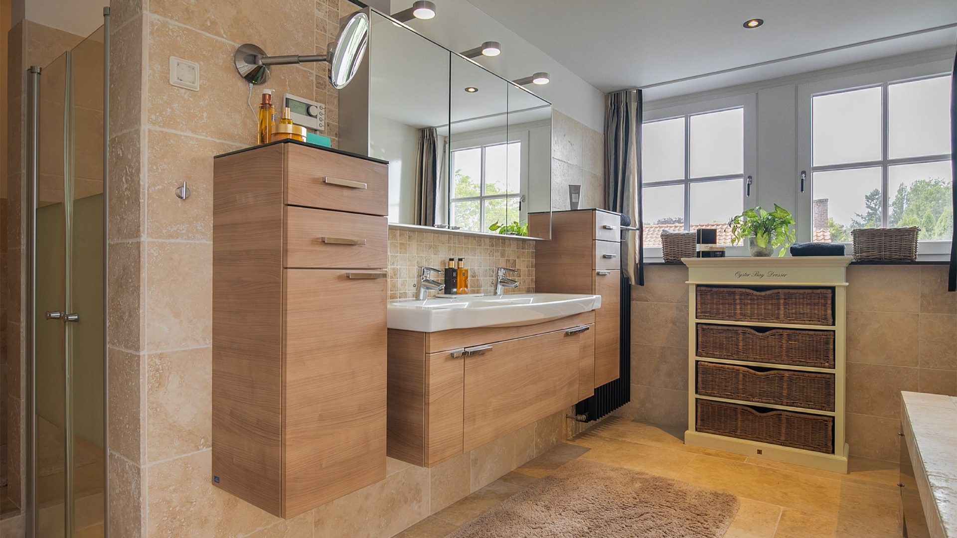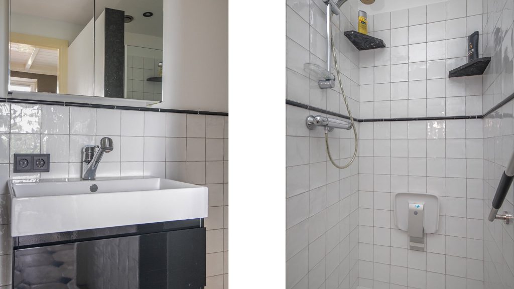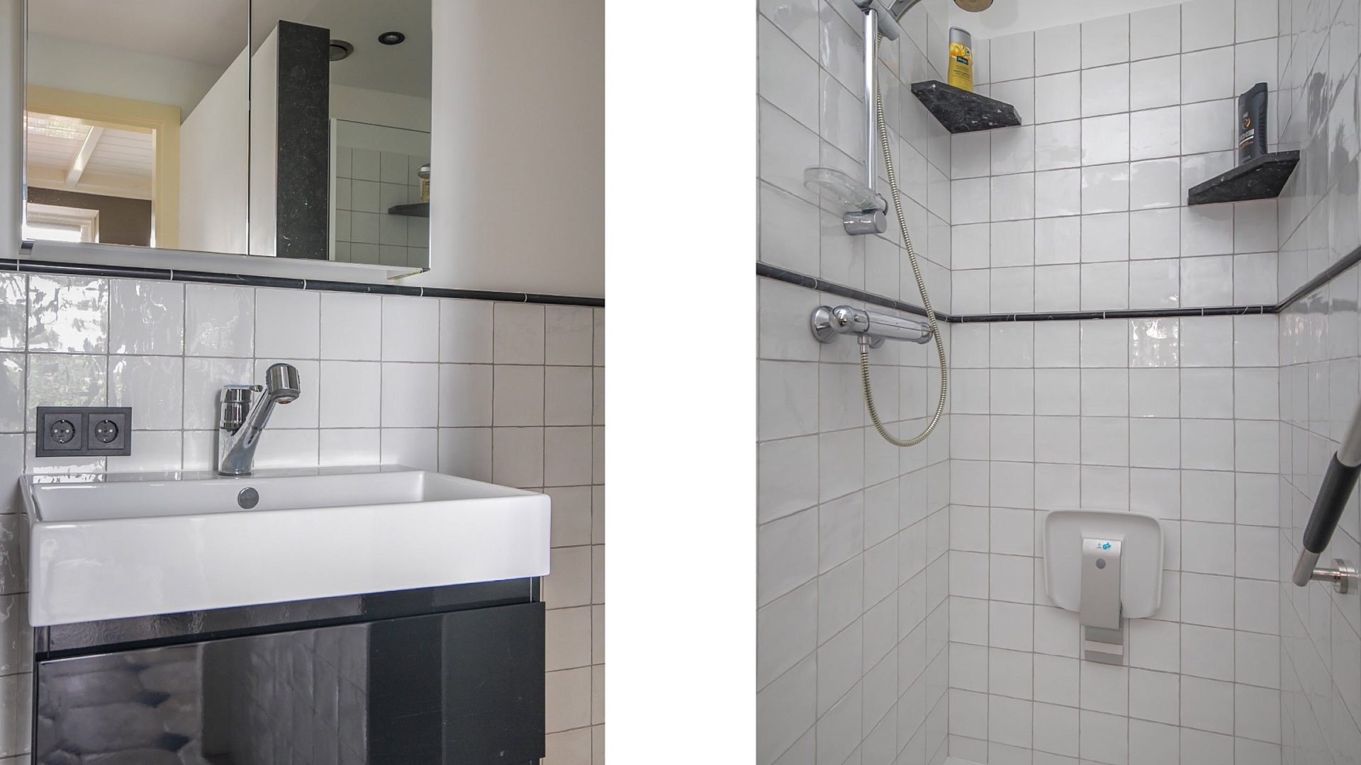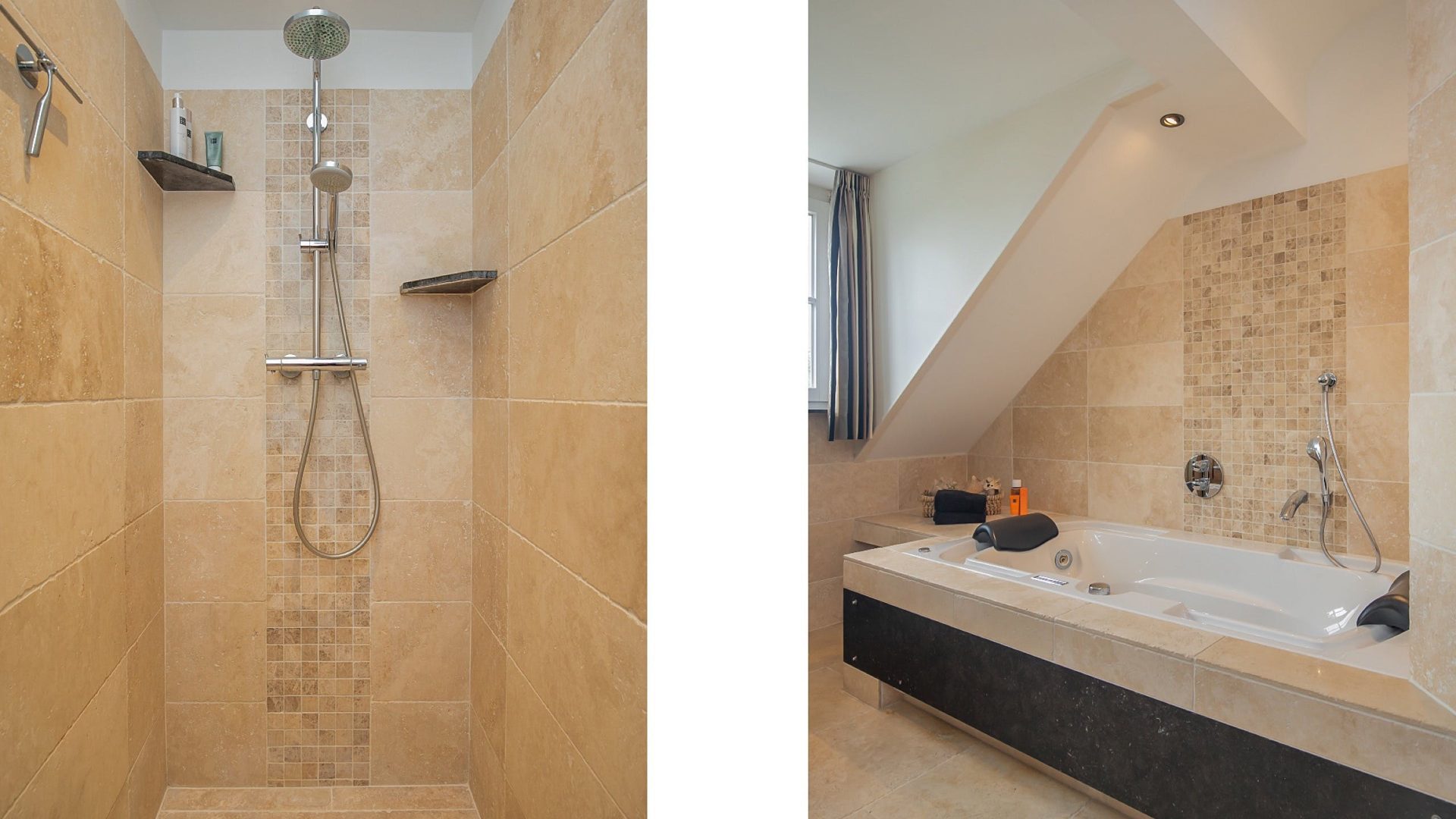 Vanuit de ouderslaapkamer is een eigen en complete badkamer te bereiken. De luxe badkamer is voorzien van een dubbele vaste wastafel met spiegelkast en meubel, twee persoons Riho whirlpool ligbad, aparte douche, afgescheiden vrij hangend toilet en twee design radiators.