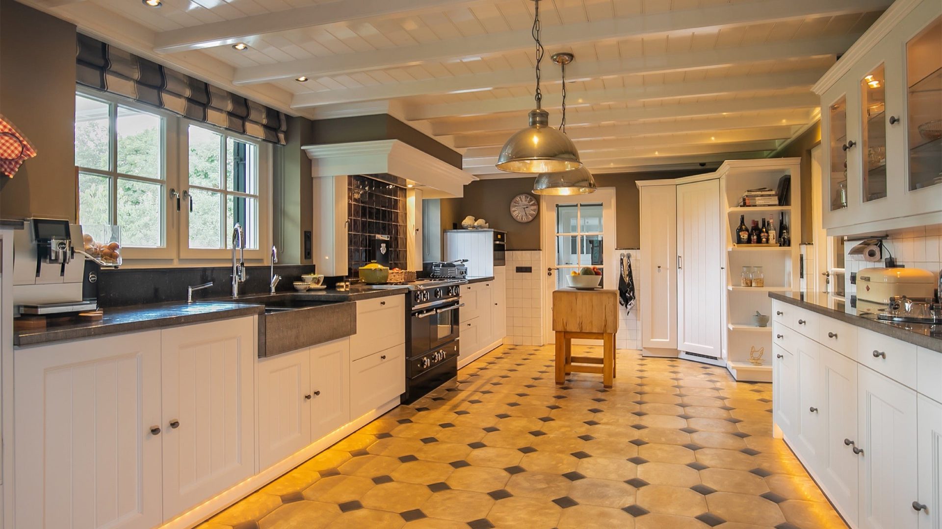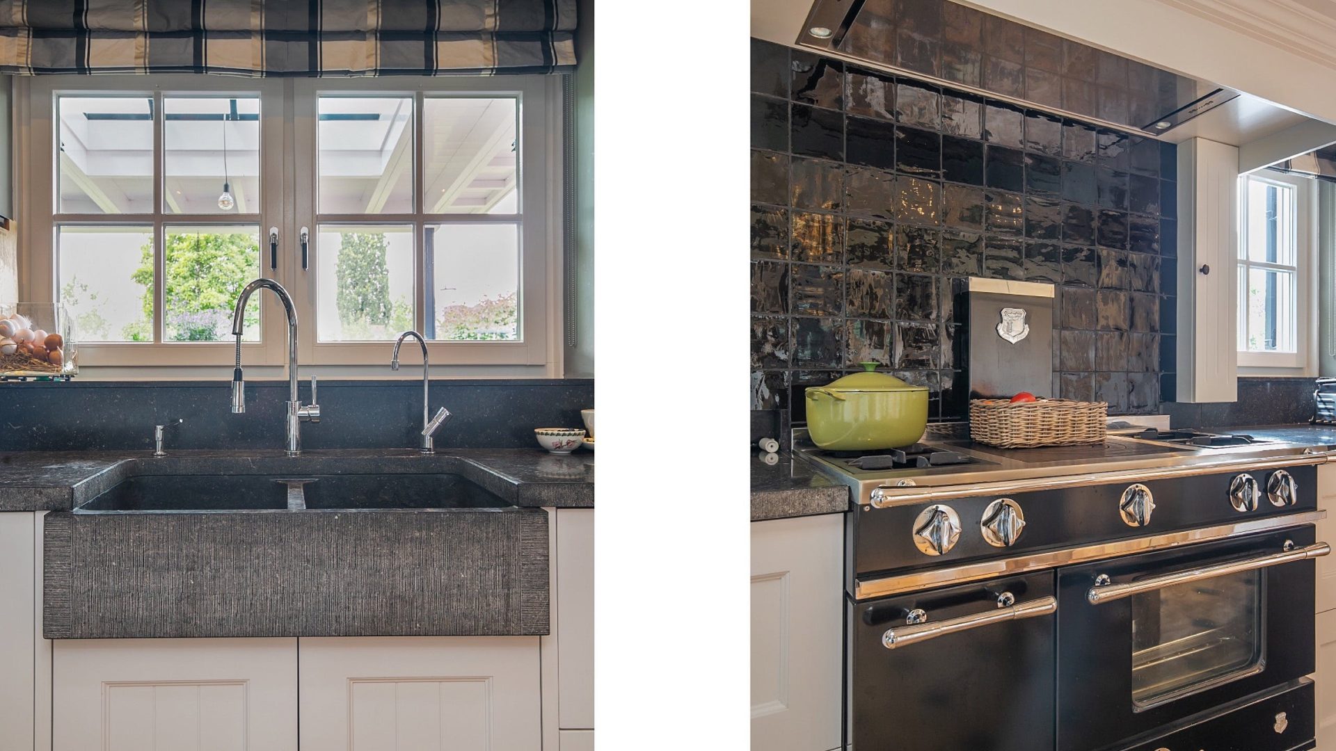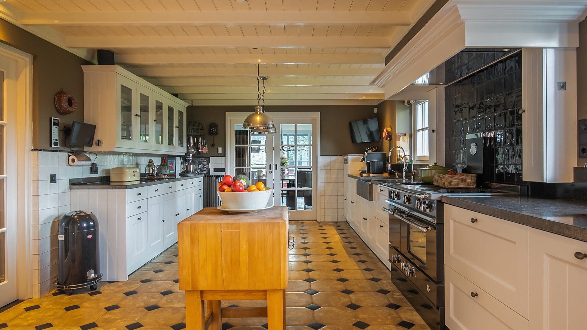 De ruime en uiterst sfeervolle woonkeuken van circa 27m² is zeer uitgebreid en bestaat uit twee keukenblokken en een extra meubel met twee apothekerskasten en grote hoek koelkast. De luxe keukeninrichting (Tinello) is voorzien van diverse/ meerdere Belgisch gefrijnde hardstenen bladen met twee spoelbakken, Quooker, een groot Delaubrac gasfornuis 1.20m. met 4 gaspitten, gietijzeren kook-/ warmhoudplaat, elektrische oven en warmhoudkast, afzuigschouw, combi magnetron en een vaatwasser op hoogte.