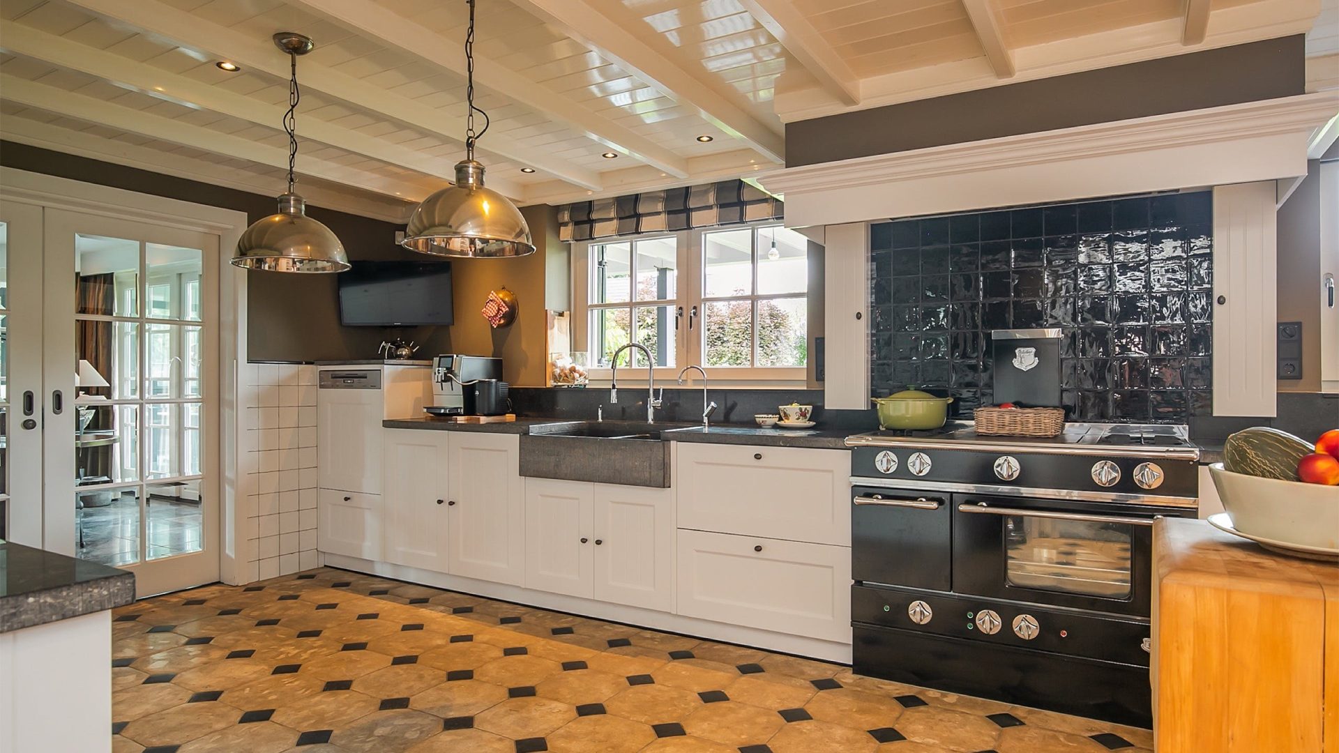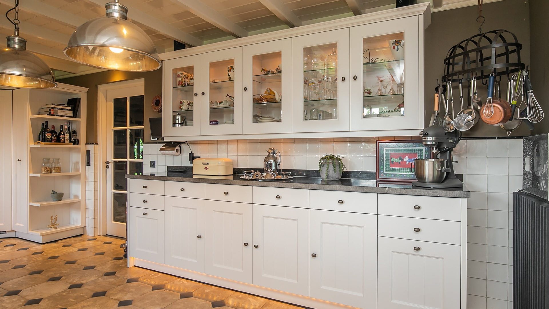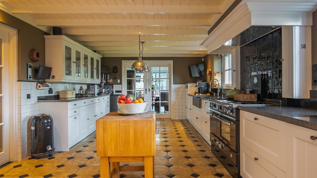 De ruime en uiterst sfeervolle woonkeuken van circa 27m² is zeer uitgebreid en bestaat uit twee keukenblokken en een extra meubel met twee apothekerskasten en grote hoek koelkast. De luxe keukeninrichting (Tinello) is voorzien van diverse/ meerdere Belgisch gefrijnde hardstenen bladen met twee spoelbakken, Quooker, een groot Delaubrac gasfornuis 1.20m. met 4 gaspitten, gietijzeren kook-/ warmhoudplaat, elektrische oven en warmhoudkast, afzuigschouw, combi magnetron en een vaatwasser op hoogte.