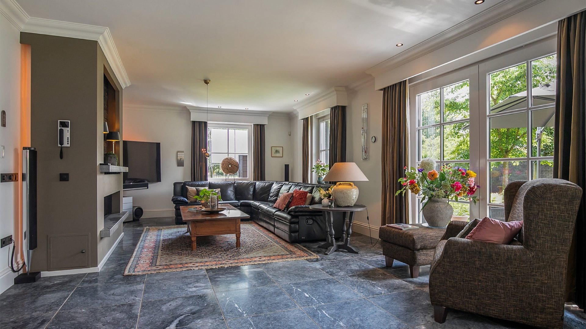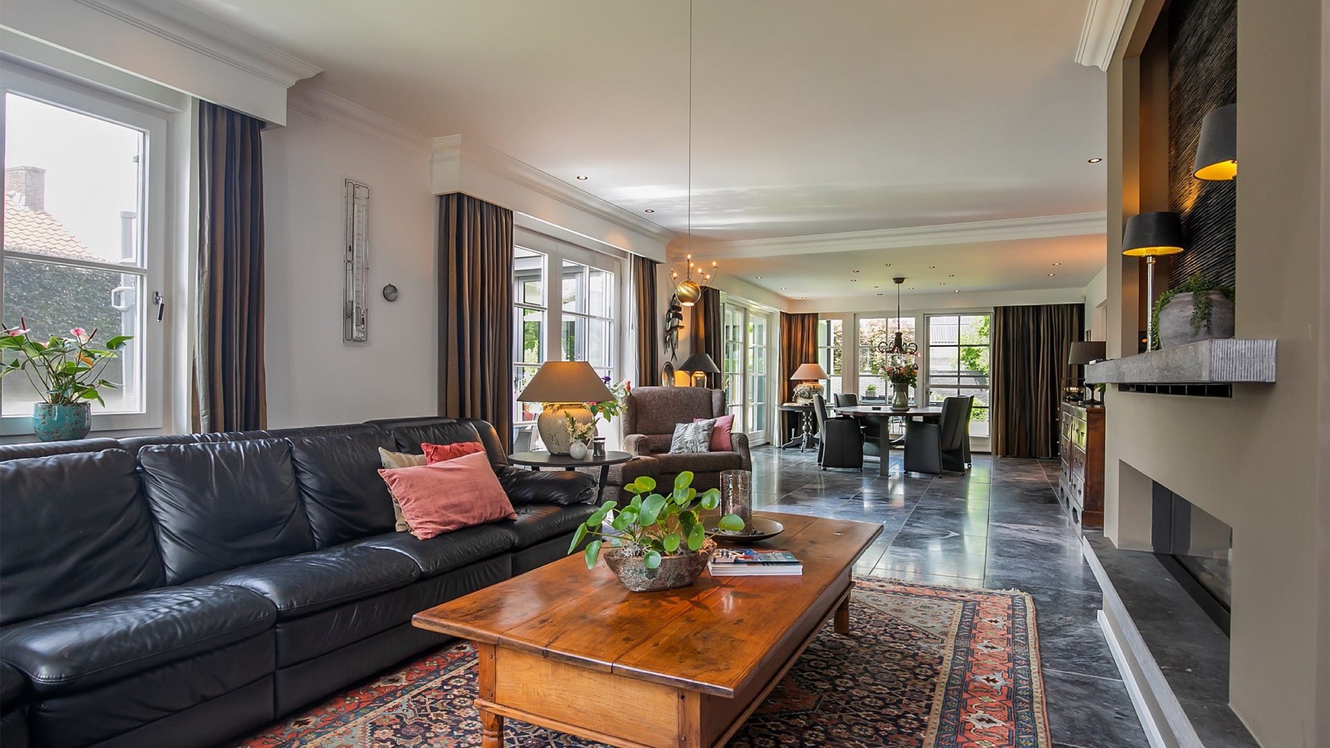 De living circa 77m² (inclusief vestibule) met gashaard biedt veel sfeer. Twee openslaande tuindeuren aan de zuidwest kant geven toegang tot een intiem zonnig terras naast de woning.
