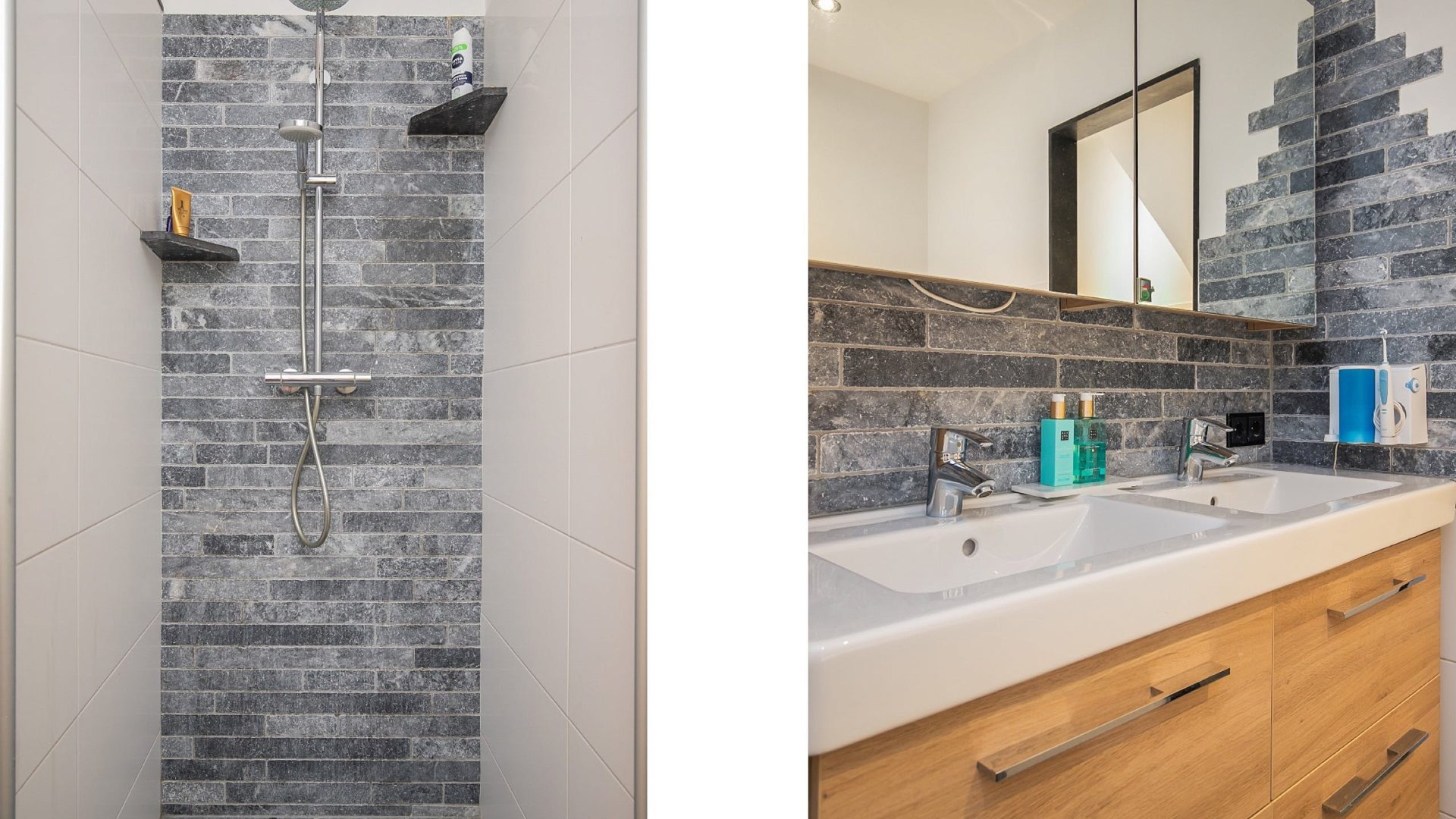 Luxe badkamer voorzien van een vaste wastafel, douche en een vrij hangend toilet.