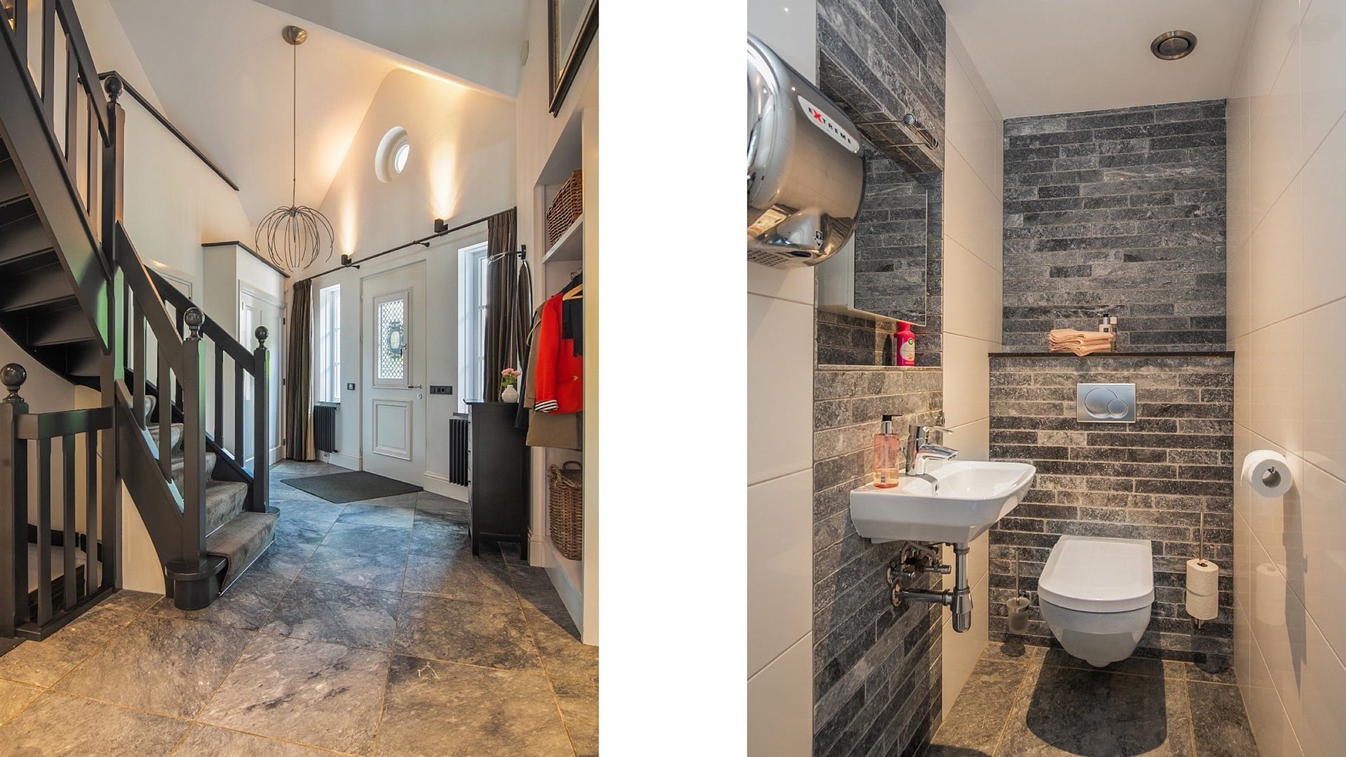Vanuit deze hal is de werkkamer, vestibule, keuken, kelder, bovenverdieping en toiletruimte te bereiken.
