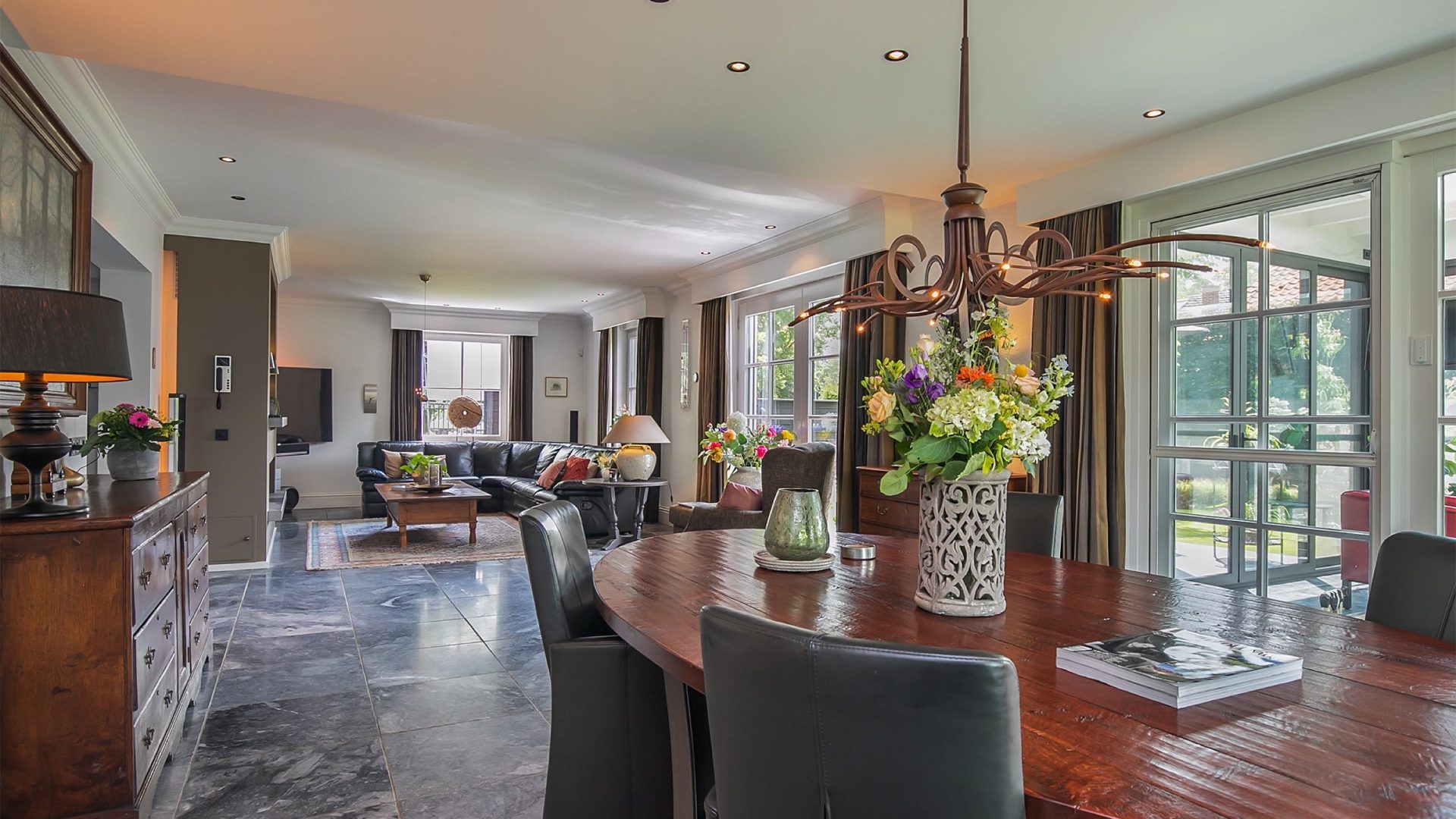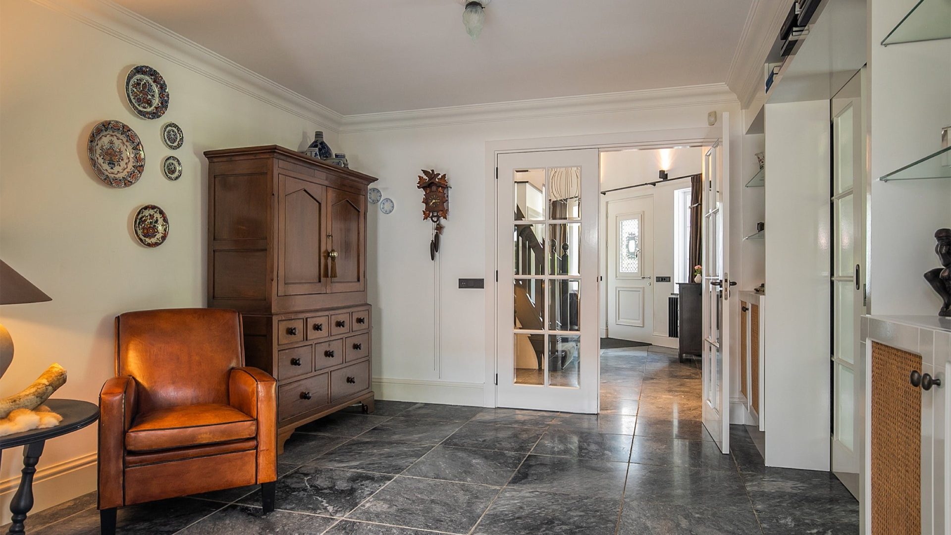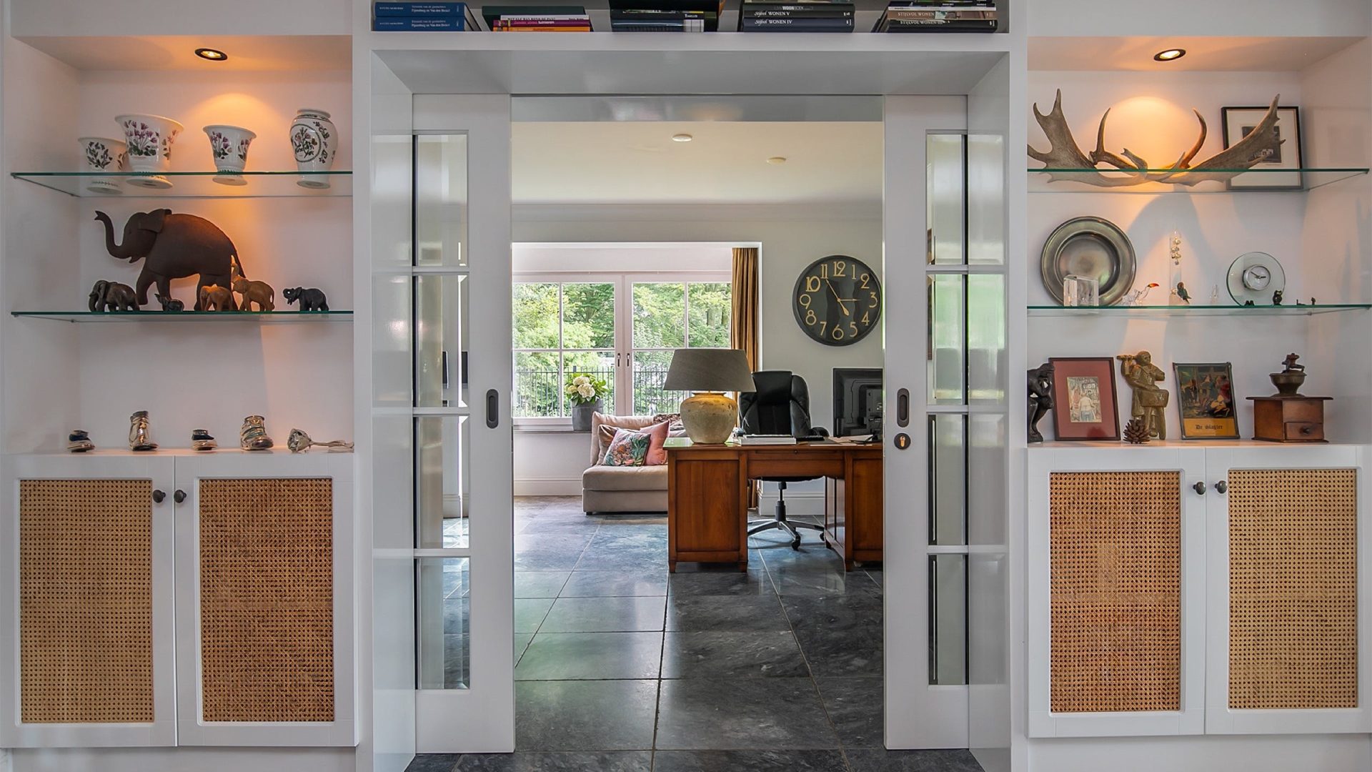 Via twee openslaande deuren is de vestibule toegankelijk met boekenkasten, doorloop naar de living en twee en-suite schuifdeuren met glas naar de werkkamer.