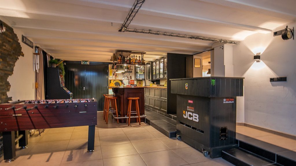 Het souterrain is onder andere voorzien van een grote chill ruimte/ thuisbioscoop met bar en houtkachel, toilet, keuken met uitgebreide keukeninrichting, een praktische klus-/ hobbyruimte en meerdere berg- en opslagmogelijkheden.