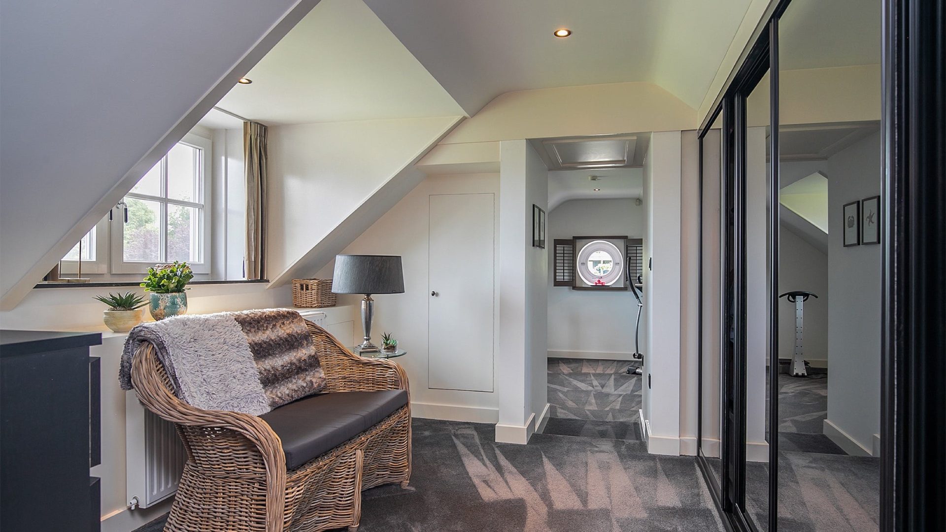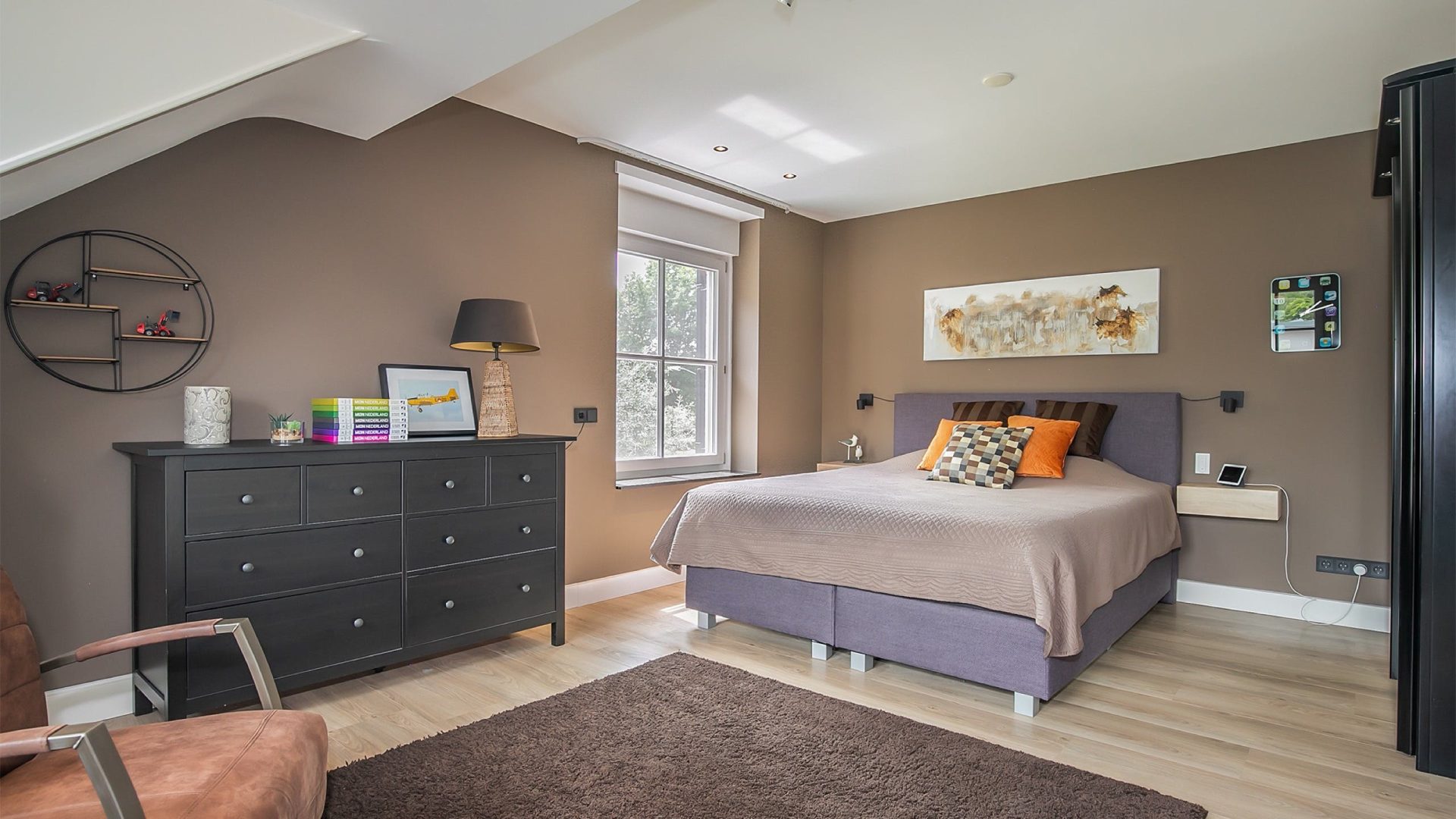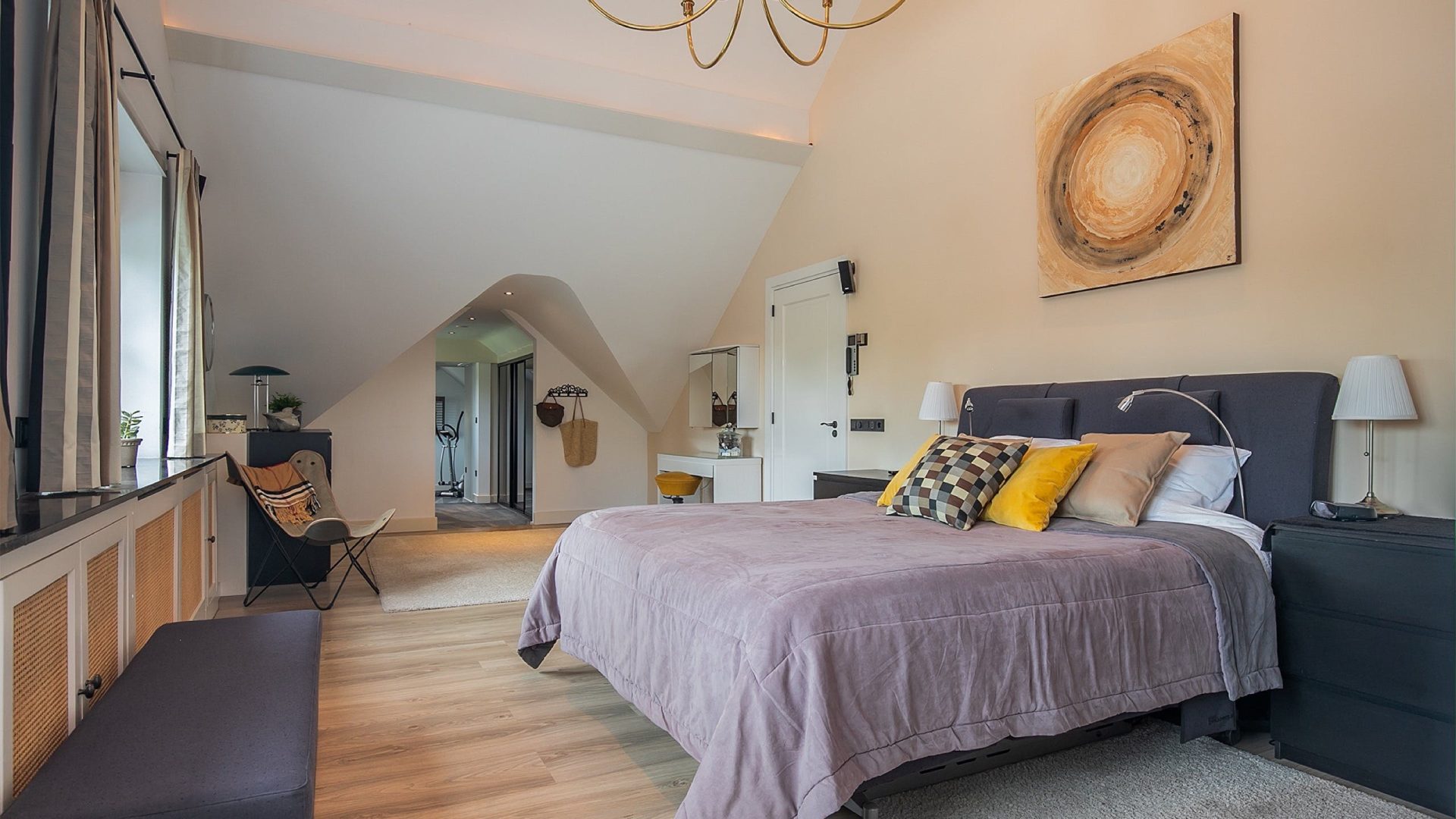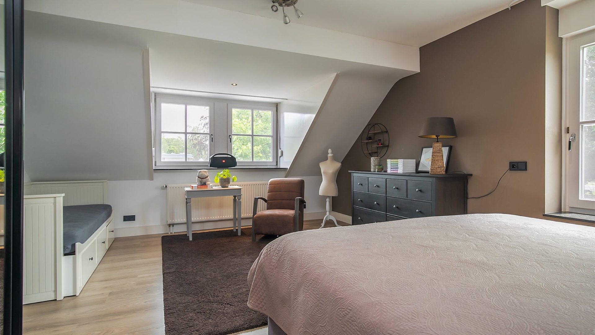 Zeer royale ouderslaapkamer met open nok wat een ruimtelijk effect geeft. Deze slaapkamer is aan de achterzijde van de woning gelegen en biedt een prachtig uitzicht op de achtertuin. Via een doorloop is er toegang tot een inloopgaderobe met dakkapel en veel kastruimte en een extra ruimte met dakkapel die gebruikt kan worden als extra slaapkamer/ logeerkamer/ sportkamer/ kantoorruimte en dergelijke.