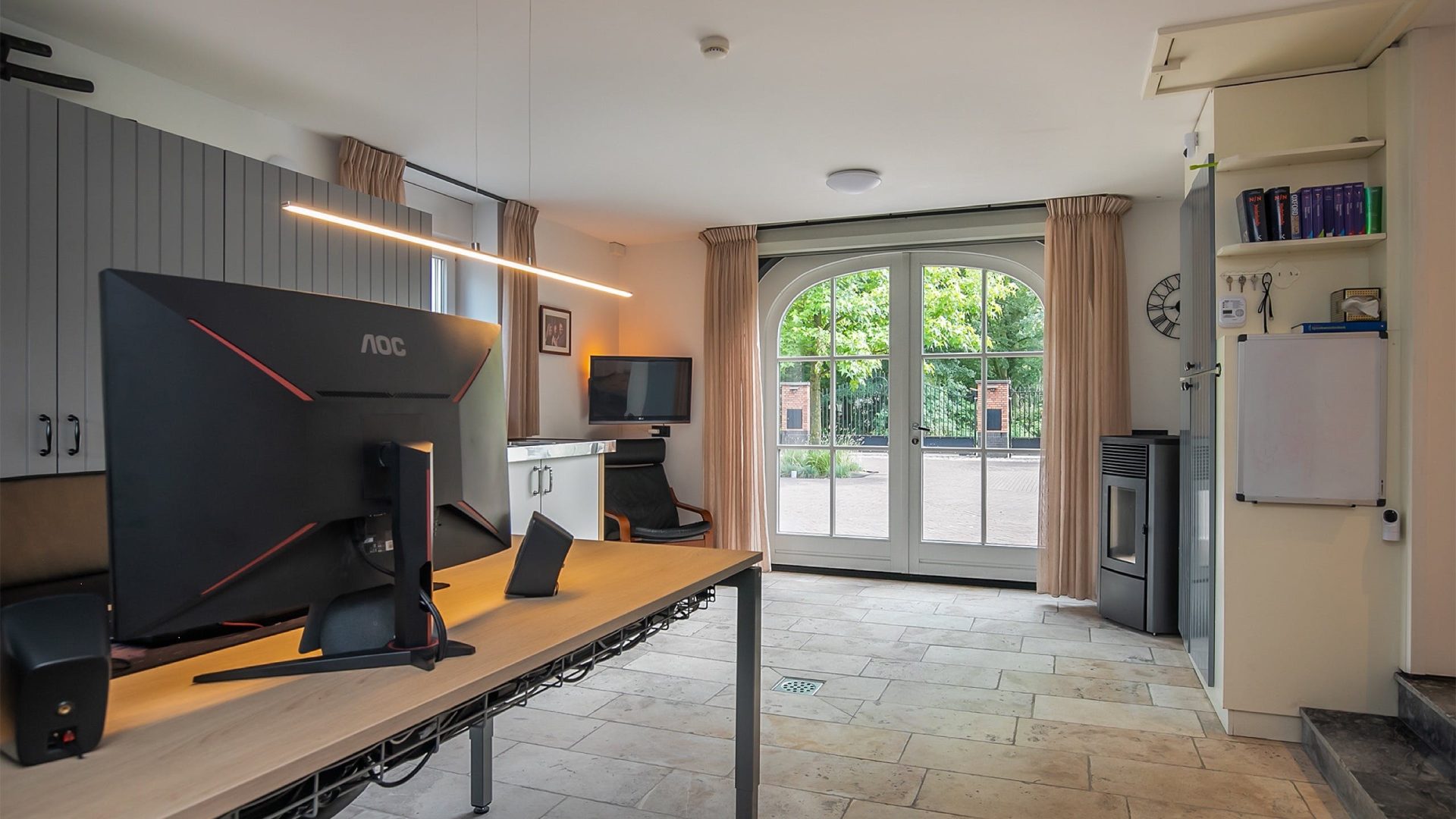 Ruime werkkamer circa 32m² met erker en pellet kachel.