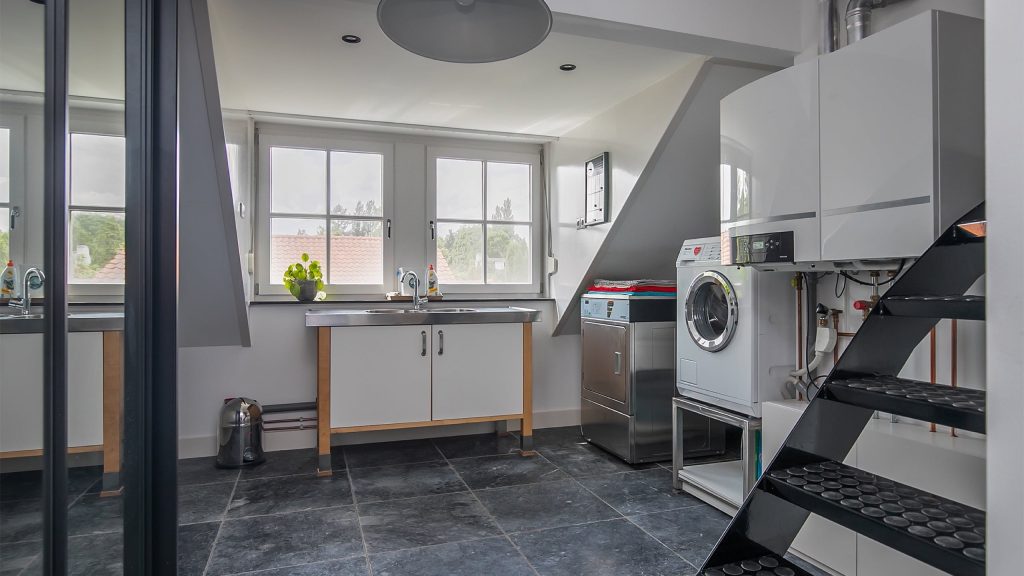 Grote was-/ strijkkamer met vide, keukenblok, dakkapel, aansluitingen voor de wasapparatuur, c.v. combi ketel, zonneboiler en de trapopgang naar de tweede verdieping.