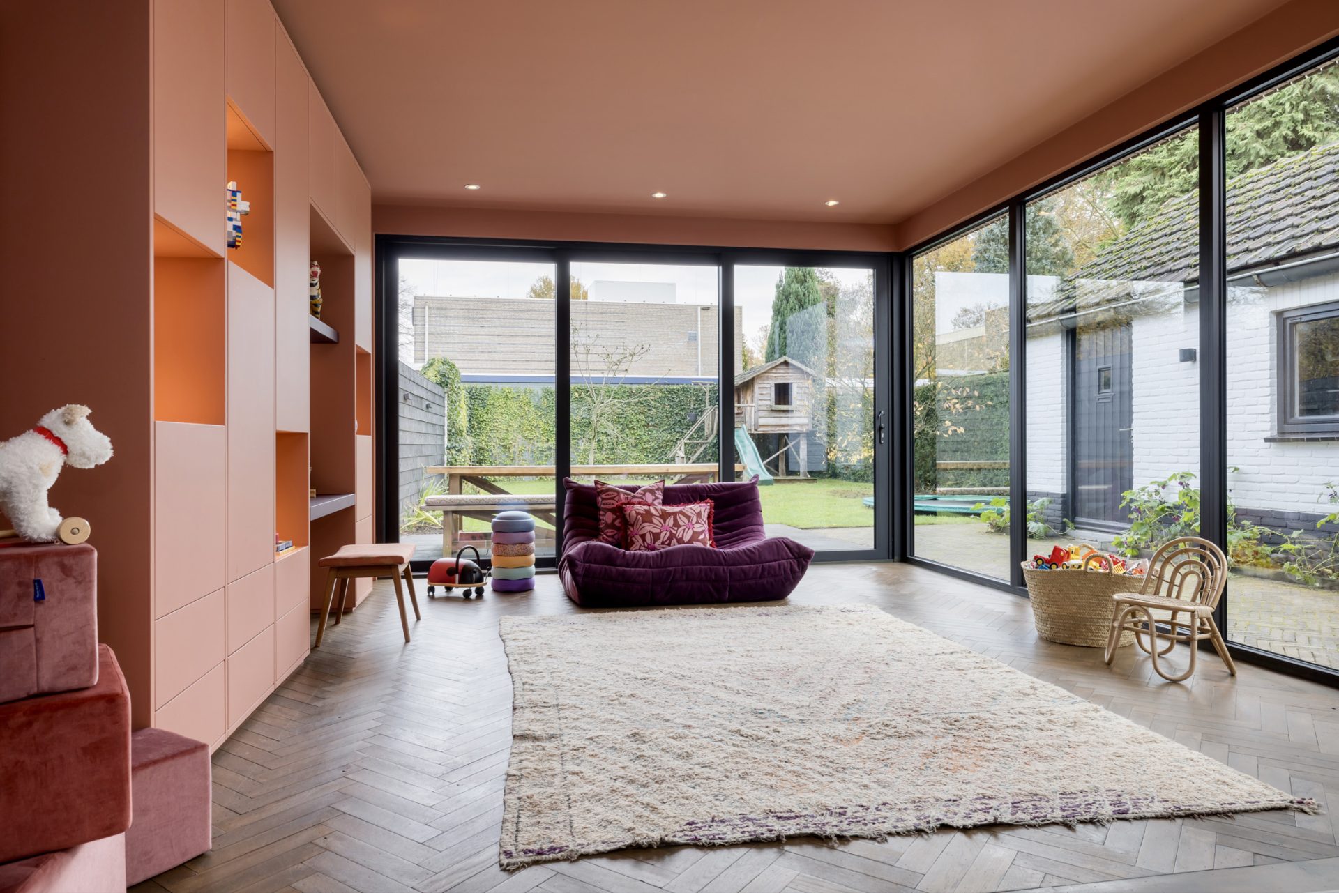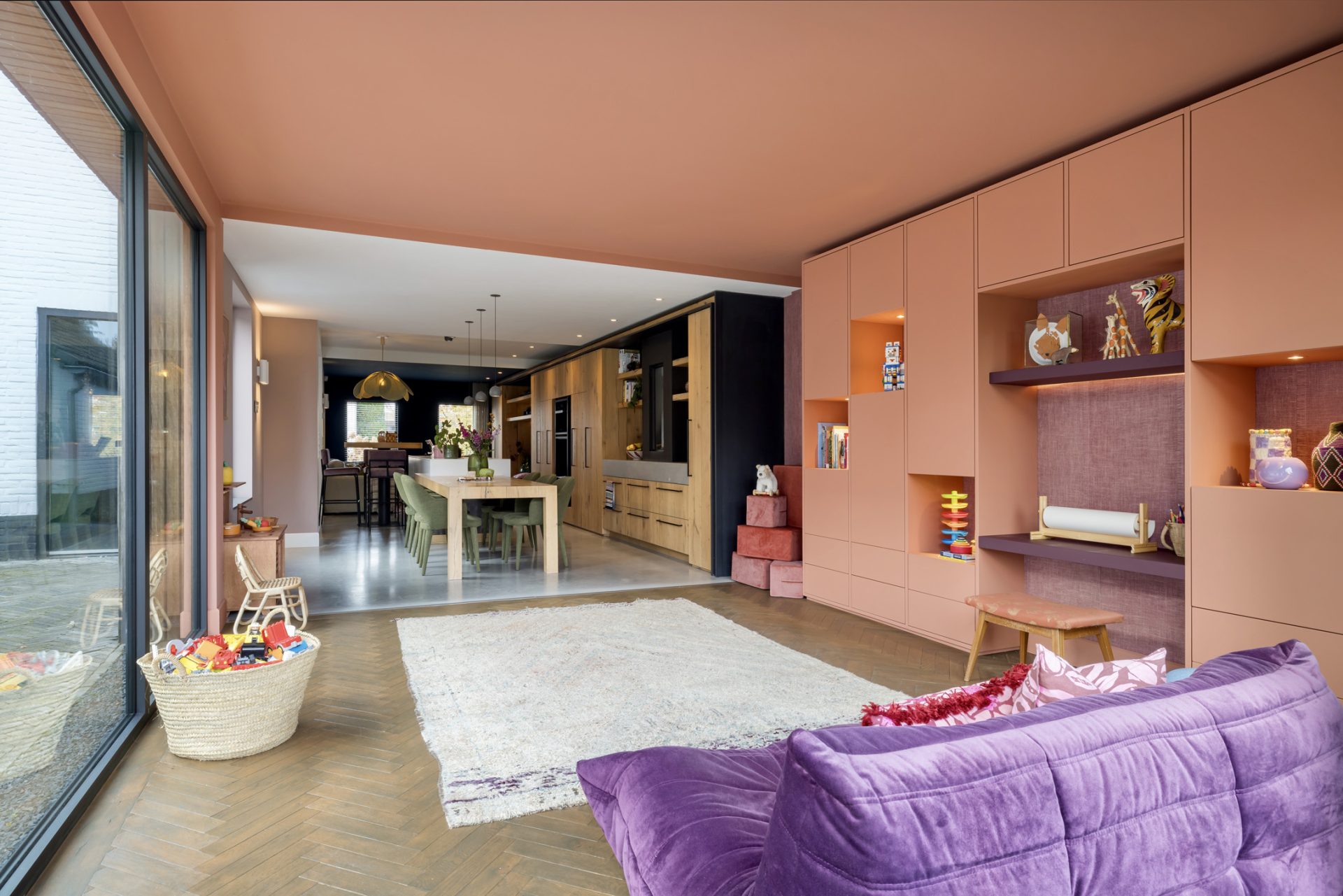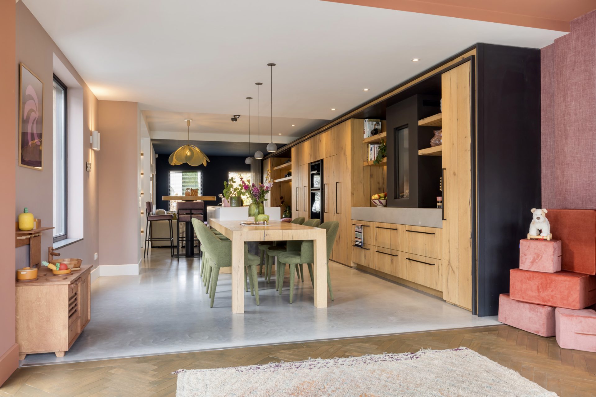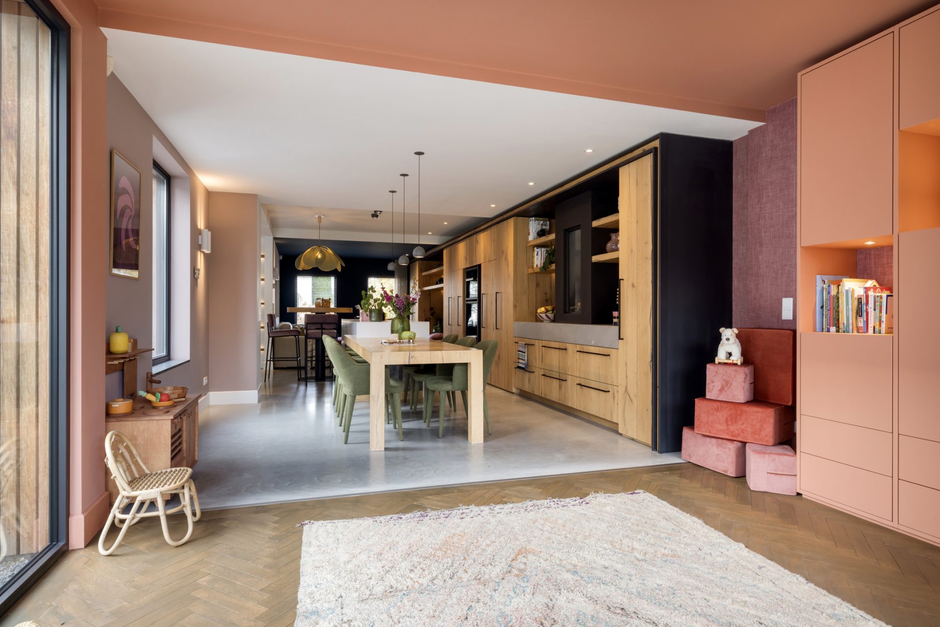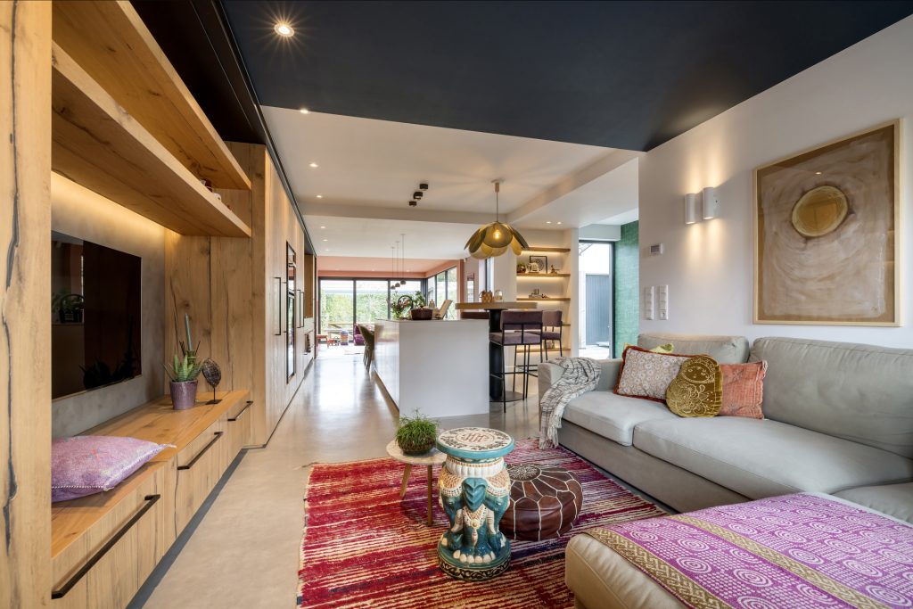 Het zitgedeelte, aan de voorzijde, is een heerlijke plek om naar een goede film, serie of documentaire te kijken. Aan de achterzijde is het speeldomein van de kinderen, met ramen tot vloerhoogte en een grote schuifpui naar de tuin. De kleur van de muren, het plafond en het maatwerk interieur is het toonbeeld van goede smaak en de visgraat parketvloer is een brok karakter.