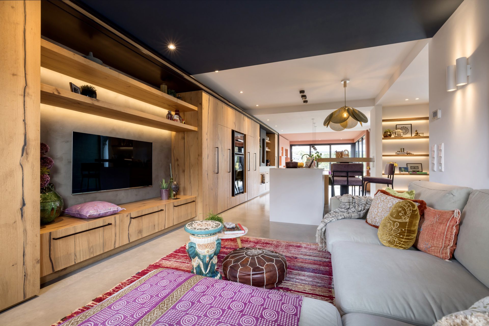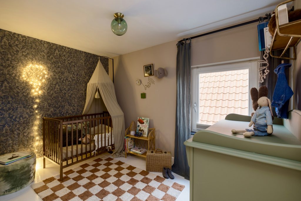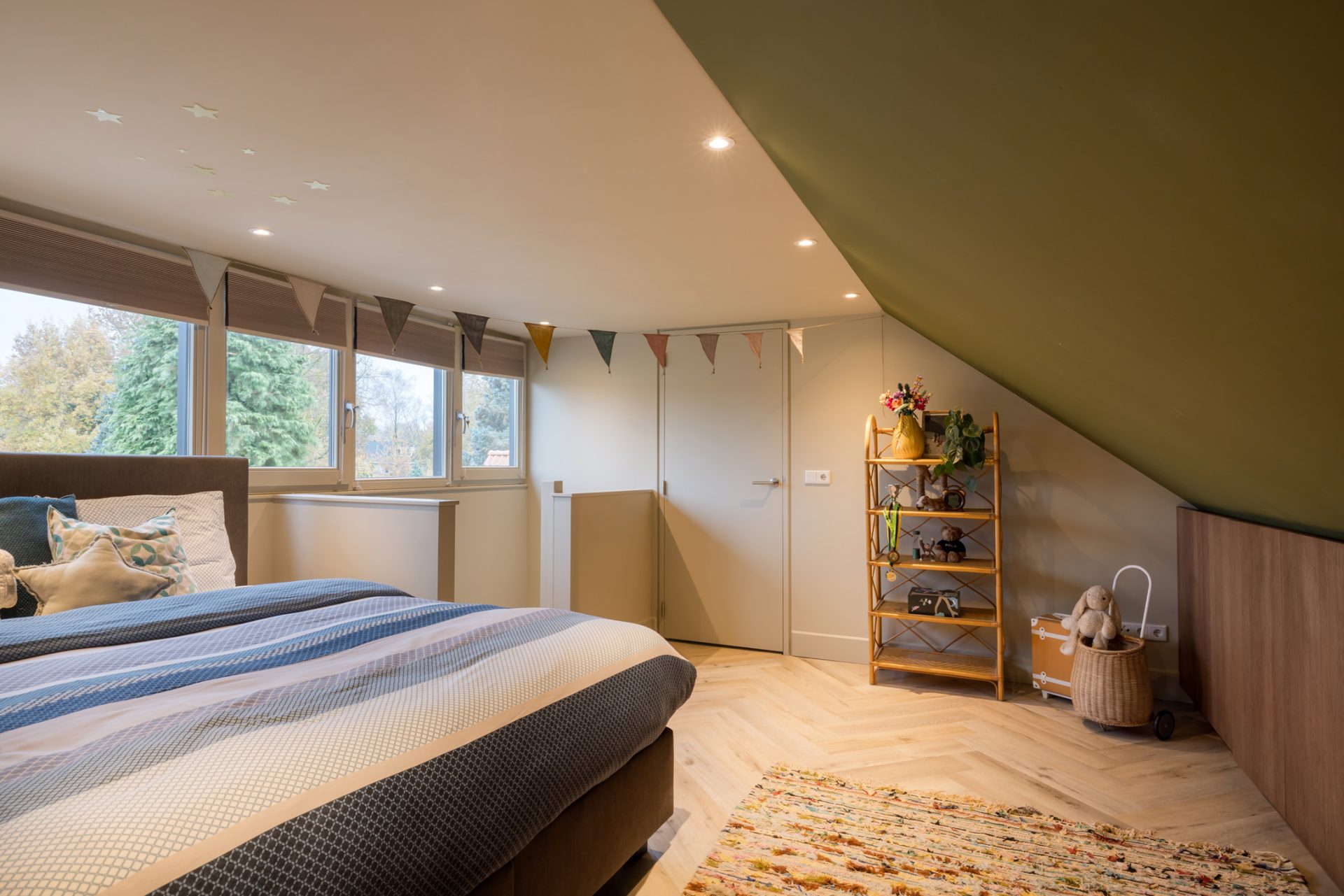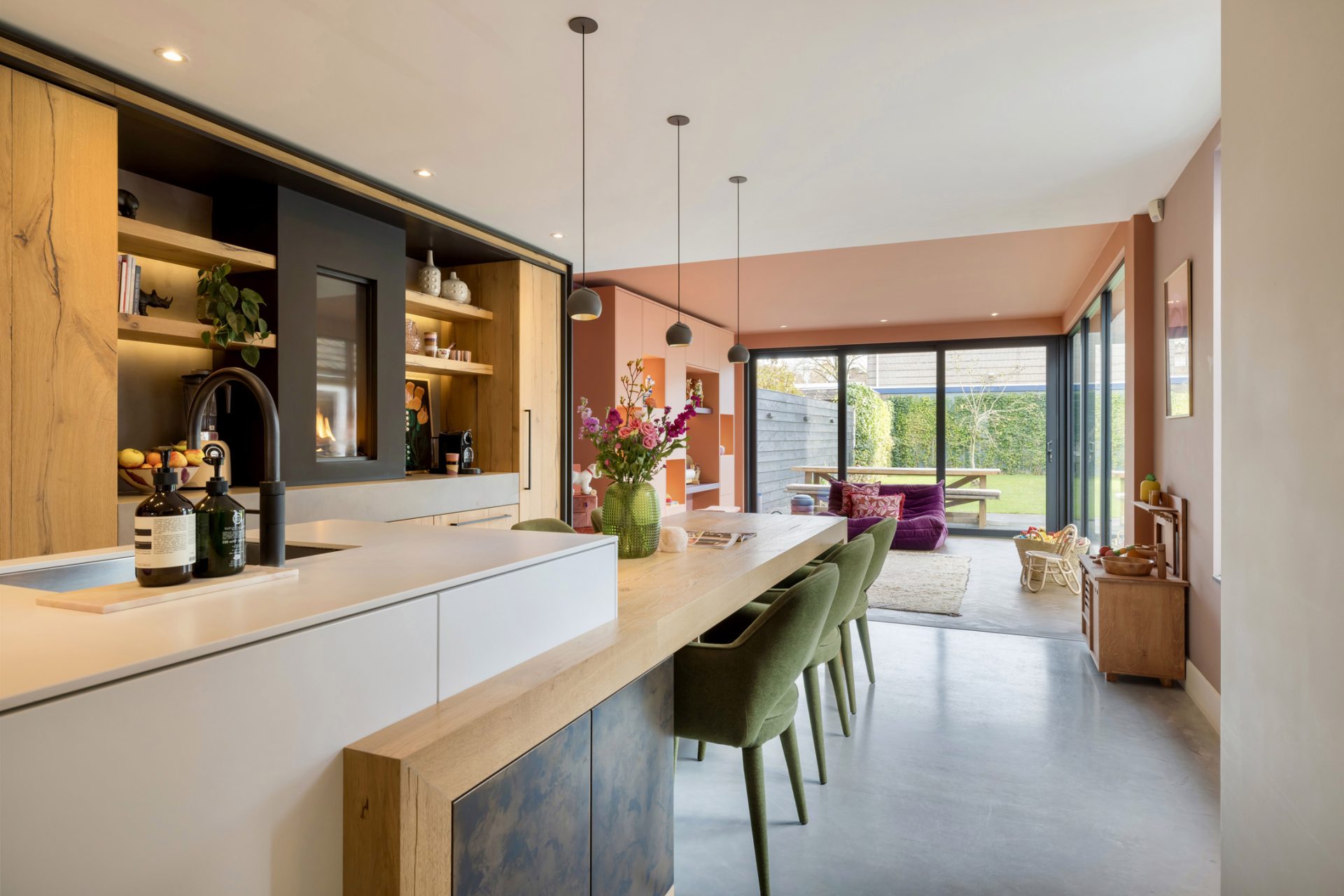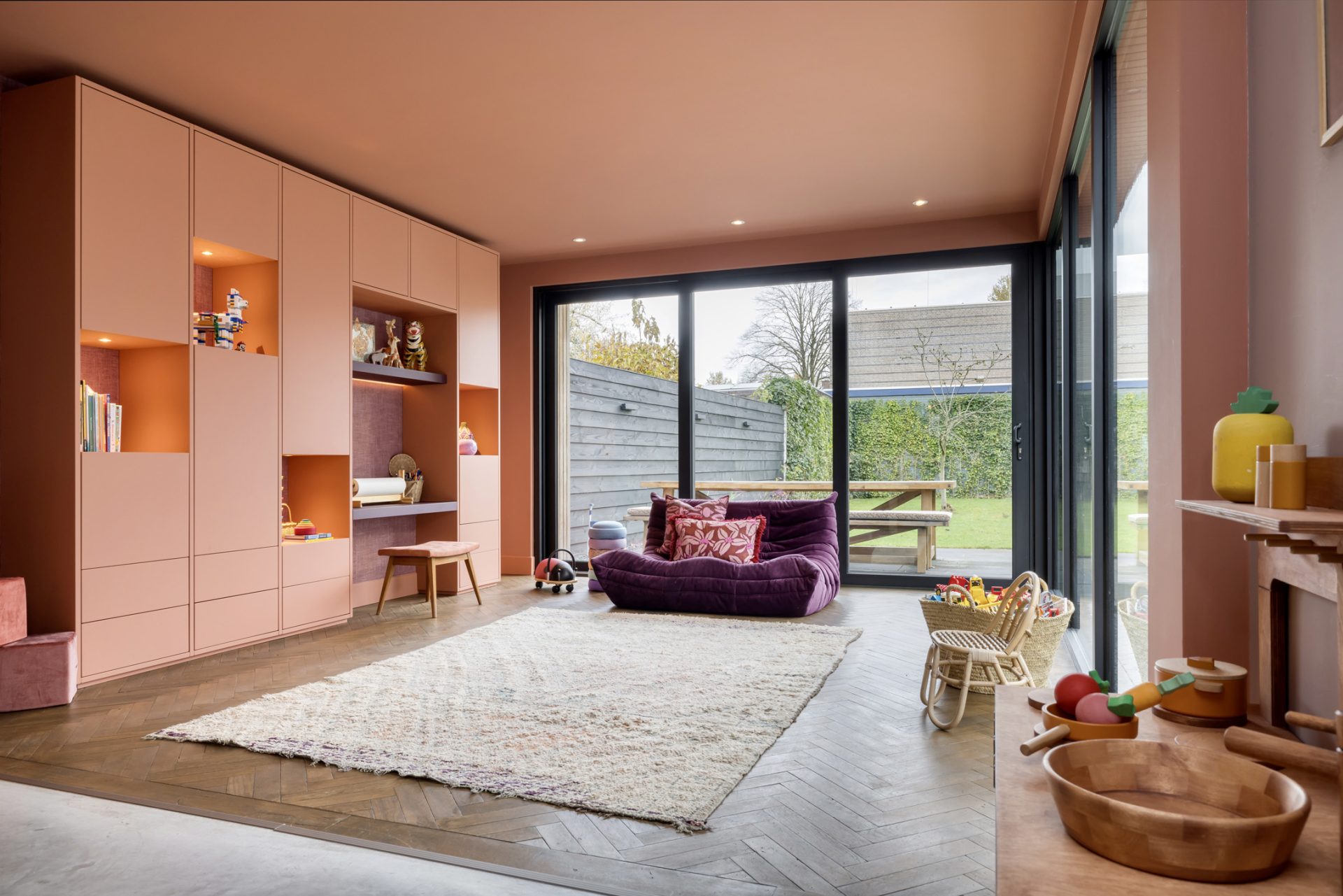 Het zitgedeelte, aan de voorzijde, is een heerlijke plek om naar een goede film, serie of documentaire te kijken. Aan de achterzijde is het speeldomein van de kinderen, met ramen tot vloerhoogte en een grote schuifpui naar de tuin. De kleur van de muren, het plafond en het maatwerk interieur is het toonbeeld van goede smaak en de visgraat parketvloer is een brok karakter.