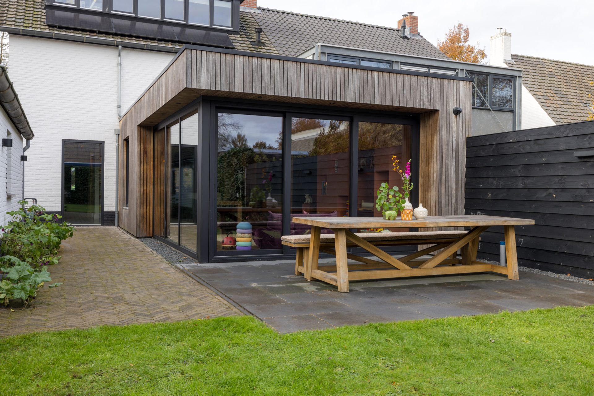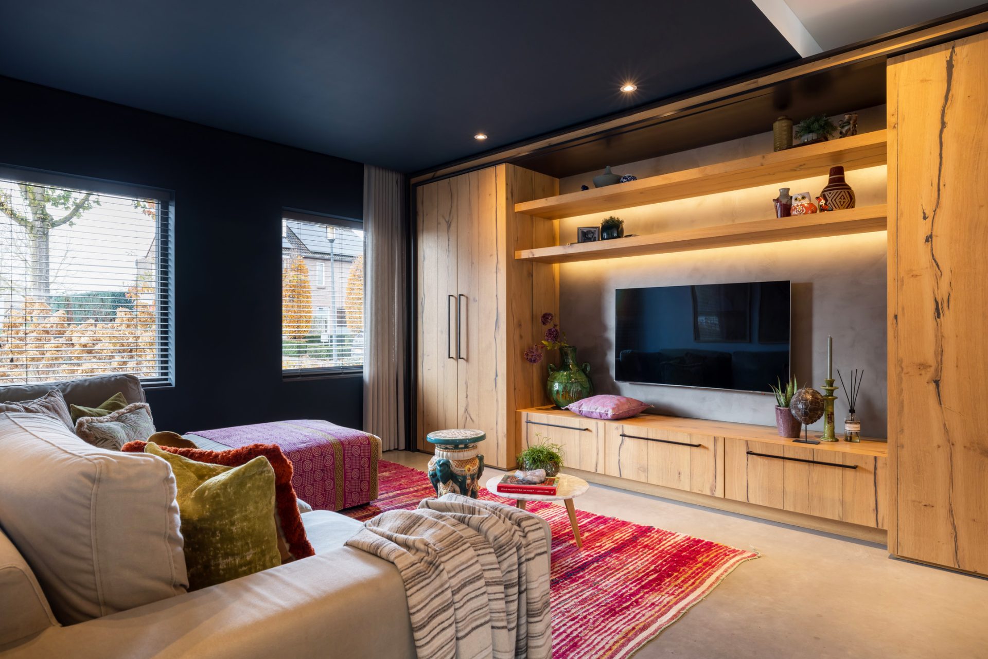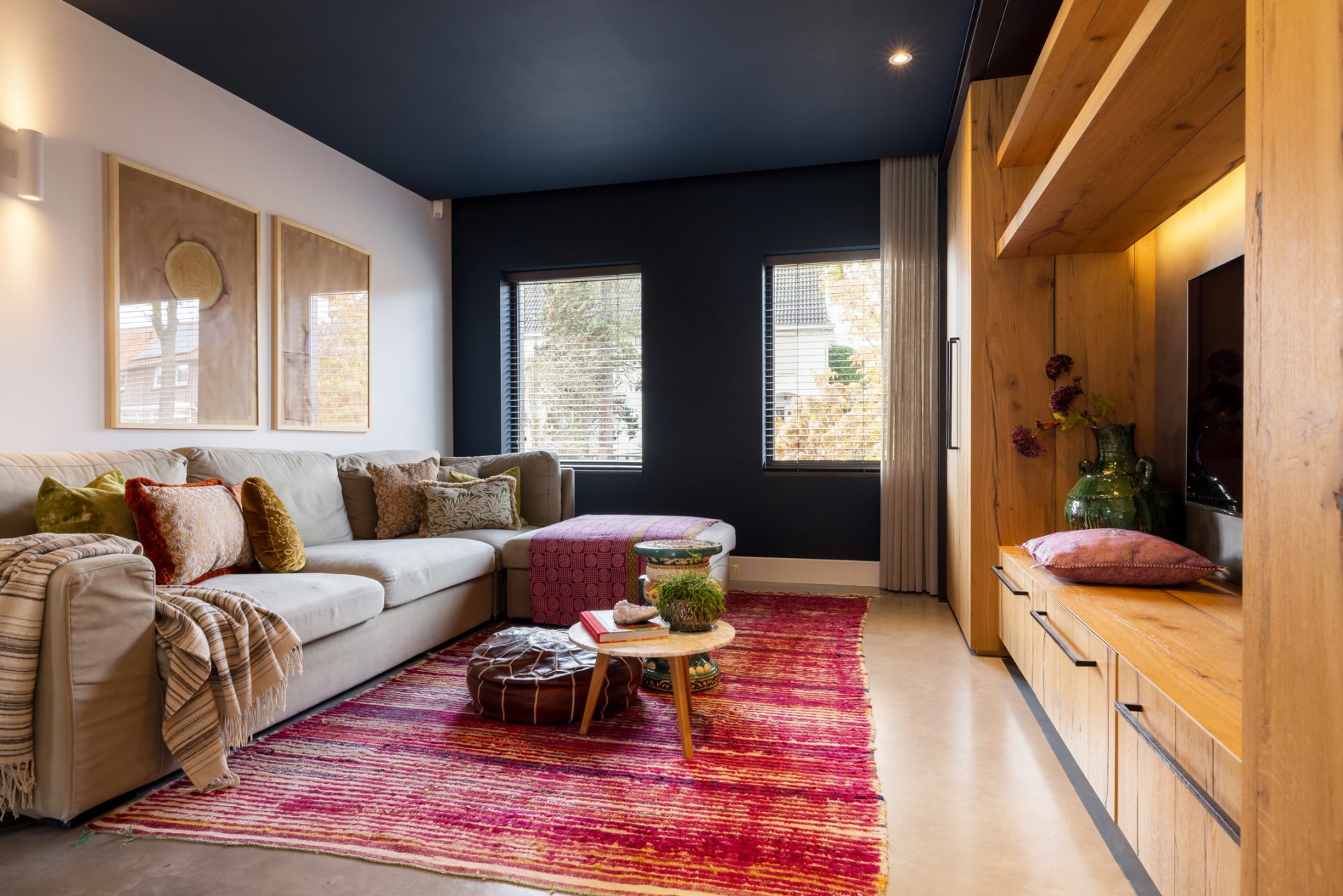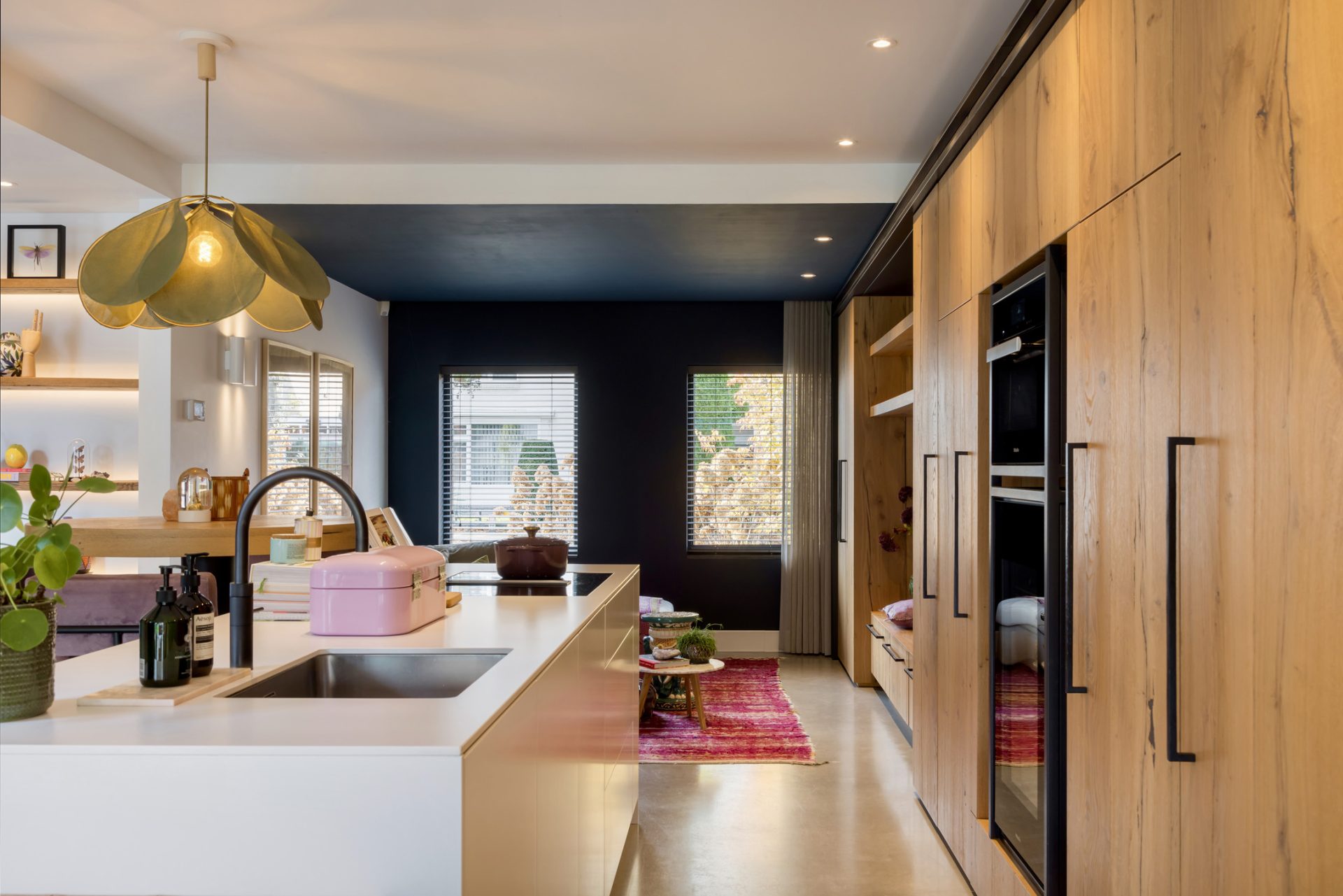 Het zitgedeelte, aan de voorzijde, is een heerlijke plek om naar een goede film, serie of documentaire te kijken. Aan de achterzijde is het speeldomein van de kinderen, met ramen tot vloerhoogte en een grote schuifpui naar de tuin. De kleur van de muren, het plafond en het maatwerk interieur is het toonbeeld van goede smaak en de visgraat parketvloer is een brok karakter.
