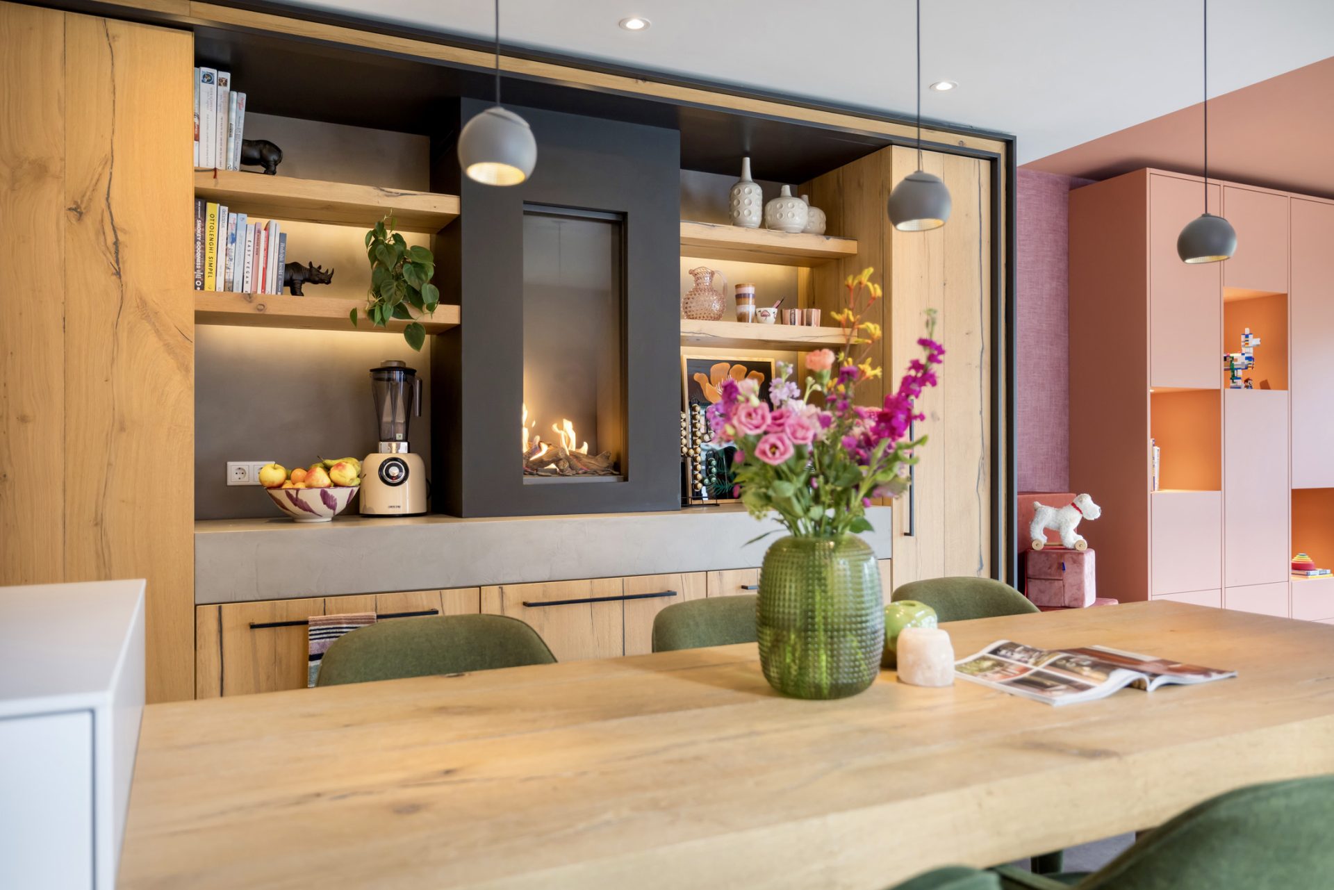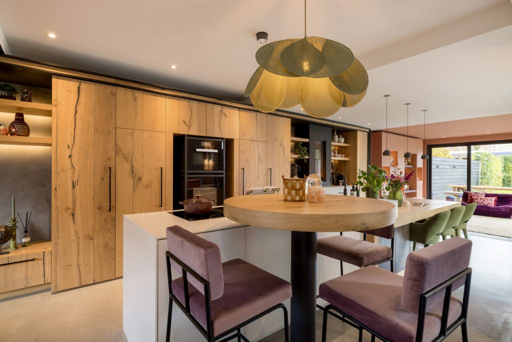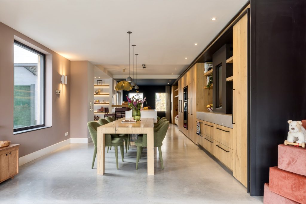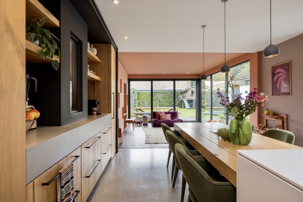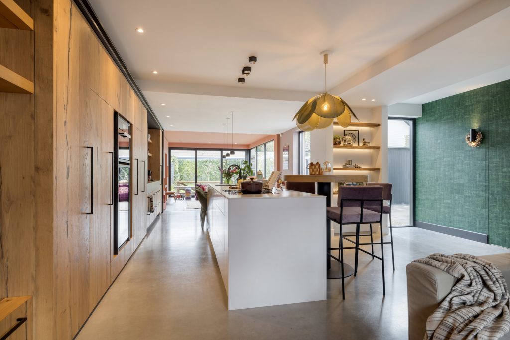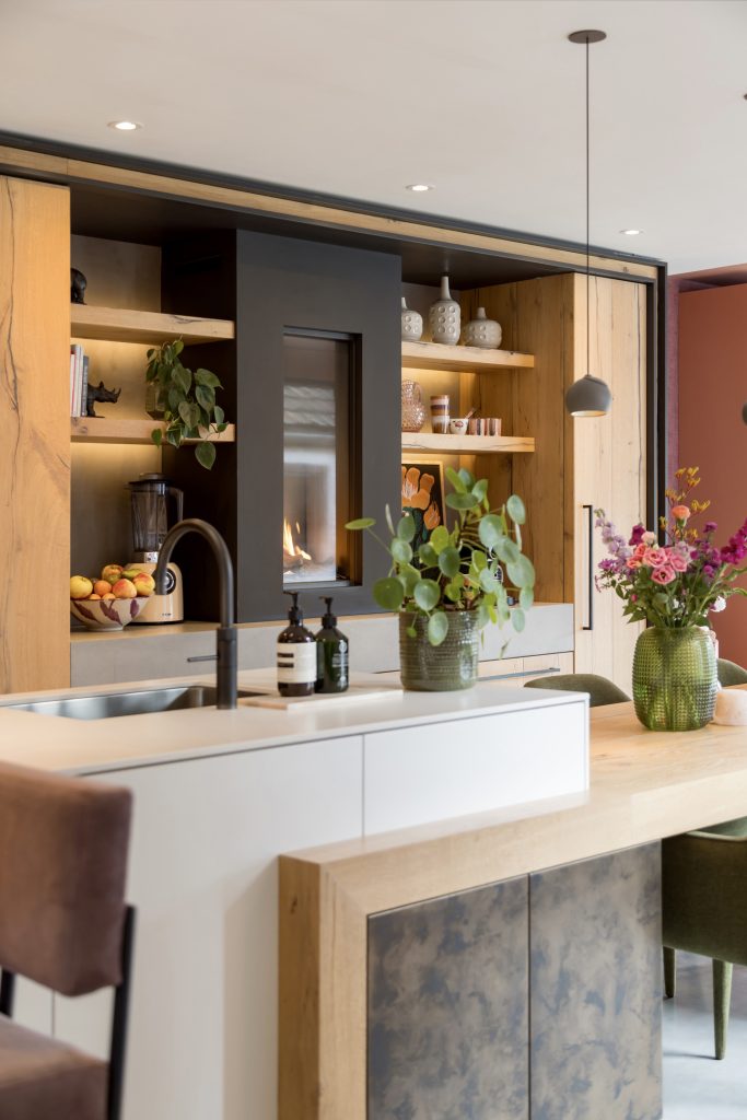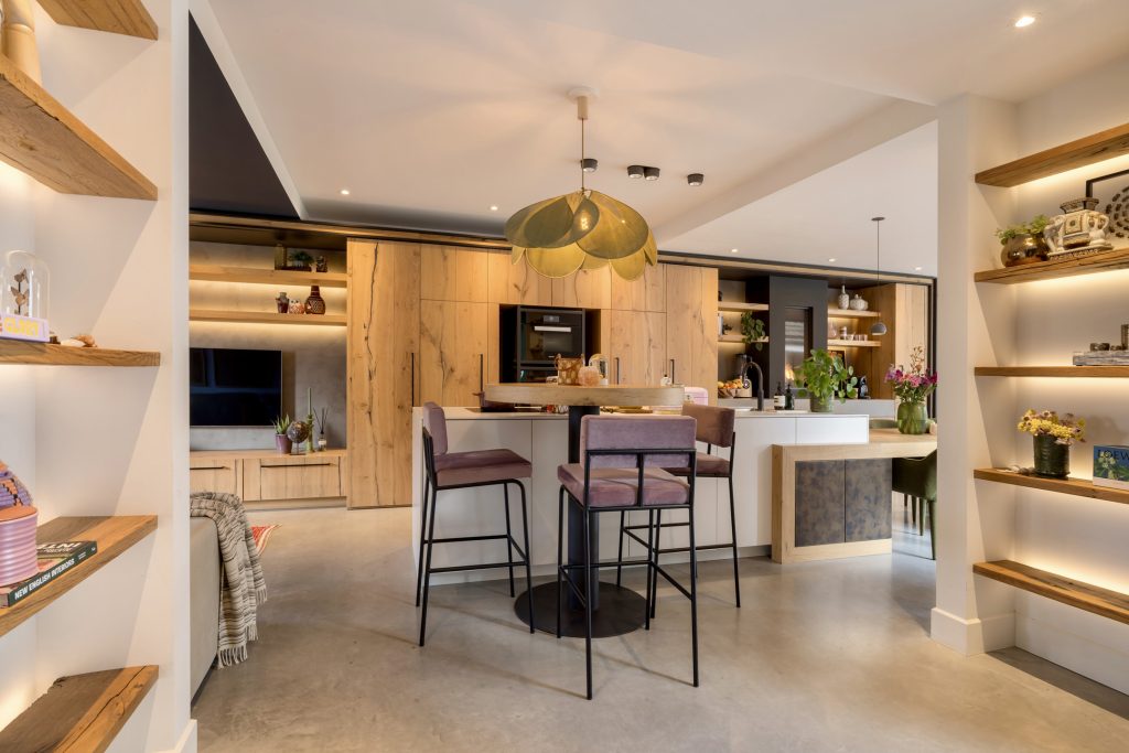 Een bronskleurige taatsdeur met glas verbindt de hal met de keuken, wat letterlijk het hart van het huis is. Aan twee kanten biedt een nis ruimte aan vijf houten planken, waar de favoriete woonaccessoires een plekje hebben gekregen. Over een lengte van ruim 10 meter is een maatwerk interieur gemaakt voor de keuken, zitkamer en eetkamer. Het kook-/spoeleiland en de eettafel zijn het toppunt van design en comfort, waar zes mensen kunnen eten en borrelen.