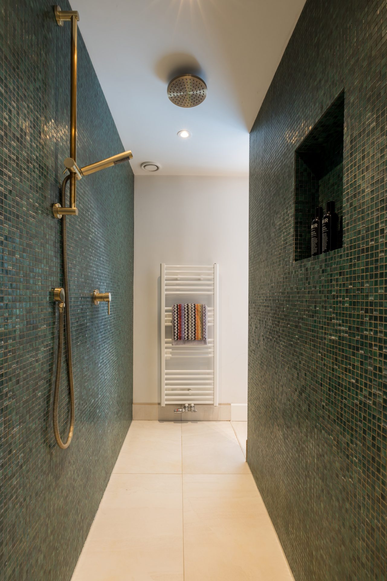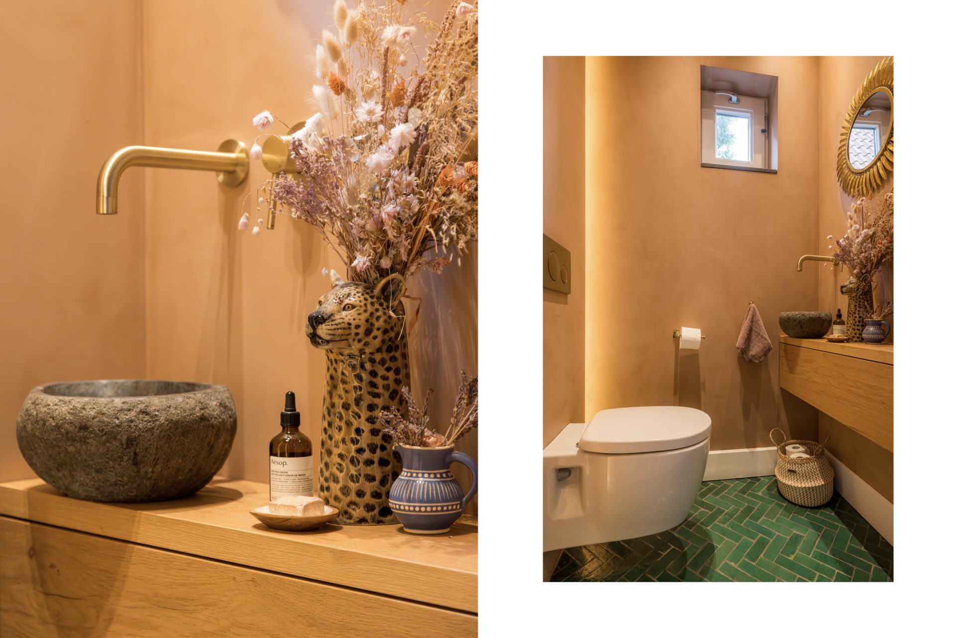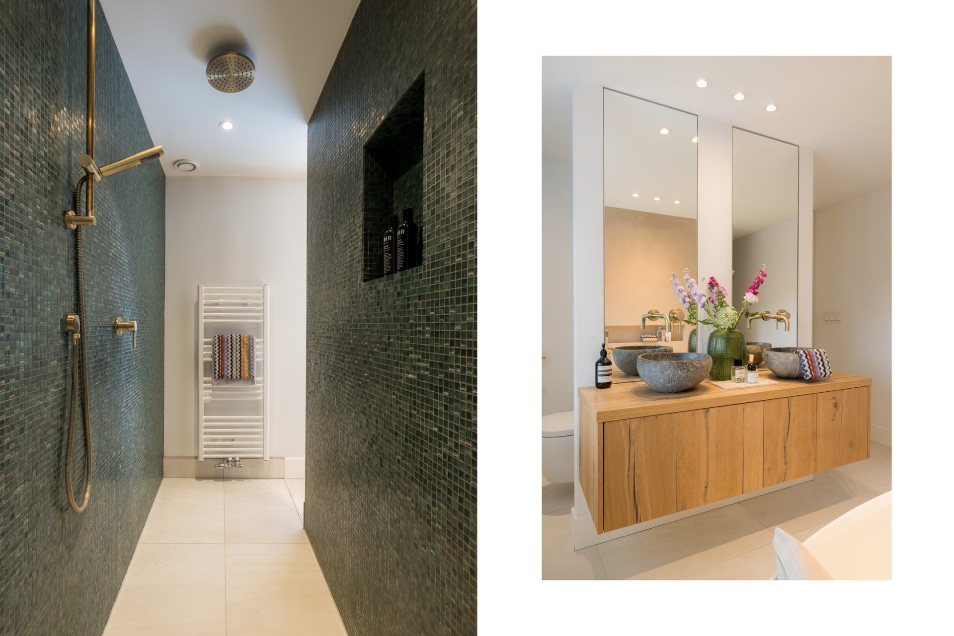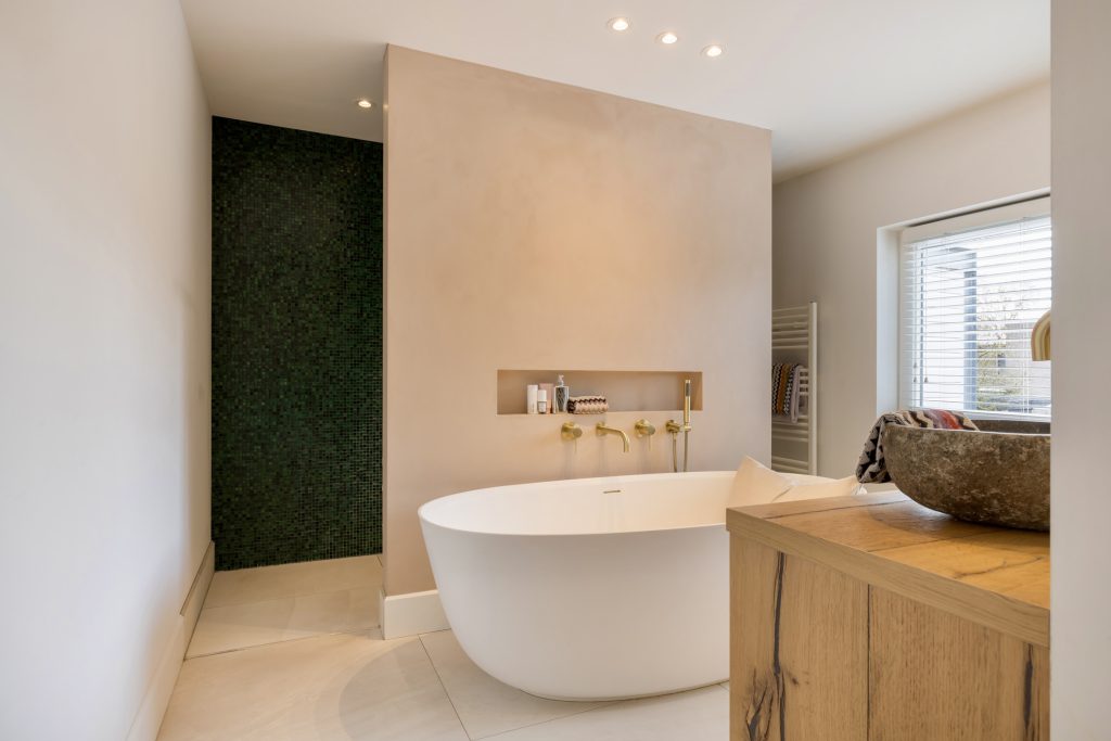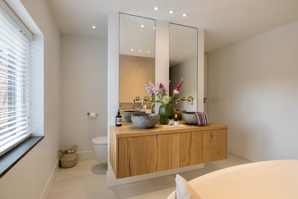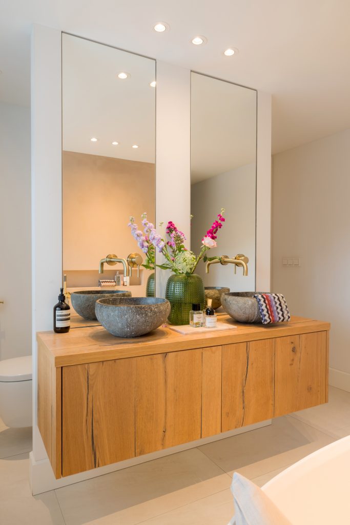 In de badkamer hangt een aangename rust, mede dankzij de gestucte muren en de lichte vloertegels. Je aandacht wordt getrokken door het vrijstaande bad, de goudkleurige kranen en de mozaïektegels in de dubbele inloopdouche. Op het houten meubel staan twee stenen waskommen en op een verscholen plek, achter een halfhoge muur, is het tweede toilet.