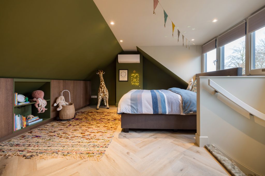 Een brede dakkapel aan de achterzijde zorgt voor extra ruimte op de tweede verdieping. Wat vroeger een donkere zolder was, is verbouwd tot een fantastische slaapkamer met airco en maatwerk kasten in de schuinte van het dak. Ook aan bergruimte is gedacht, naast de trap is een deur naar de berging.