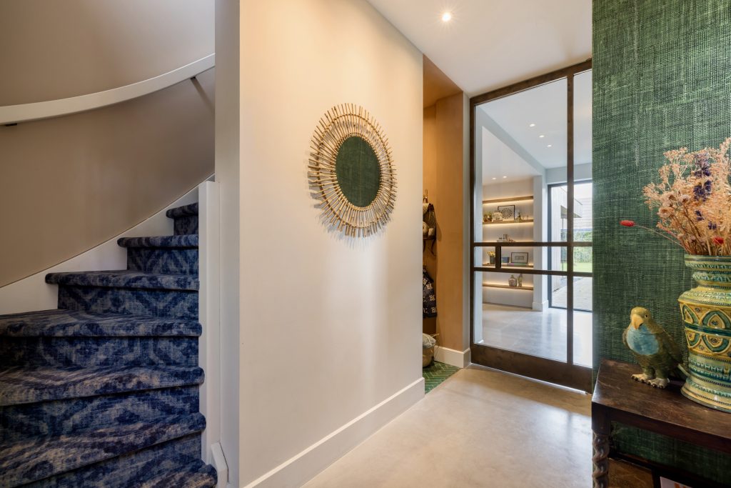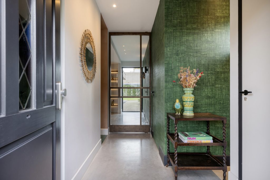 Links van de oprit is de antracietkleurige voordeur met panelen en een prachtig raam. Achter deze deur is de hal die, net als de rest van de woning, het toppunt van design is. Stucwerk is gecombineerd met stijlvol behang en onder de betonvloer ligt vloerverwarming. Aan de rechterzijde is de toiletruimte, die zo gepubliceerd kan worden is een lifestyle magazine. Onder de trap is de garderobe, waardoor de hal heel ruimtelijk oogt.