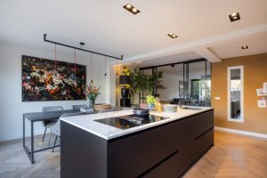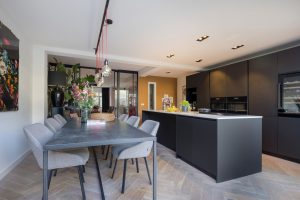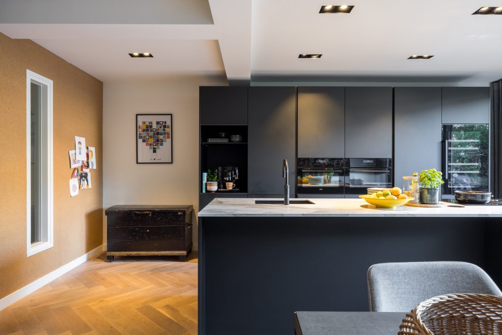 Via de karakteristieke voordeur bereikt u de uitnodigende ontvangsthal, voorzien van een garderobenis, meterkast, kelderkast en een modern toilet met fonteintje. De sfeervolle living aan de voorzijde beschikt over een erker en een gashaard. Aan de achterzijde is de woning over de volle breedte uitgebouwd en ingericht met een royale woonkeuken met schuifpui naar de tuin. De keuken is uitgerust met een kookeiland met werkbladafzuiging, inductiekookplaat, Quooker, combi-oven, stoomoven, koel-/vriescombinatie, wijnklimaatkast en volop bergruimte.
