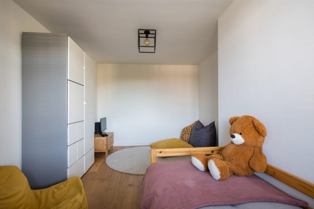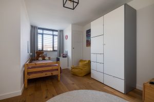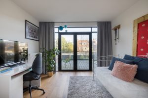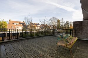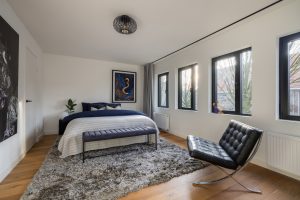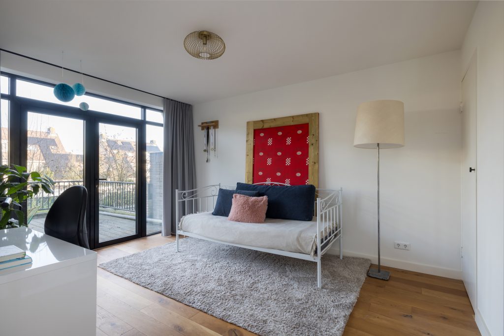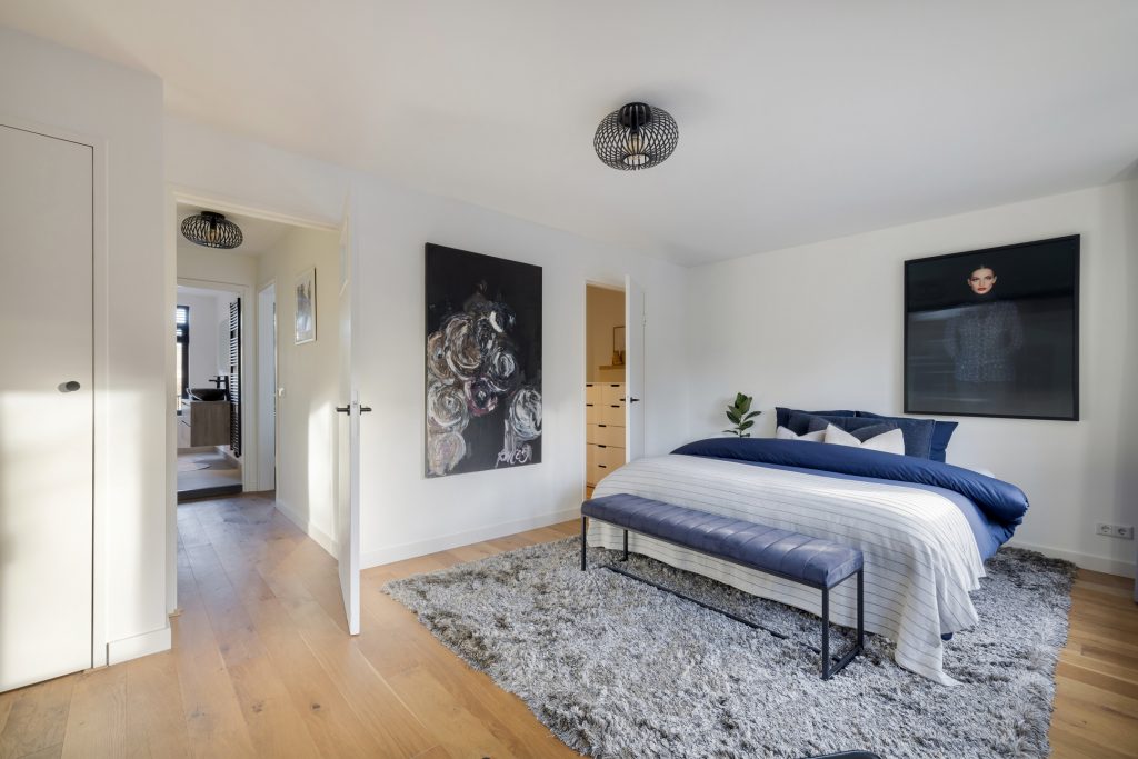 Vanaf de overloop zijn twee ruime slaapkamers bereikbaar. De master bedroom (ca. 20 m²) strekt zich uit over de volledige breedte en is voorzien van een inloopkast. De tweede slaapkamer (ca. 14 m²) beschikt over een inbouwkast en openslaande deuren naar een royaal dakterras van circa 24 m². De luxe badkamer is ingericht met een inloopdouche, dubbel wastafelmeubel, tweede toilet en een designradiator.