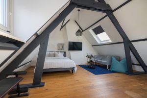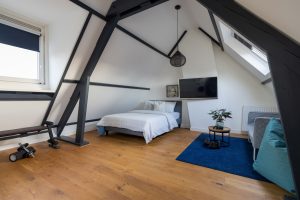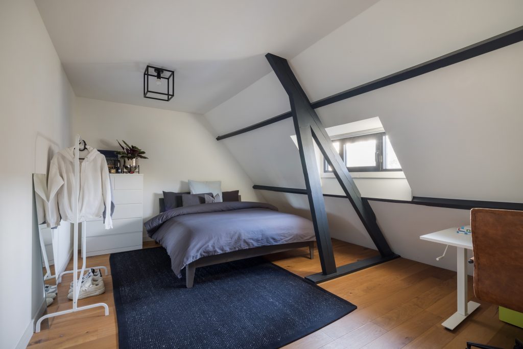 De zolderverdieping is een indrukwekkende, open ruimte met zichtbare balkconstructie, twee dakramen aan de voorzijde en een dakkapel aan de achterzijde. Hier bevinden zich de opstelling van de cv-ketel, de hybride warmtepomp (2023) en de aansluitingen voor wasmachine en droger. De ruimte biedt volop mogelijkheden voor diverse gebruiksdoeleinden.