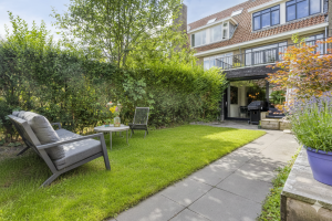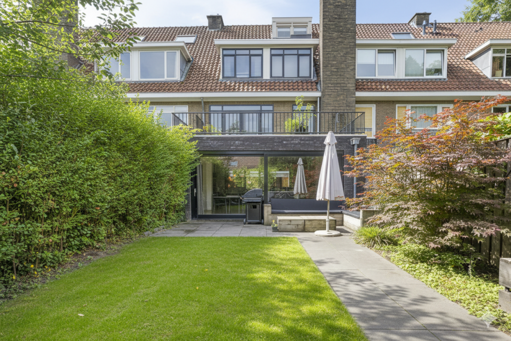 De diepe, volledig omsloten achtertuin is ingericht met een ruim betegeld terras en bereikbaar via een extra brede achterom. Dankzij de vrije ligging en de diepte van het perceel geniet u hier van volop privacy en zon.