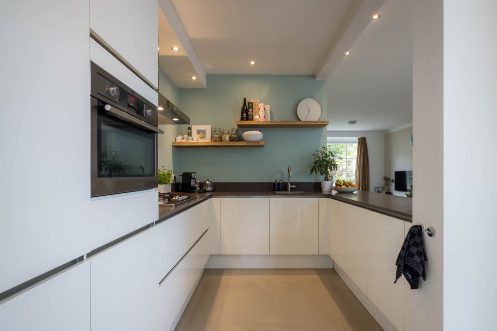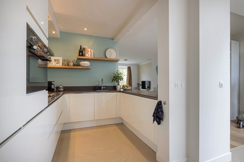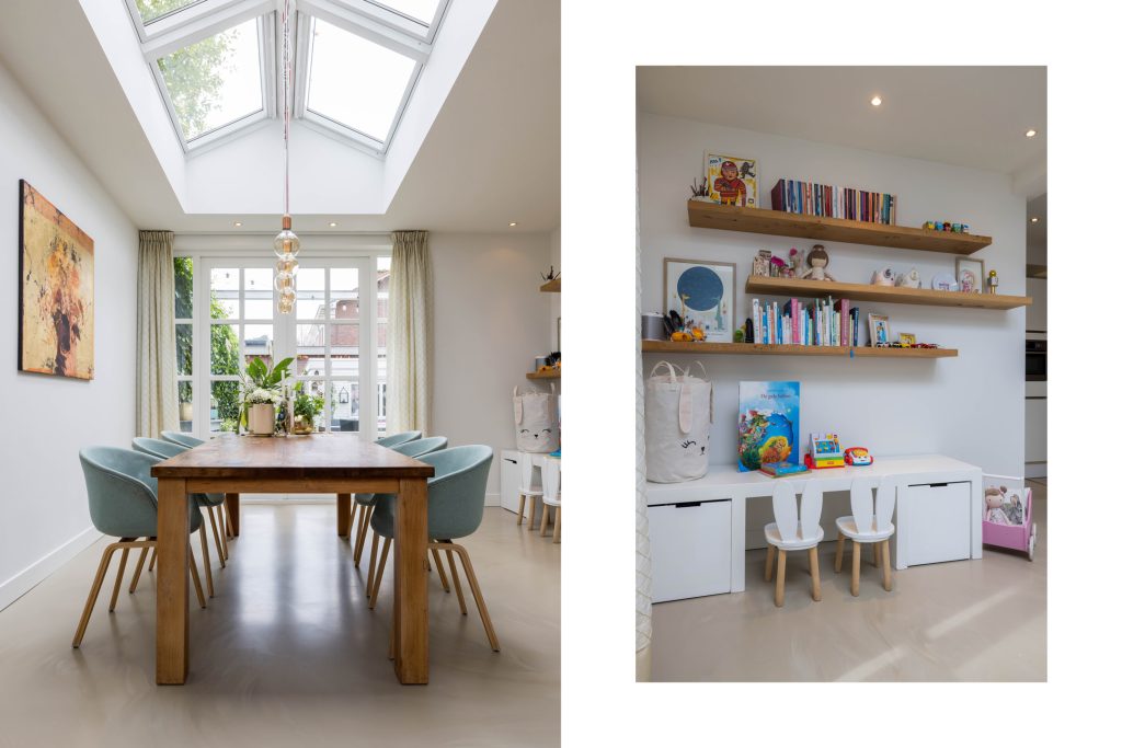 De woonkamer met eikenhouten vloer staat in verbinding met de keuken en de aangebouwde, lichte eetkamer. Het resultaat is een ruime, lichte en bovenal sfeervolle leefruimte met een gashaard, lichtstraat en openslaande deuren naar de tuin. In de halfopen keuken staat een stijlvolle U-opstelling met een grote eetbar en alle benodigde inbouwapparatuur, perfect voor de kookliefhebber. De keuken grenst aan een tweede entree, die wordt gebruikt als de bewoners met de fiets thuiskomen.