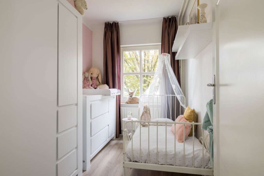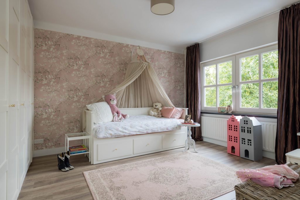 Stijl en comfort zijn ook volop aanwezig op de eerste verdieping. Op de overloop zie je mooie paneeldeuren, die toegang geven tot drie slaapkamers en de badkamer. Alle slaapkamers, waarvan een met een kastenwand, zijn ingericht als prachtige kinderkamers. Behang is gecombineerd met stucwerk, met een smaakvol resultaat.