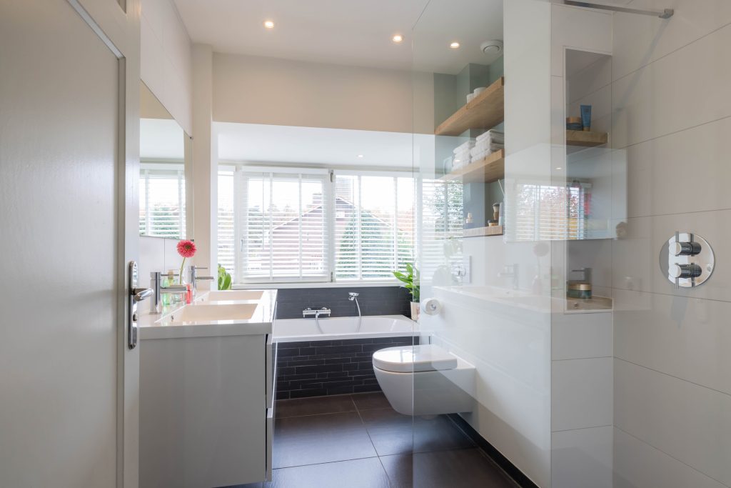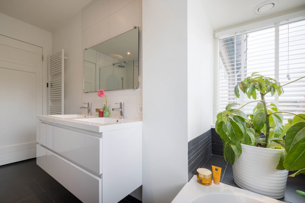 De badkamer met fijne vloerverwarming is ingedeeld met een ligbad, inloopdouche, wandcloset en een dubbel wastafelmeubel. Zo kunnen de kinderen samen tanden poetsen, heerlijk in bad en genieten van een heerlijke douche.