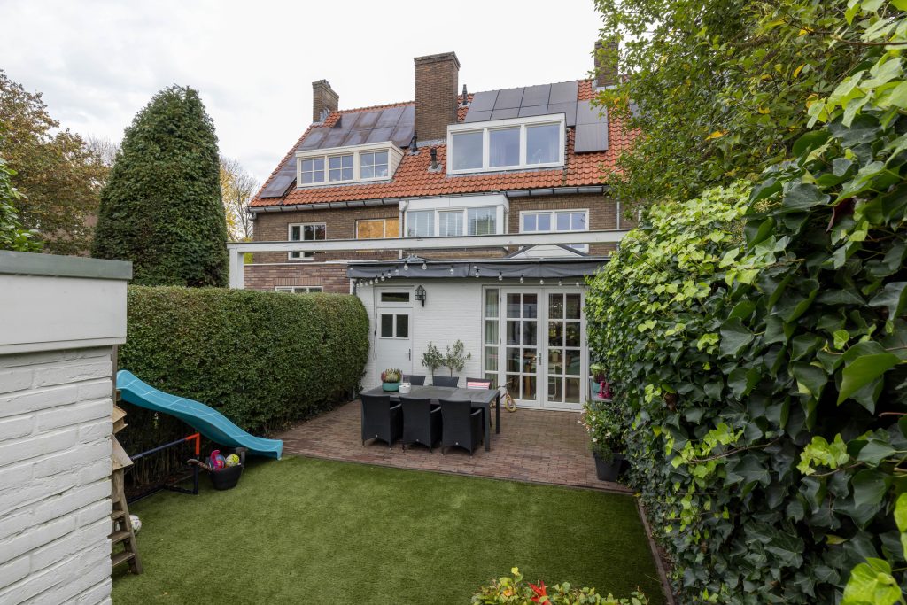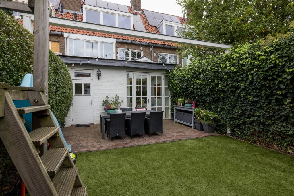 De voortuin met beukenhaag, hortensia’s en leibomen draagt bij aan de fantastische uitstraling van deze karakteristieke woning. Vanuit de eetkamer en tweede hal is de achtertuin op het zonnige zuiden te bereiken. Het grote terras met zonwering grenst aan het kunstgras, waar de kinderen kunnen voetballen en hockeyen. De berging biedt ruimte aan de (kinder)fietsen en er is een poort naar de steeg. De trap leidt niet alleen naar de glijbaan, maar ook naar het speelhuis.