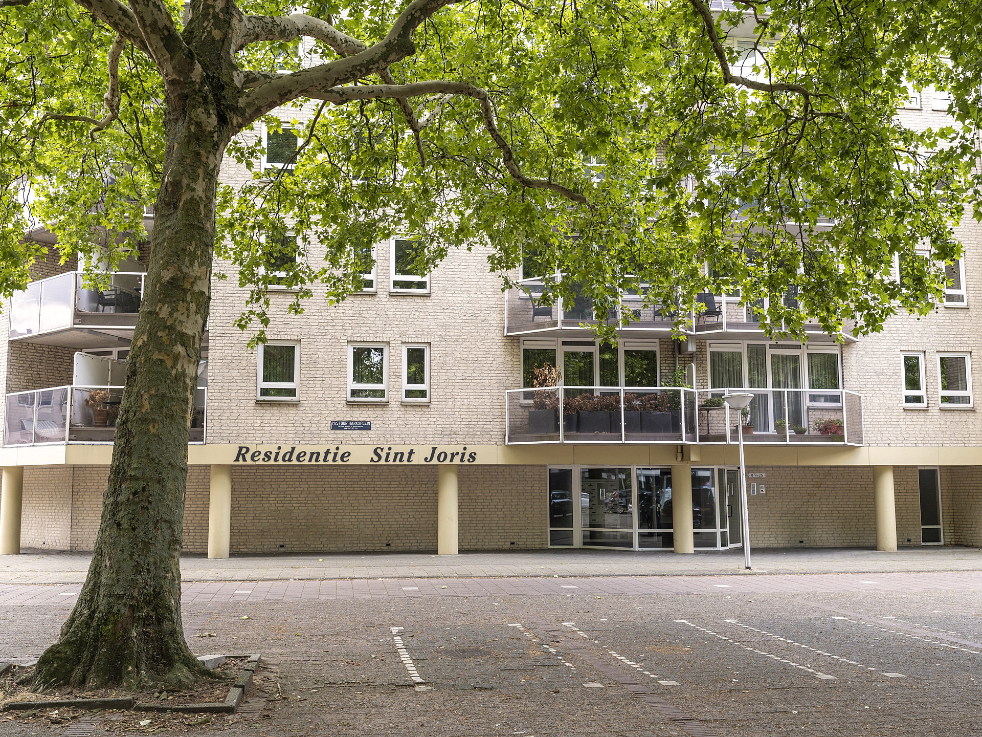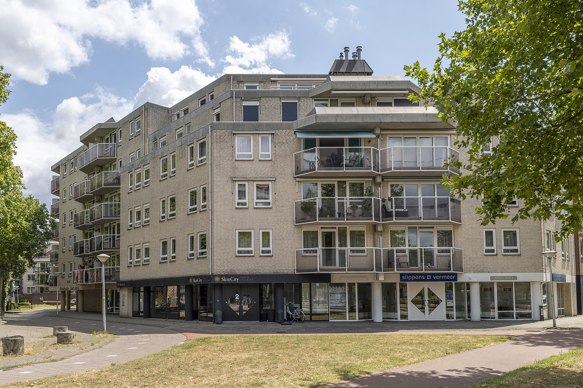 Residentie Sint Joris is een stijlvol appartementengebouw uit de jaren ’90, op een prachtige plek in Eindhoven. Hoge bomen, de imposante Sint-Joriskerk en het Parktheater bepalen de sfeer in deze geliefde woonomgeving in de Lichtstad. Uw oog valt op de entree van het gebouw met het bellentableau, de video-intercom en de brievenbussen. Met de lift gaat u naar de vijfde, tevens bovenste verdieping om kennis te maken met dit fantastische penthouse.