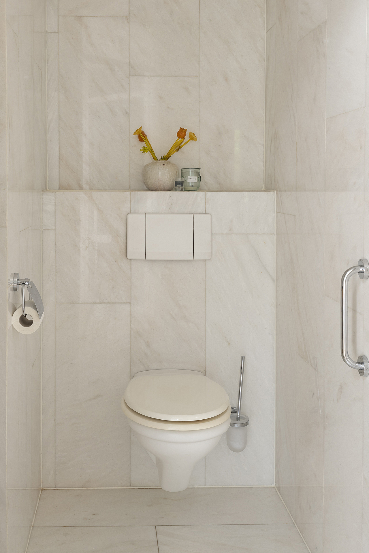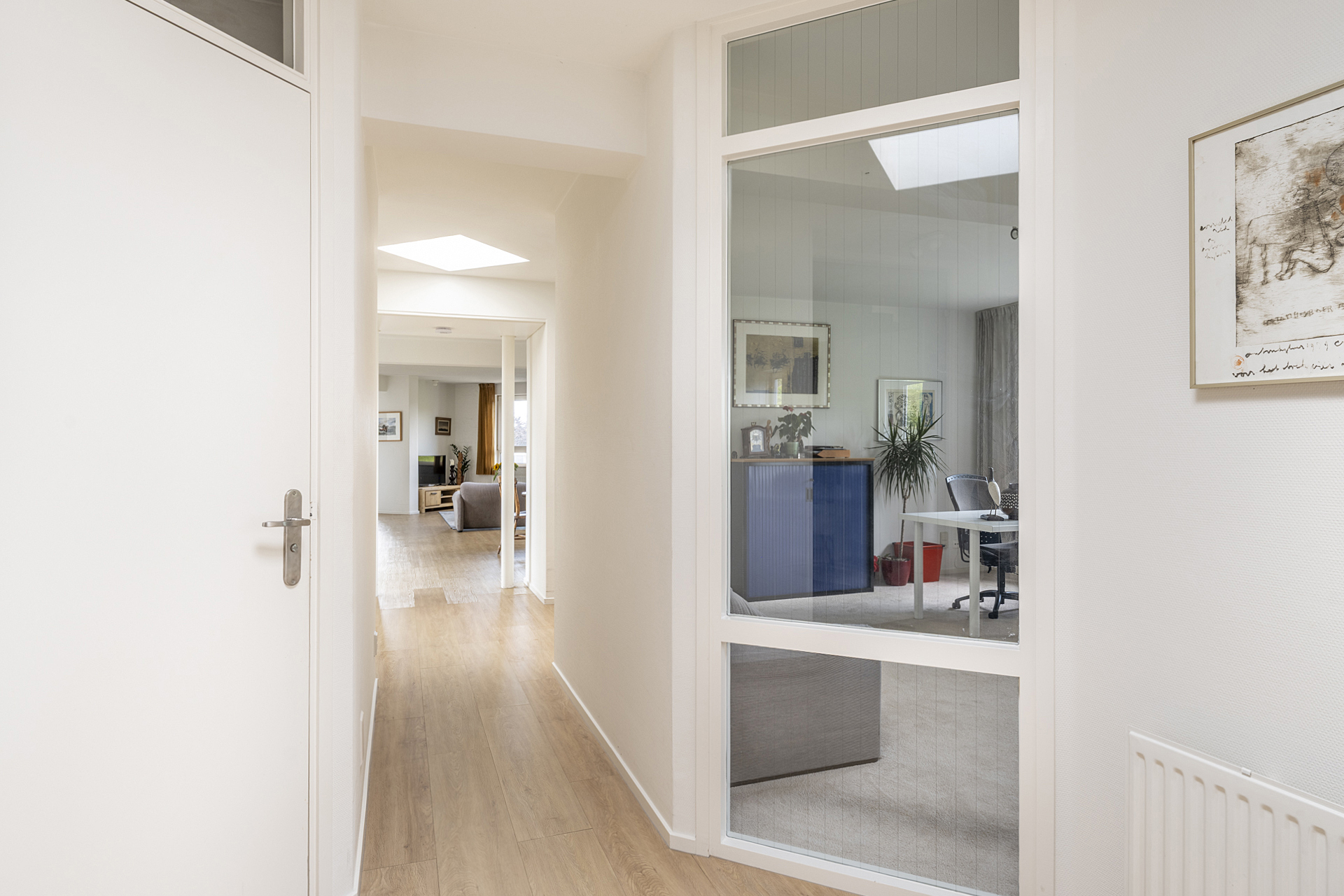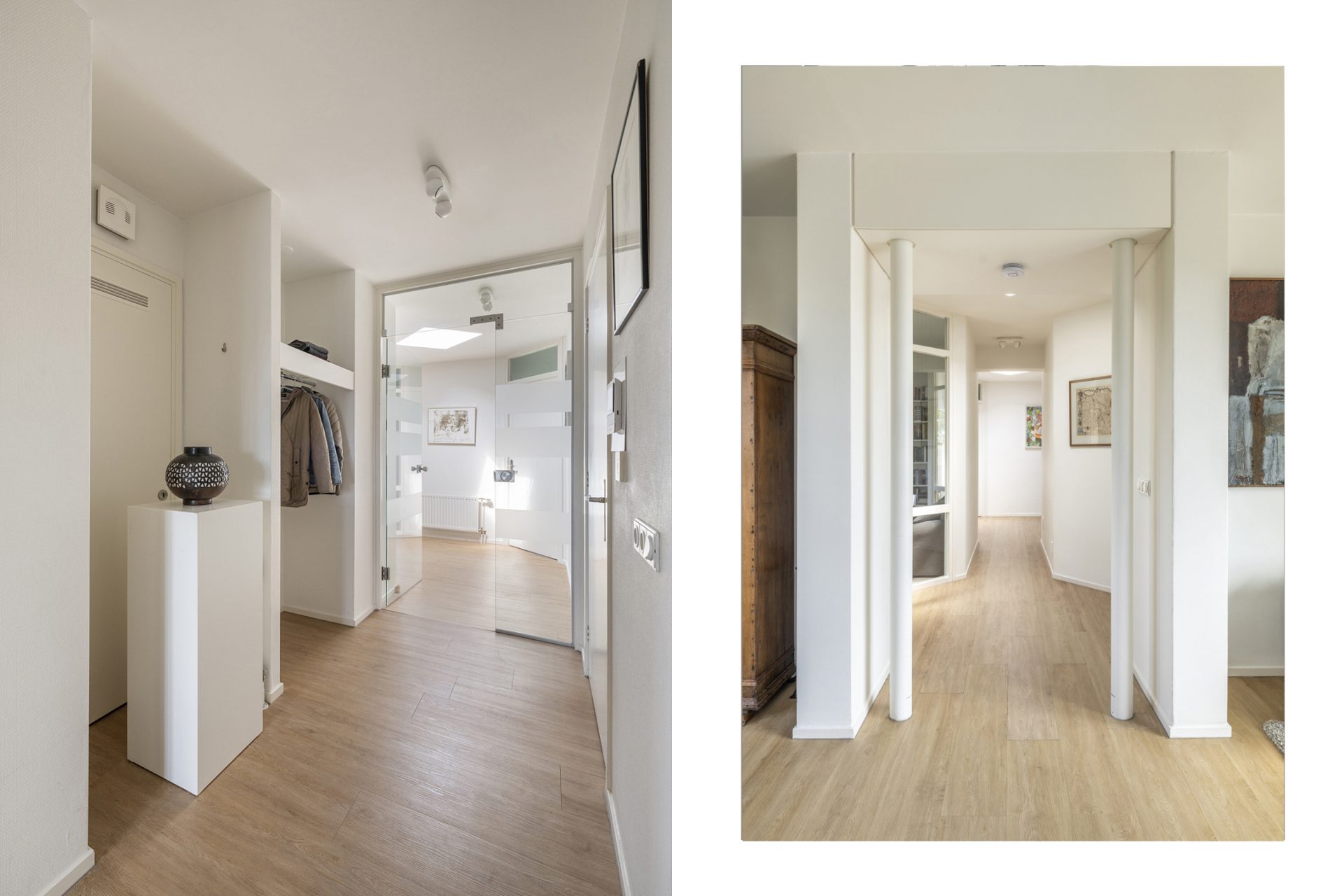 Bij binnenkomst valt direct de ruimtelijke indeling op, met speelse hoekjes en aangenaam lichtinval. Bij de ontvangsthal geeft bevinden zich de meterkast, en een inpandige berging en de garderobe. Achter de glazen deur is de tweede hal, met een lichtkoepel in het platte dak en het gastentoilet.