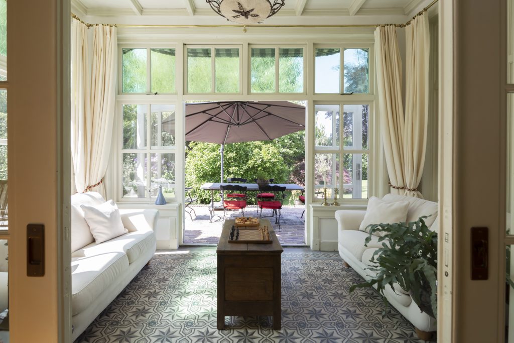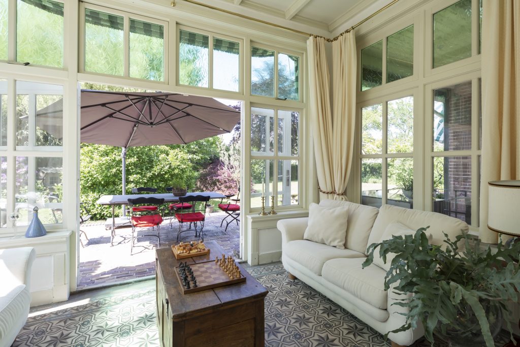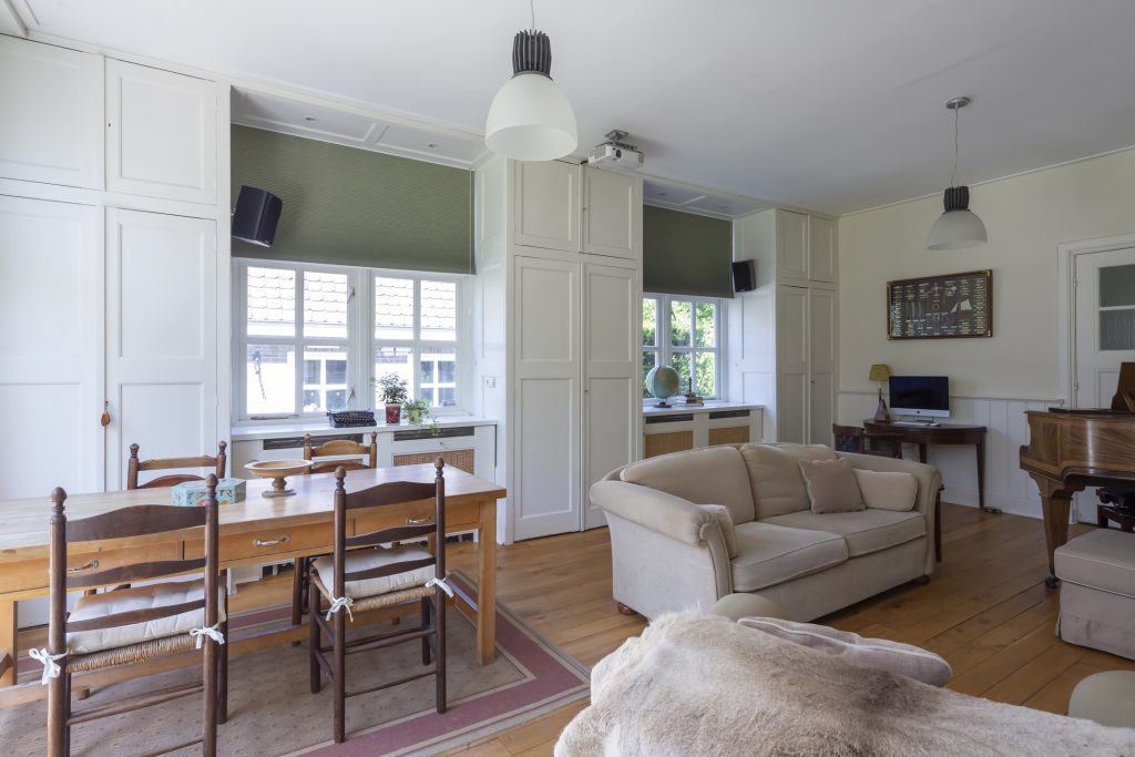 Aan de linkerzijde is de woonkamer en-suite, waar de pure schoonheid en rijkdom tot uiting komt. De voorkamer met erker en schouw, waar een houtkachel staat, nodigt uit voor een goed glas wijn en uw favoriete muziek. De aansluitende eetkamer staat in verbinding met de lichte serre, waar u optimaal profiteert van de zon.