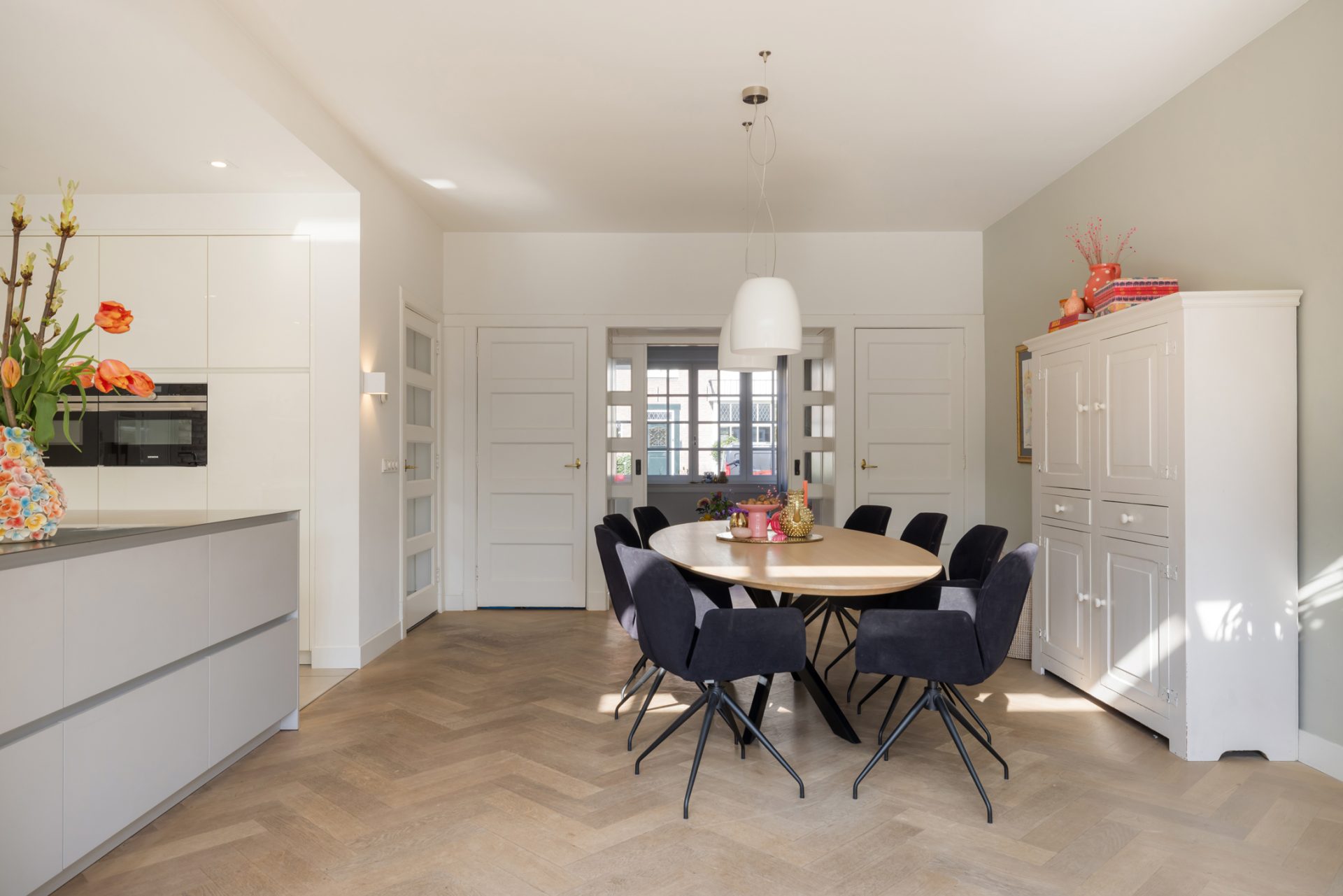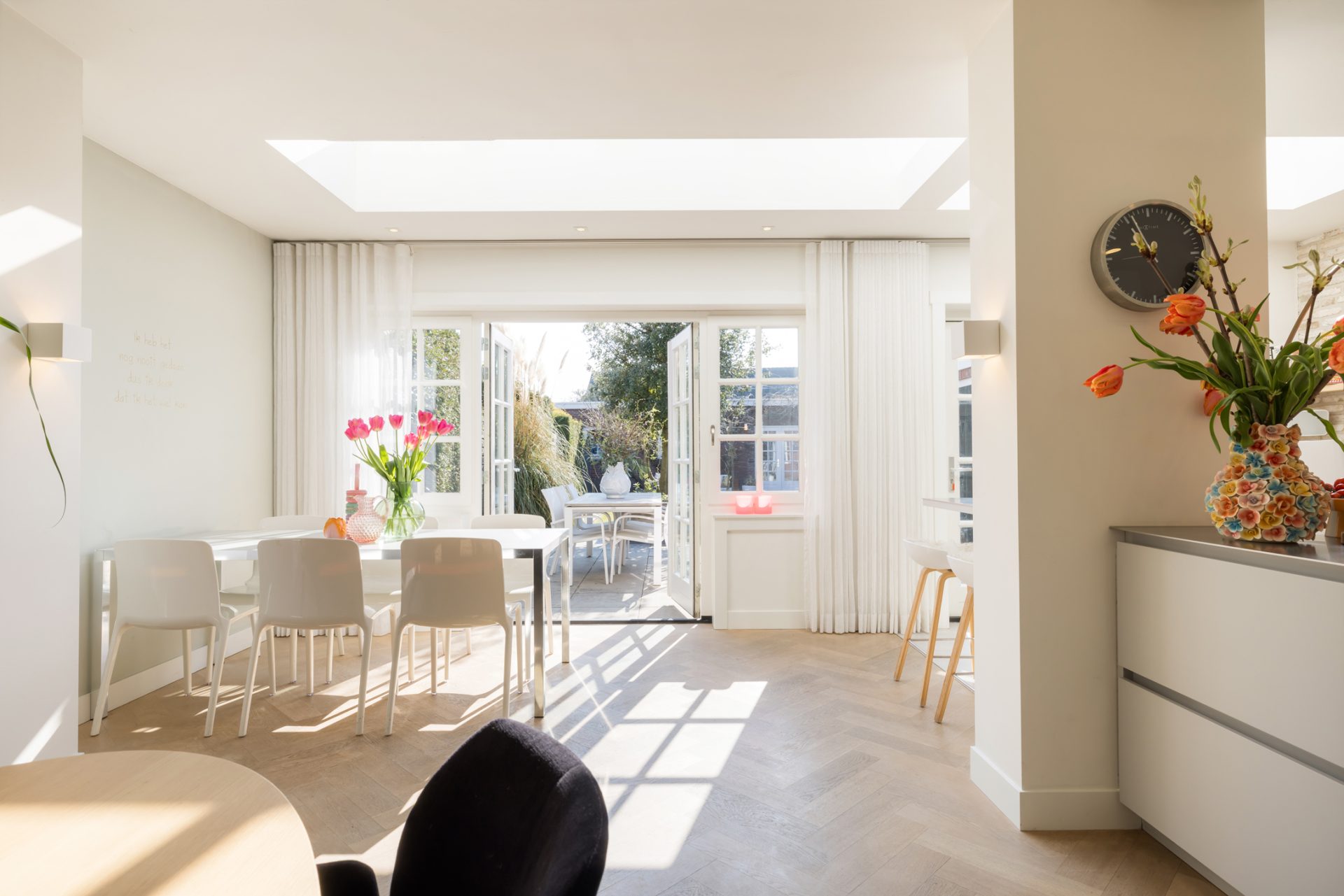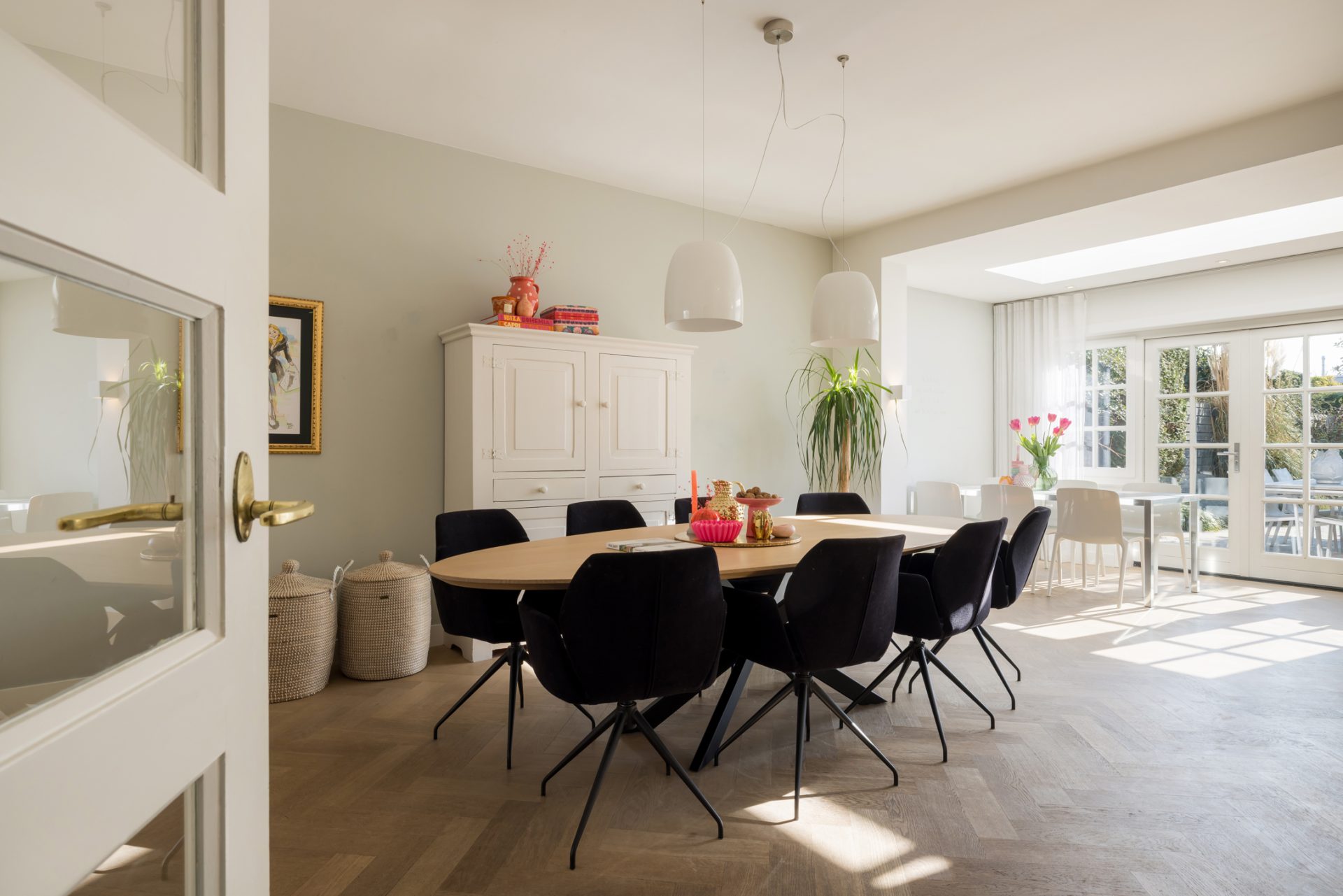 Een visgraatparketvloer, fraaie en-suite deuren en strak stucwerk maken van de woonkamer een leefruimte van pure schoonheid. Het zitgedeelte ligt aan de voorzijde; het zeer royale eetgedeelte vormt samen met de keuken één geheel en geeft het gevoel van een woonkeuken. De aanbouw met lichtstraat en dubbele tuindeuren biedt momenteel ruimte aan een tweede eetplek, maar leent zich ook uitstekend als extra zithoek of muziekruimte.