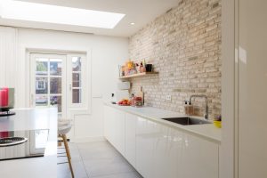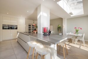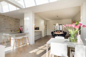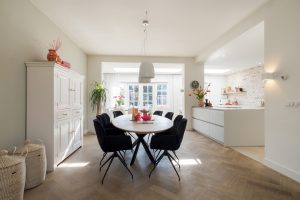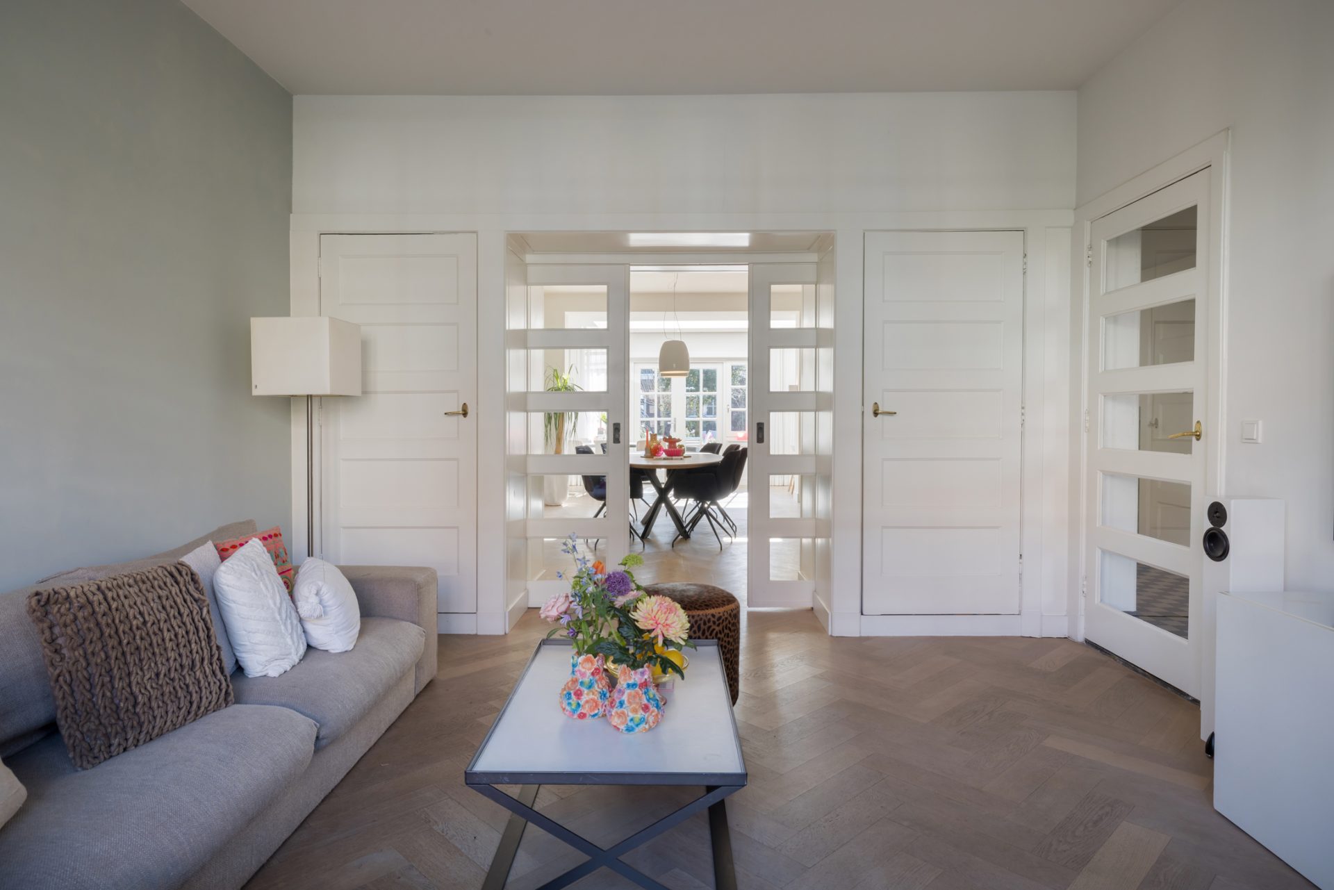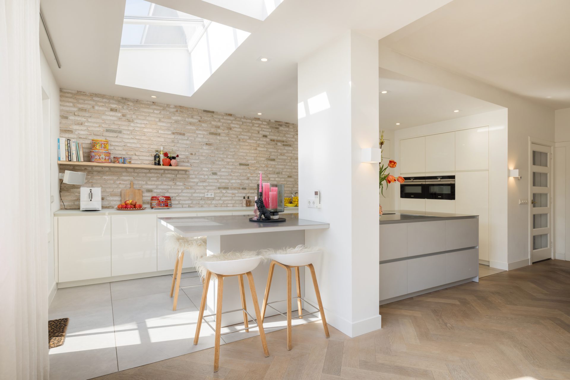 Een visgraatparketvloer, fraaie en-suite deuren en strak stucwerk maken van de woonkamer een leefruimte van pure schoonheid. Het zitgedeelte ligt aan de voorzijde; het zeer royale eetgedeelte vormt samen met de keuken één geheel en geeft het gevoel van een woonkeuken. De aanbouw met lichtstraat en dubbele tuindeuren biedt momenteel ruimte aan een tweede eetplek, maar leent zich ook uitstekend als extra zithoek of muziekruimte.