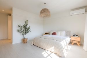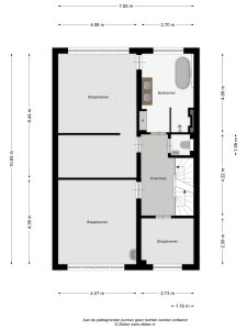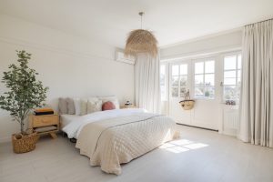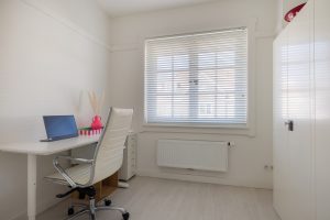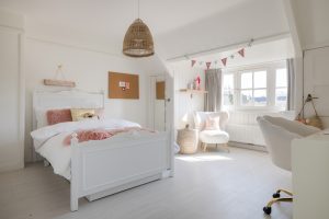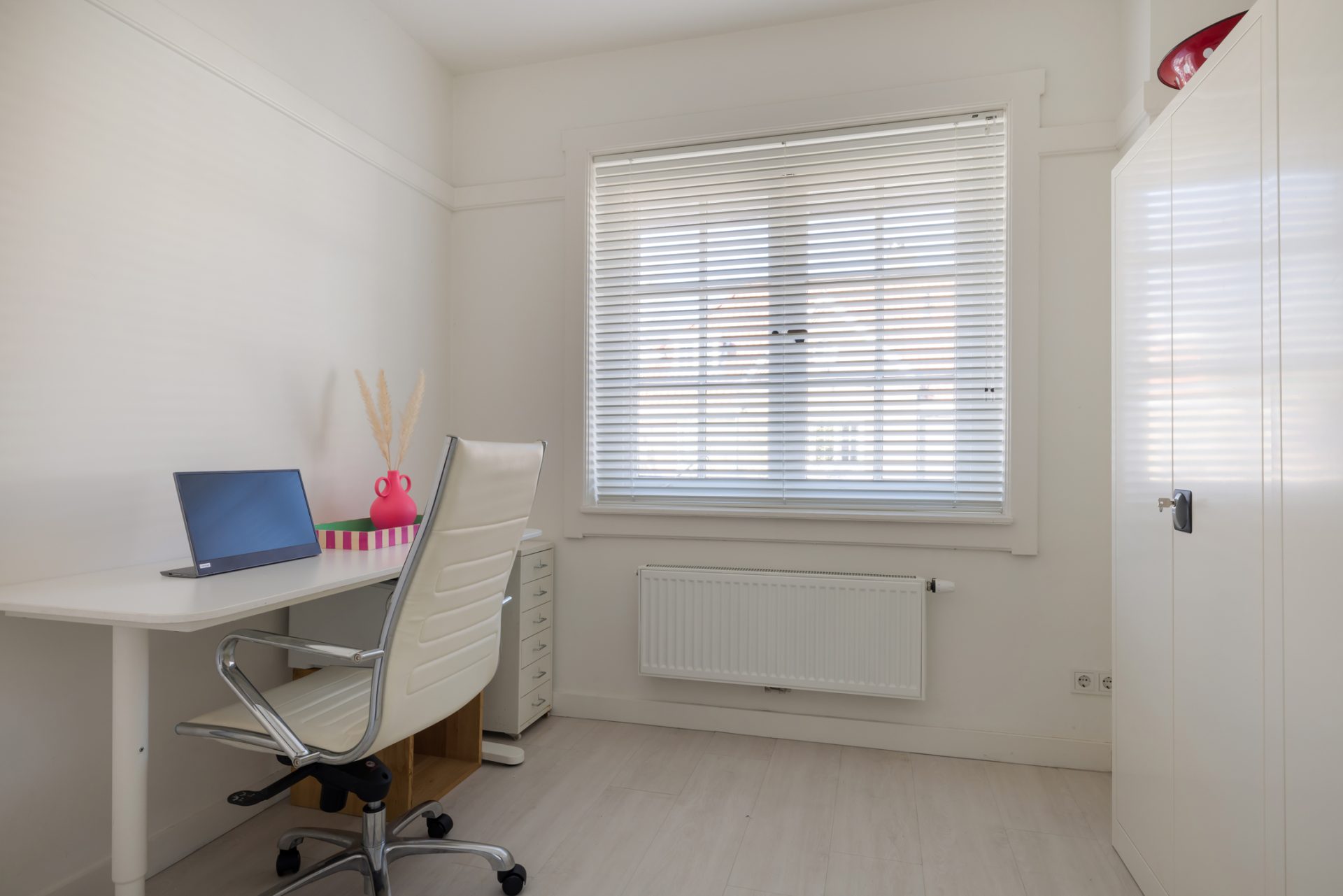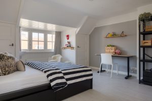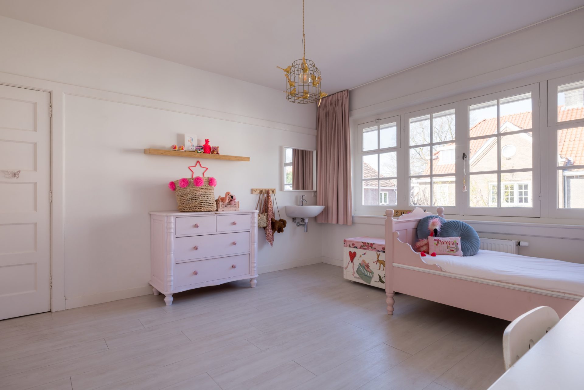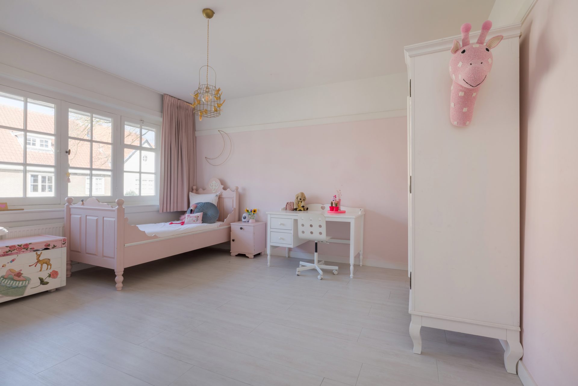 De grote slaapkamer aan de voorzijde, uitgevoerd in een subtiele lichtroze tint, is in gebruik als royale kinderkamer. Aangrenzend bevindt zich een kleinere slaapkamer, momenteel ingericht als werkkamer.