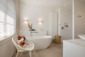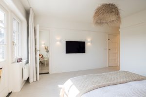 Niet alleen de begane grond, maar ook de eerste verdieping is het toonbeeld van luxe en sfeer. Aan de achterzijde ligt de master bedroom, met kleedruimte en directe toegang tot de badkamer. Het mooi vormgegeven bad, de inloopdouche en het meubel met twee wastafels vormen samen een fraai geheel. Naast de badkamer is een separate toiletruimte, uitgevoerd in dezelfde stijl.