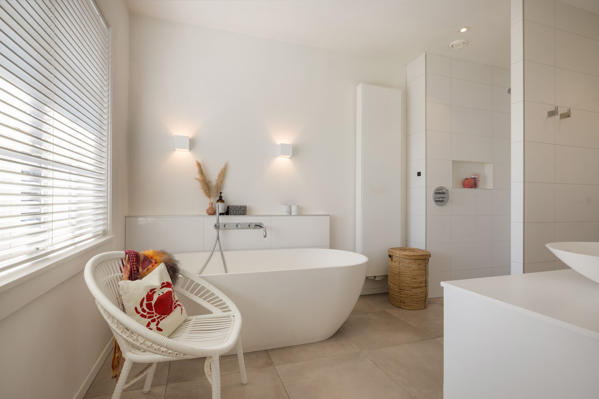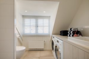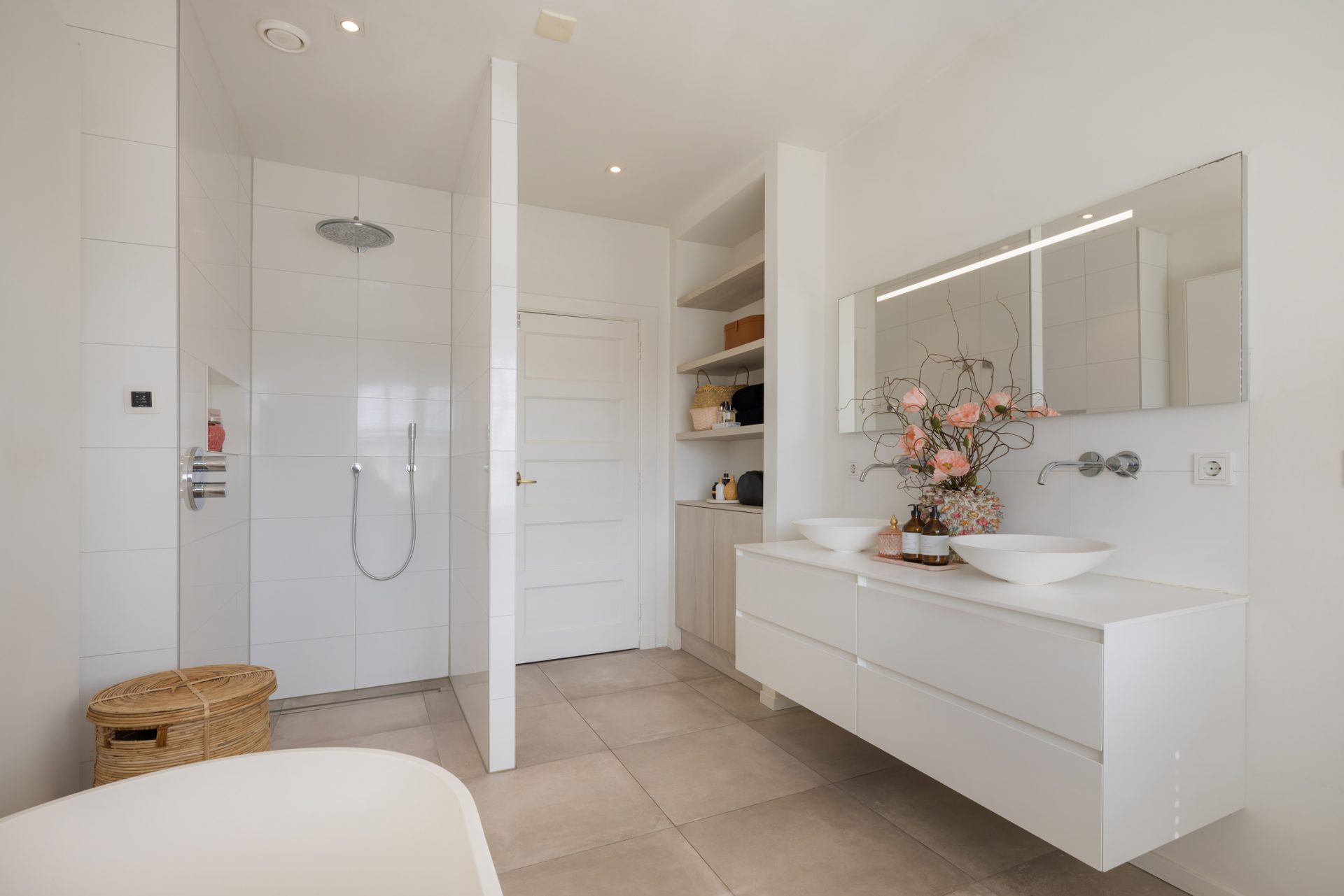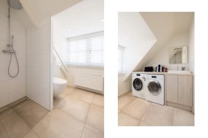 De badkamer op deze verdieping is ingedeeld met een inloopdouche, een derde toilet en een wastafel. De wastafel vormt een geheel met een maatwerkmeubel, met ruimte voor wasmachine en droger.