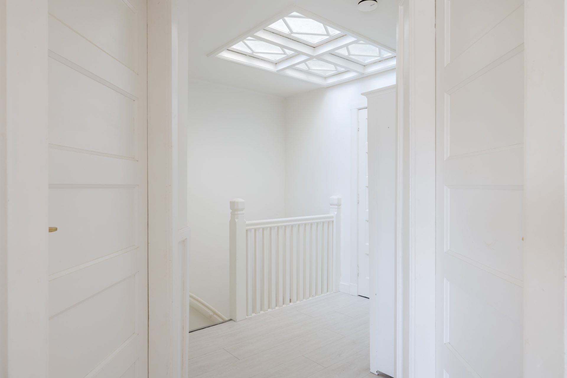 Een sierlijke, authentieke lichtstraat in het plafond zorgt voor veel natuurlijke lichtinval op de overloop en bij de trap, tot aan de eerste verdieping. Vanaf de overloop is er toegang tot drie slaapkamers en een badkamer. Alle kamers zijn voorzien van een dakkapel en er zijn vaste kasten in de schuinten van het dak. Vanuit één van de kamers is er toegang tot de vliering, die een zee aan extra bergruimte biedt.